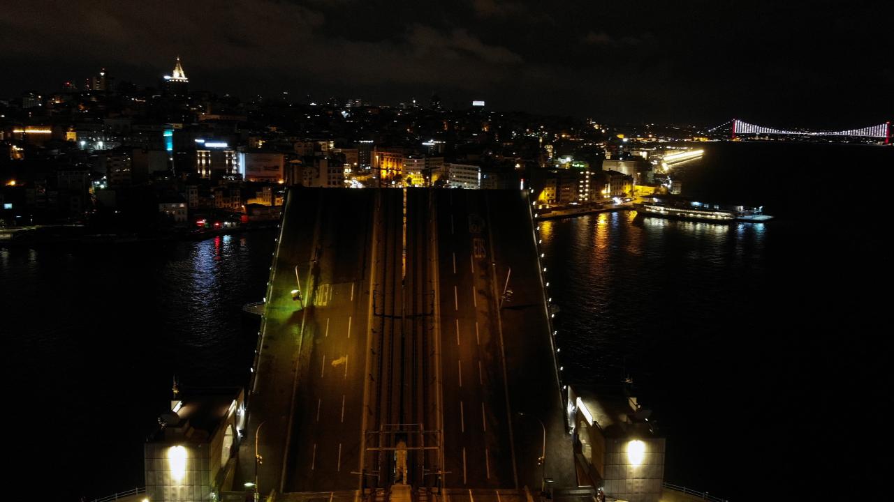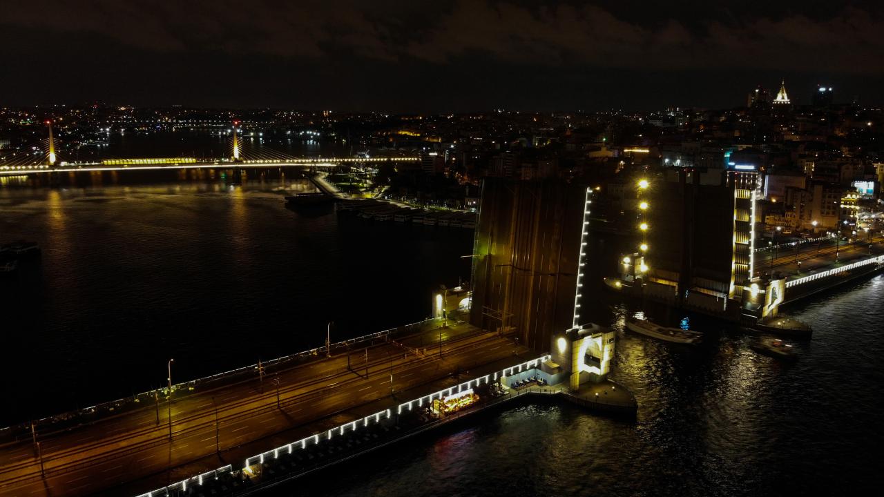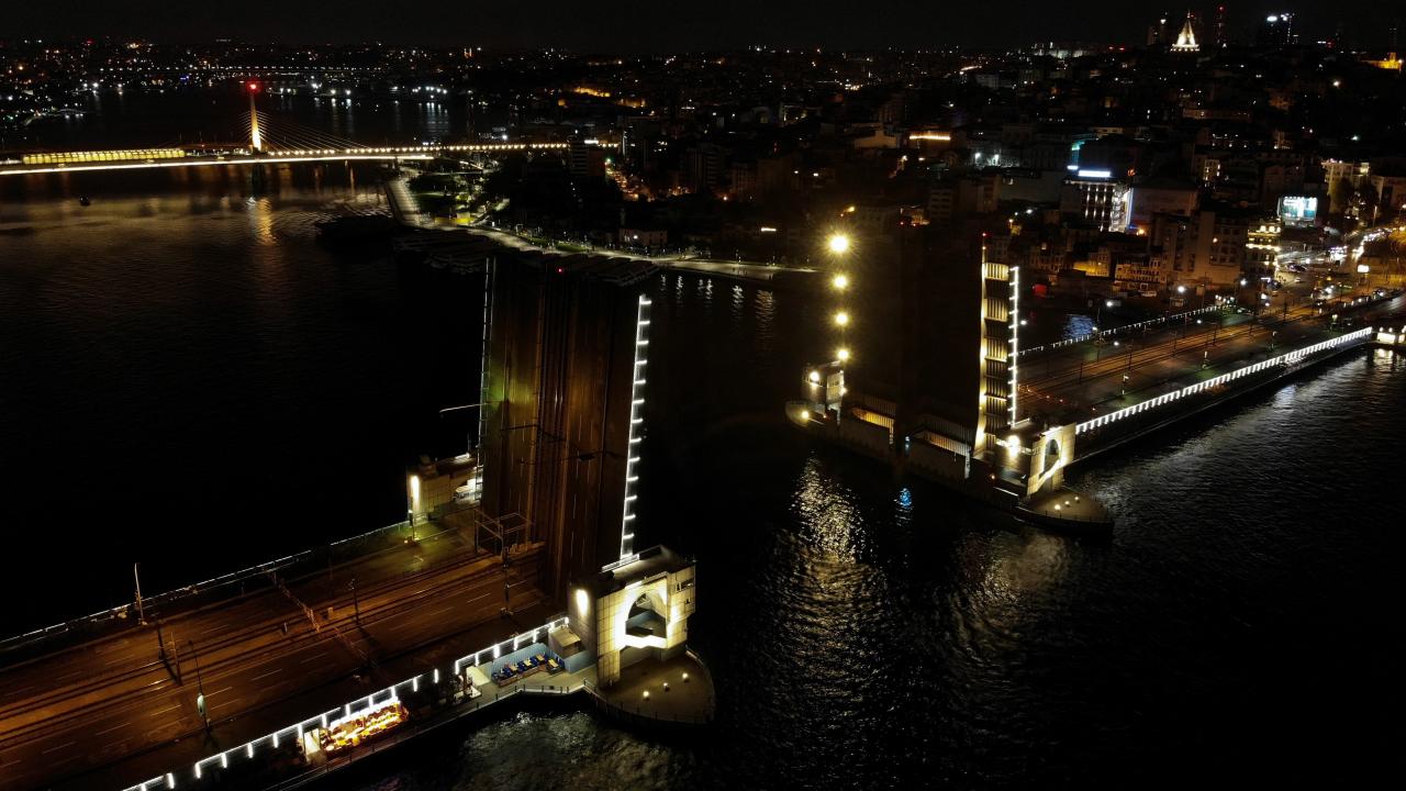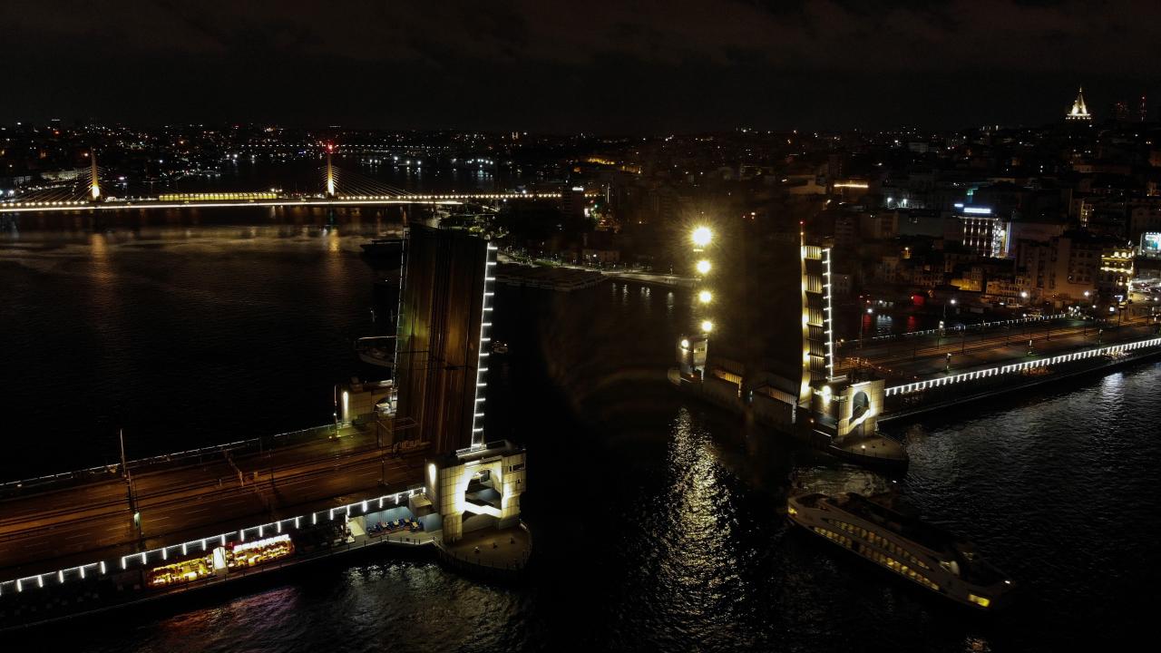 Galata Köprüsü gece gemi geçişleri için deniz trafiğine açıldı. Havadan görüntülenen o anlar, tarihi yarımada manzarasıyla renkli görüntüler oluşturdu.