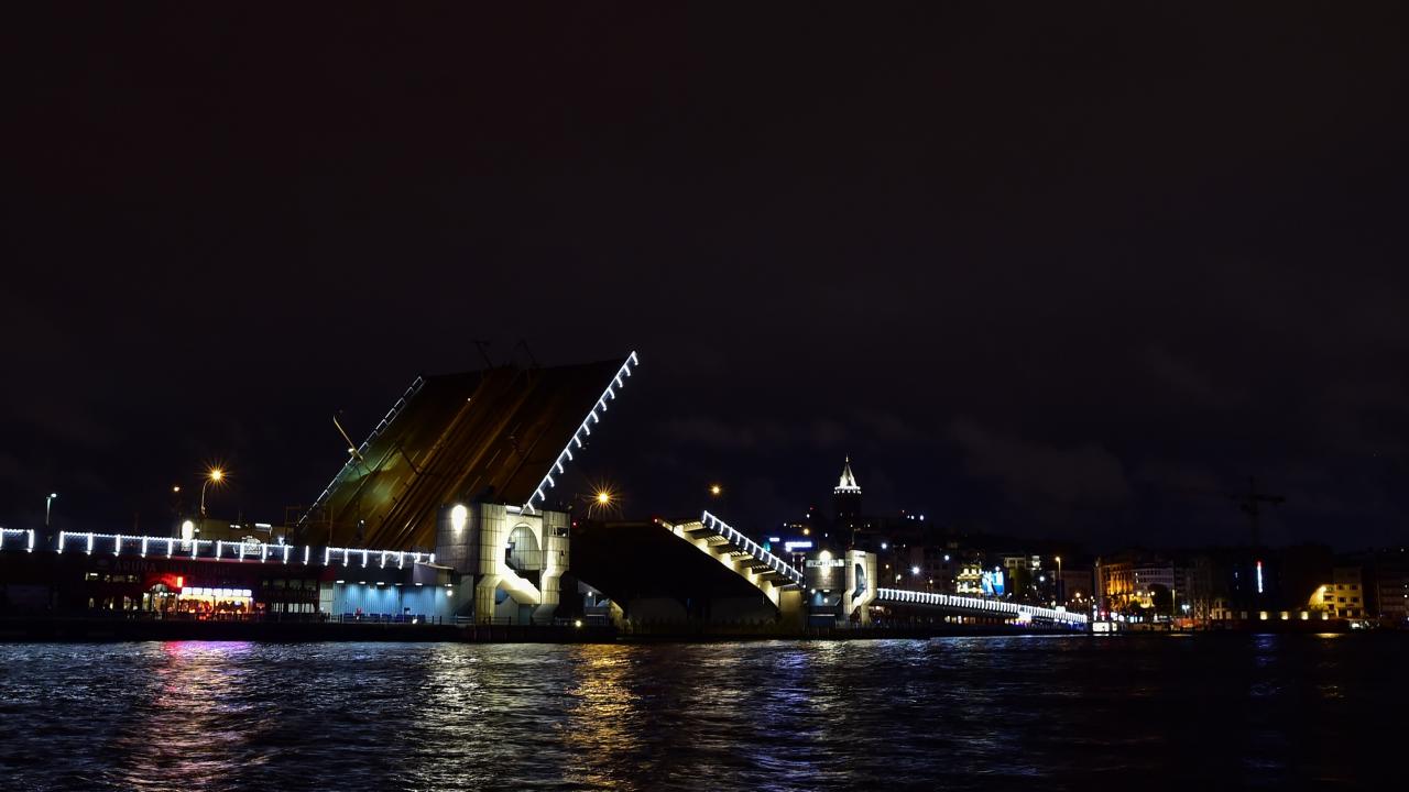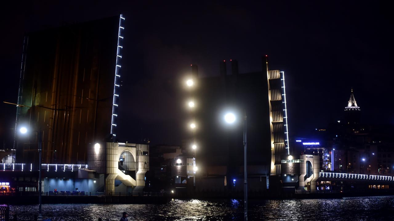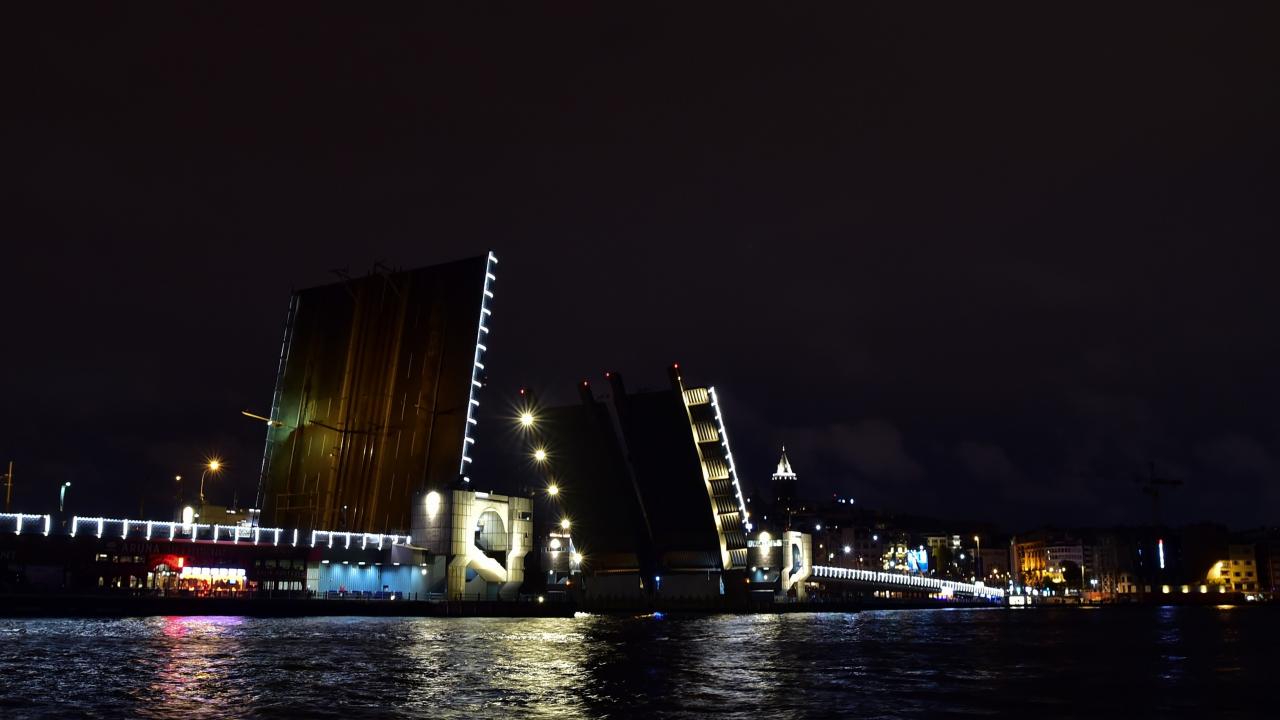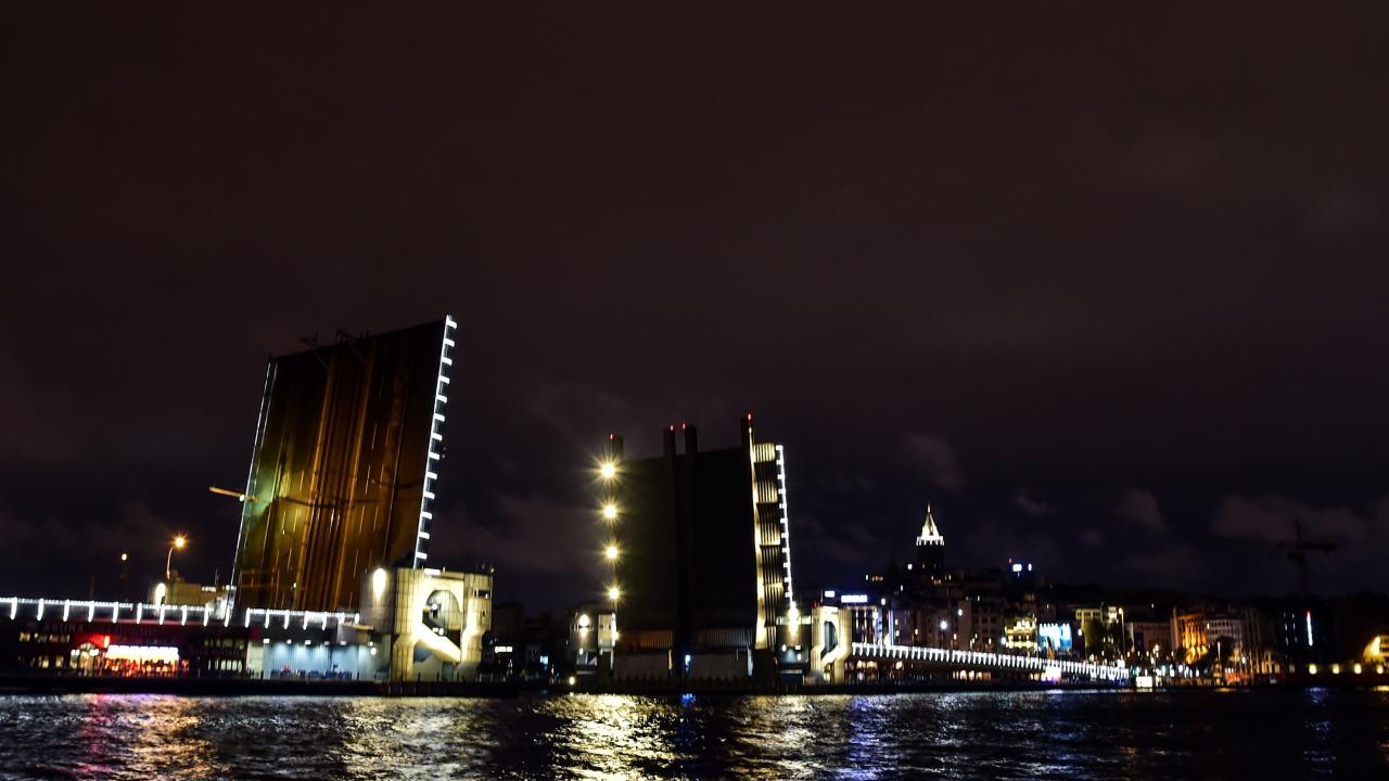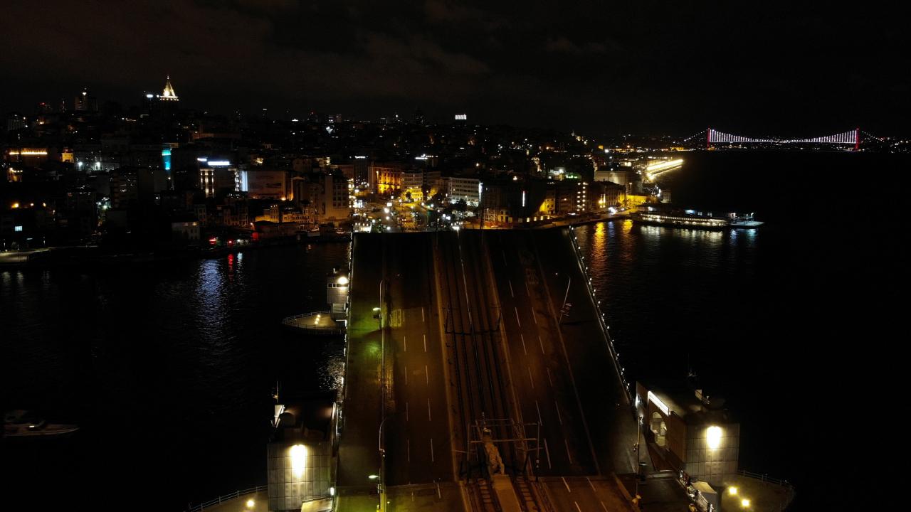 Galata Köprüsü gece gemi geçişleri için deniz trafiğine açıldı. Havadan görüntülenen o anlar, tarihi yarımada manzarasıyla renkli görüntüler oluşturdu.