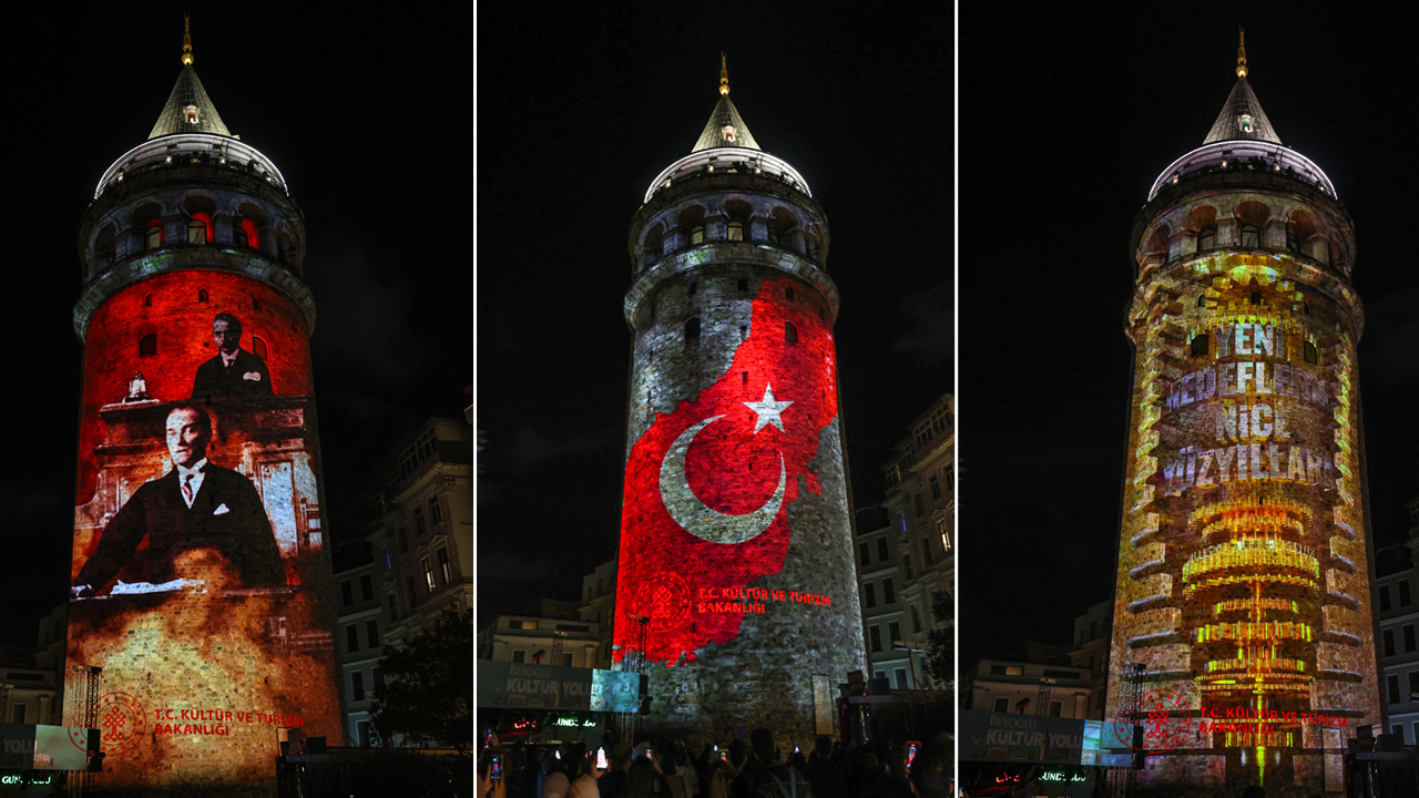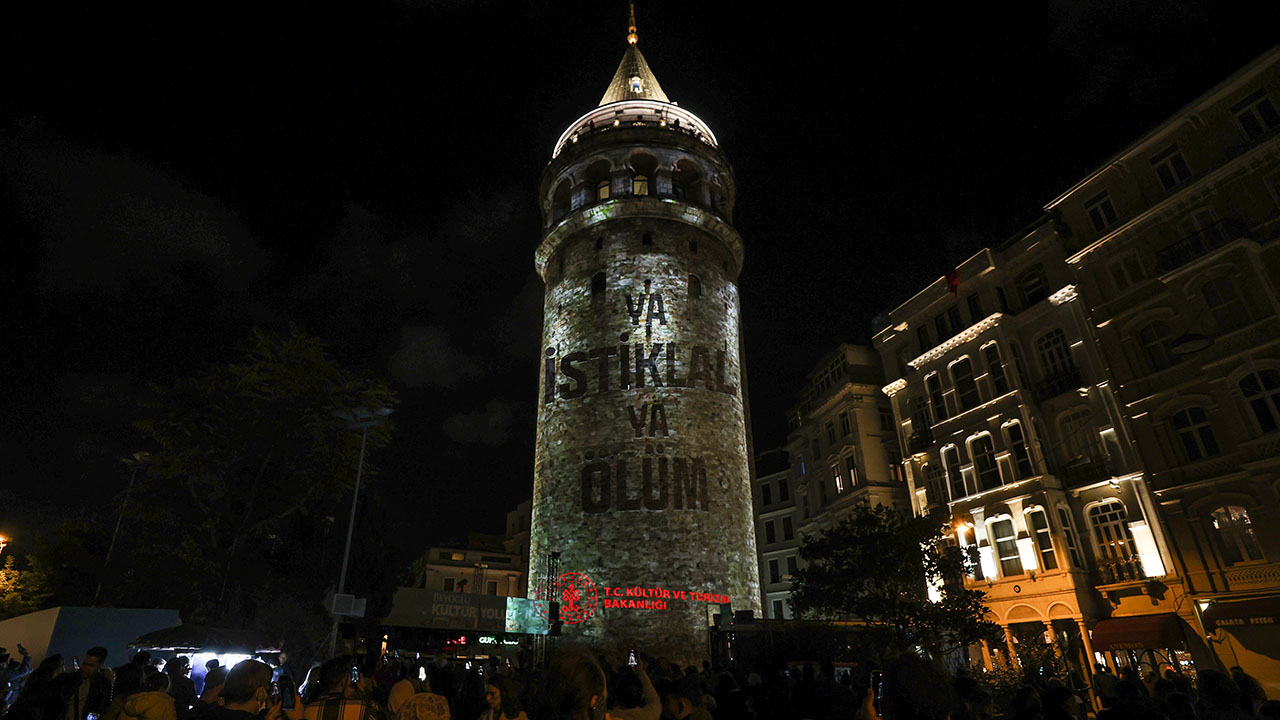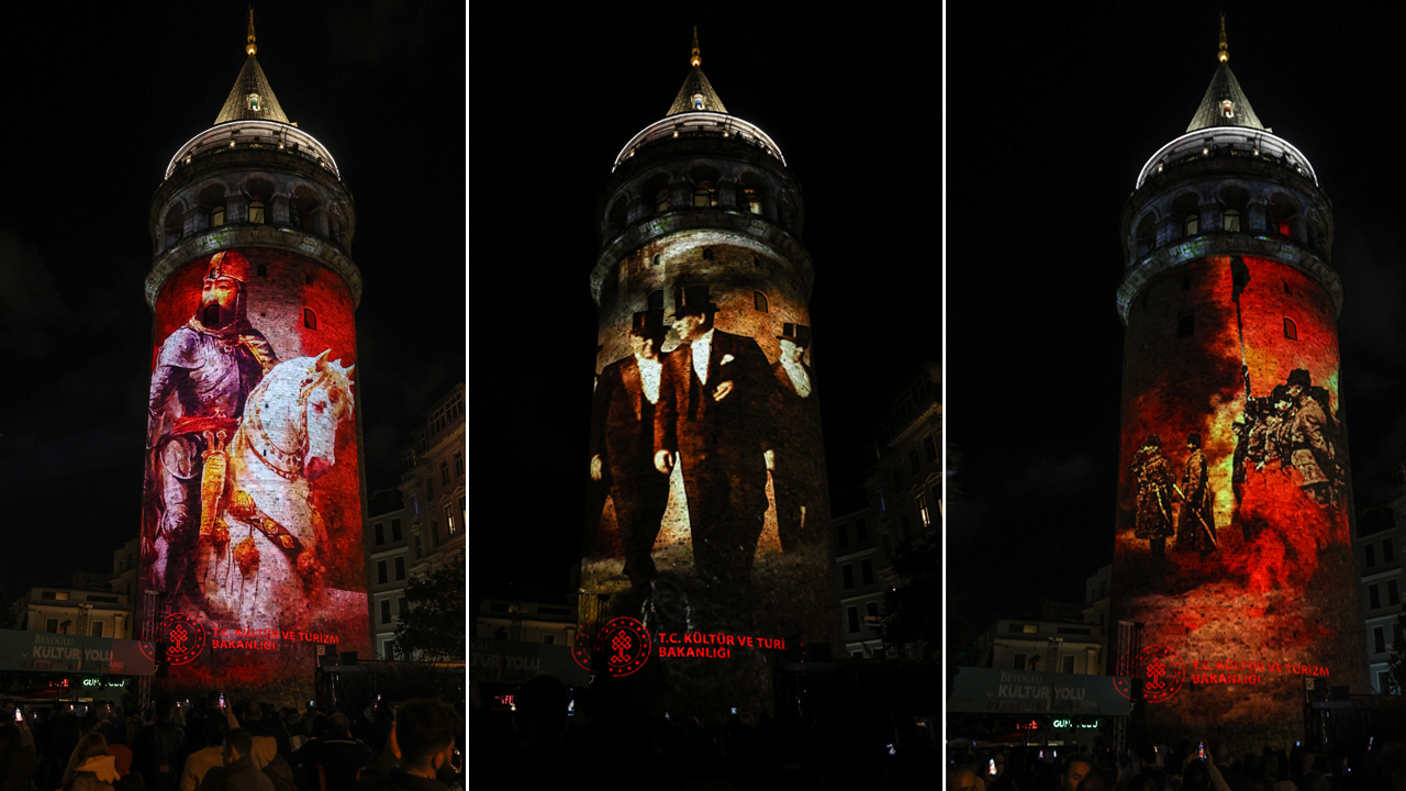 Galata Kulesi`ne, Gazi Mustafa Kemal Atatürk`ün Bandırma vapuruna binişiyle başlayan, İstiklal Harbi boyunca Mustafa Kemal ve silah arkadaşlarının yanı sıra kadınıyla erkeğiyle, genciyle yaşlısıyla verilen büyük mücadeleyi anlatan görseller, Kültür Varlıkları ve Müzeler Genel Müdürlüğünce özel olarak hazırlanan metin eşliğinde aktarıldı.