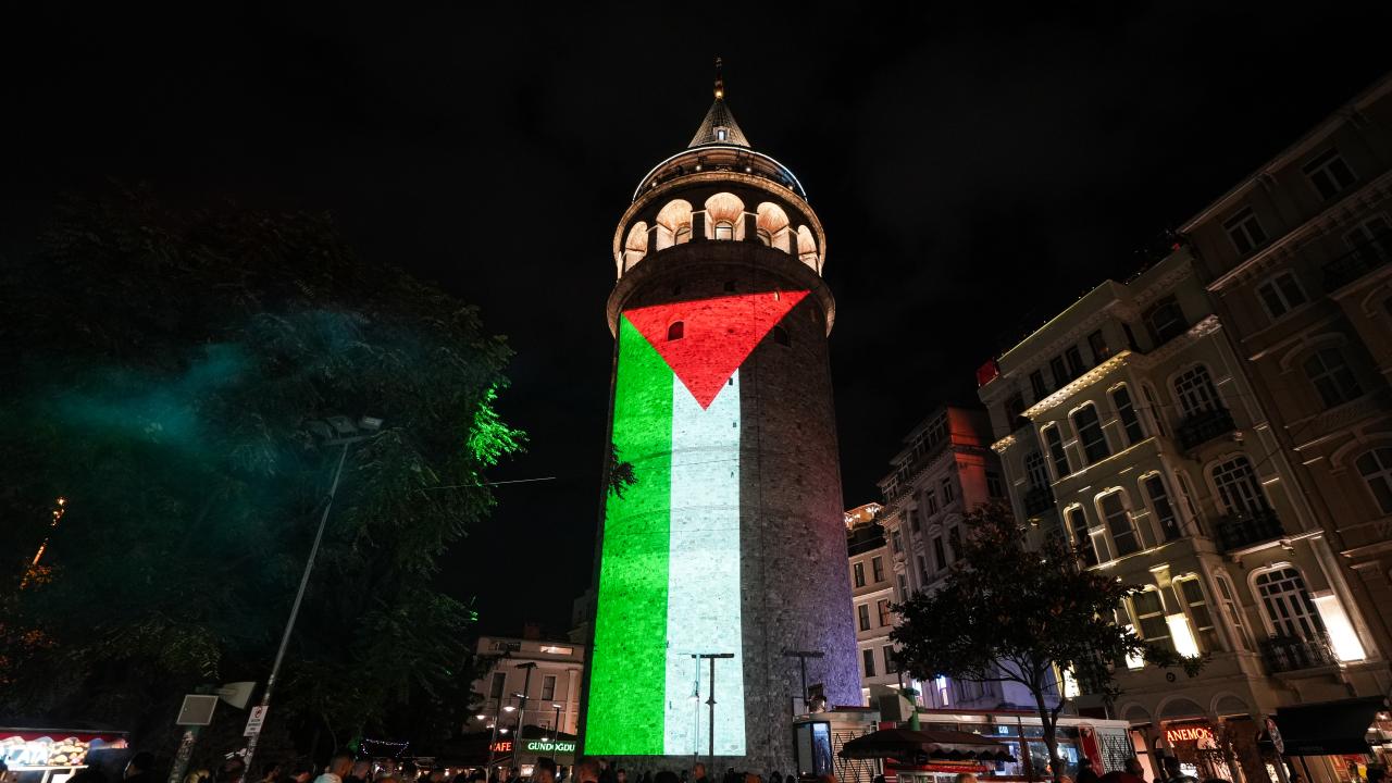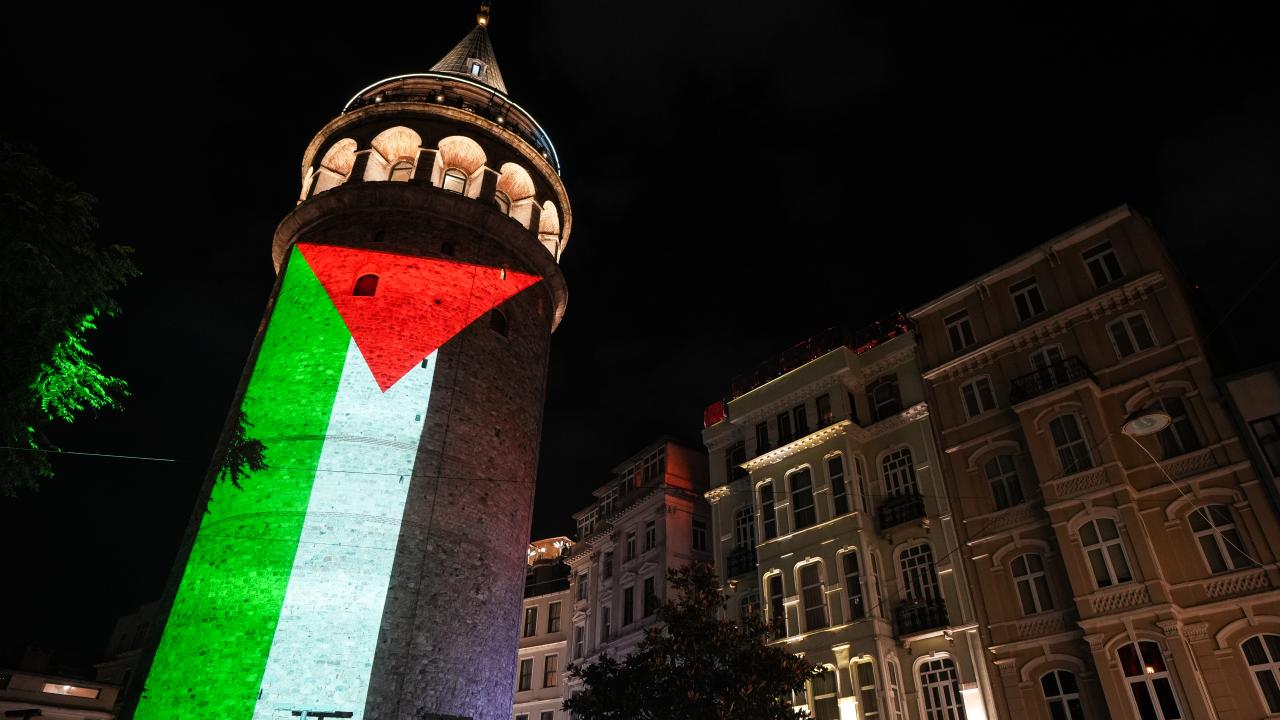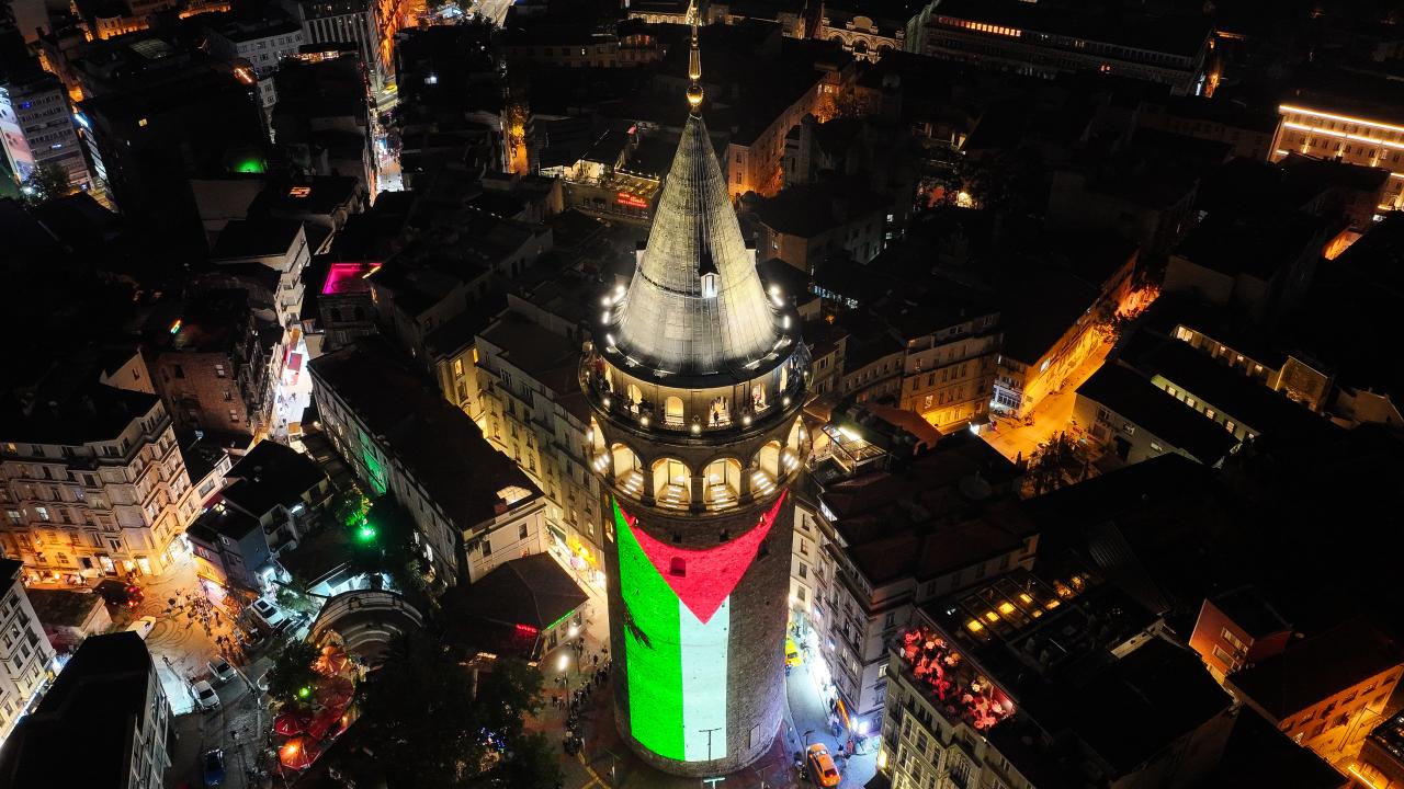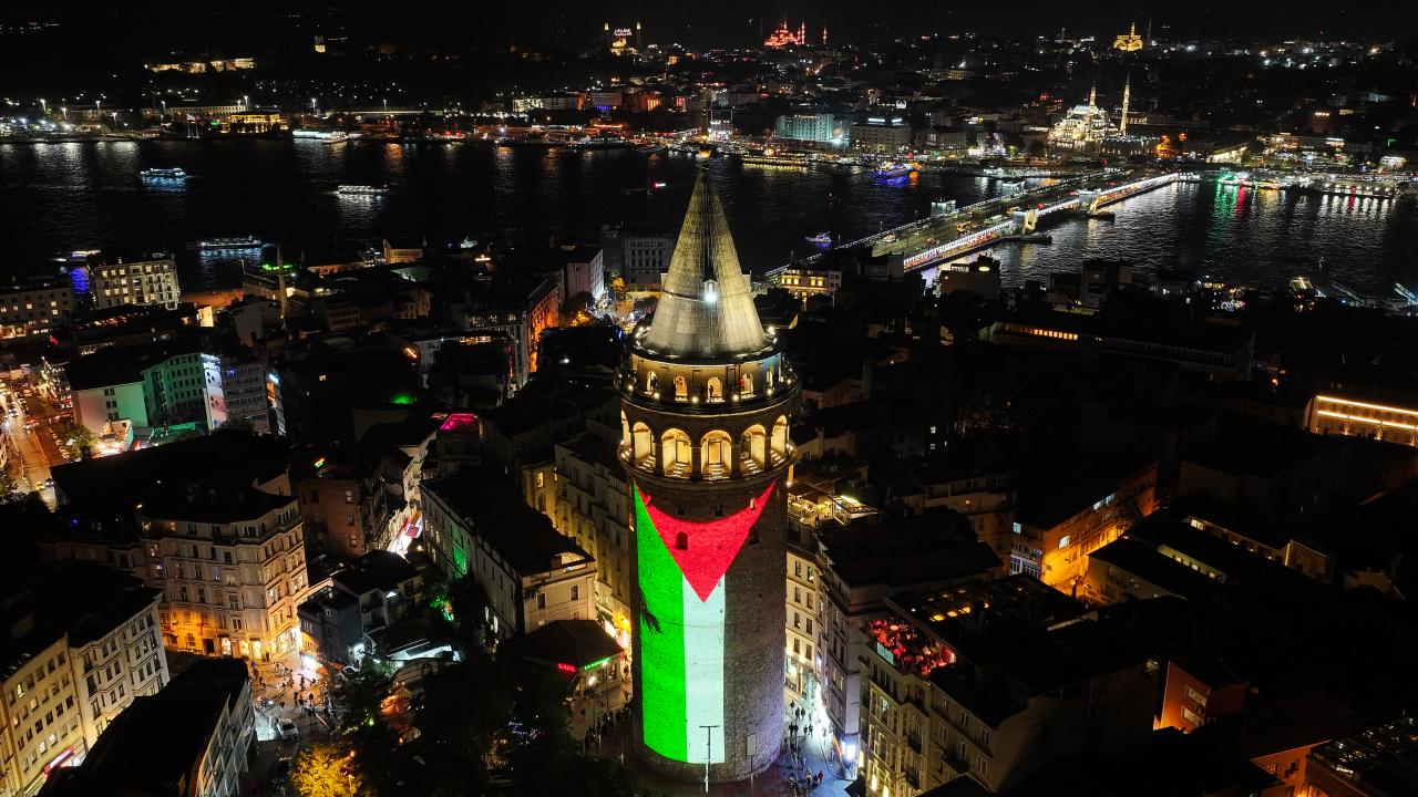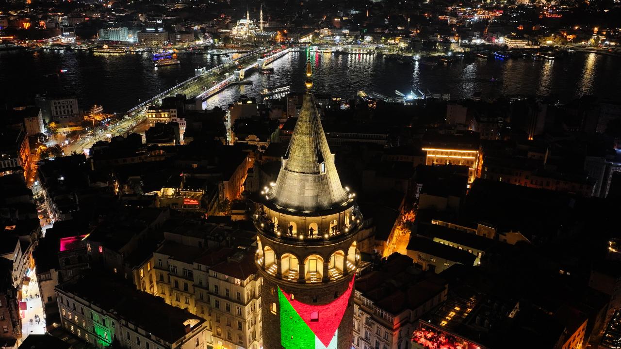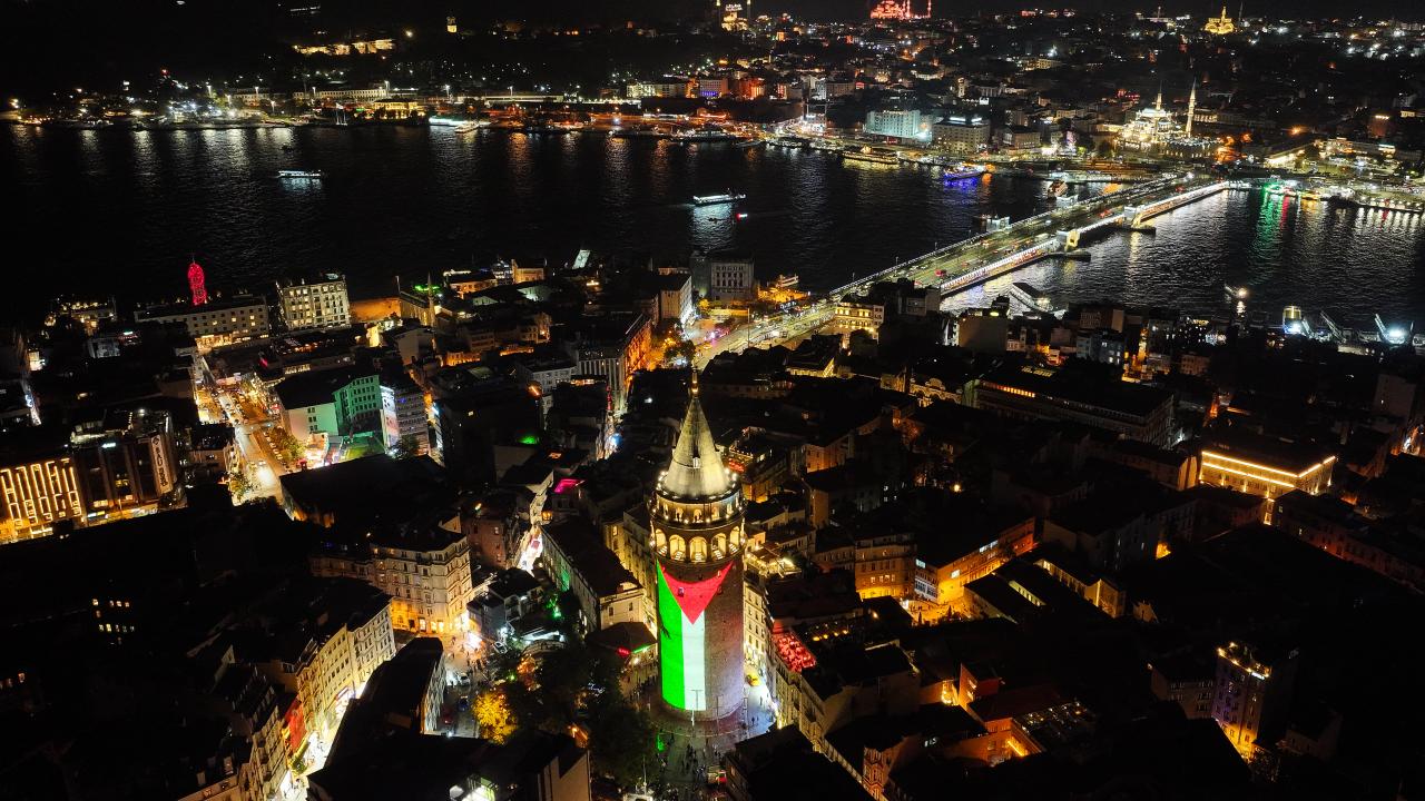 Kültür ve Turizm Bakanlığınca, Filistin’de yaşanan soykırıma dikkat çekmek amacıyla Galata Kulesi’ne Filistin bayrağı yansıtıldı.