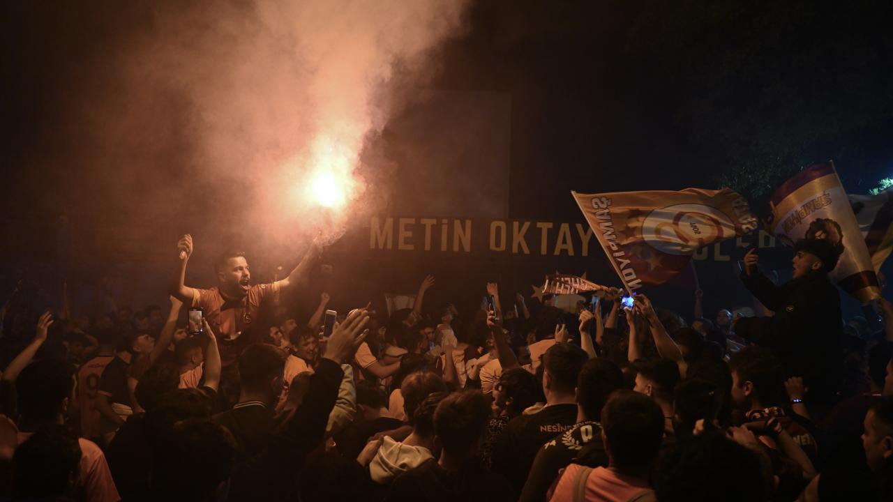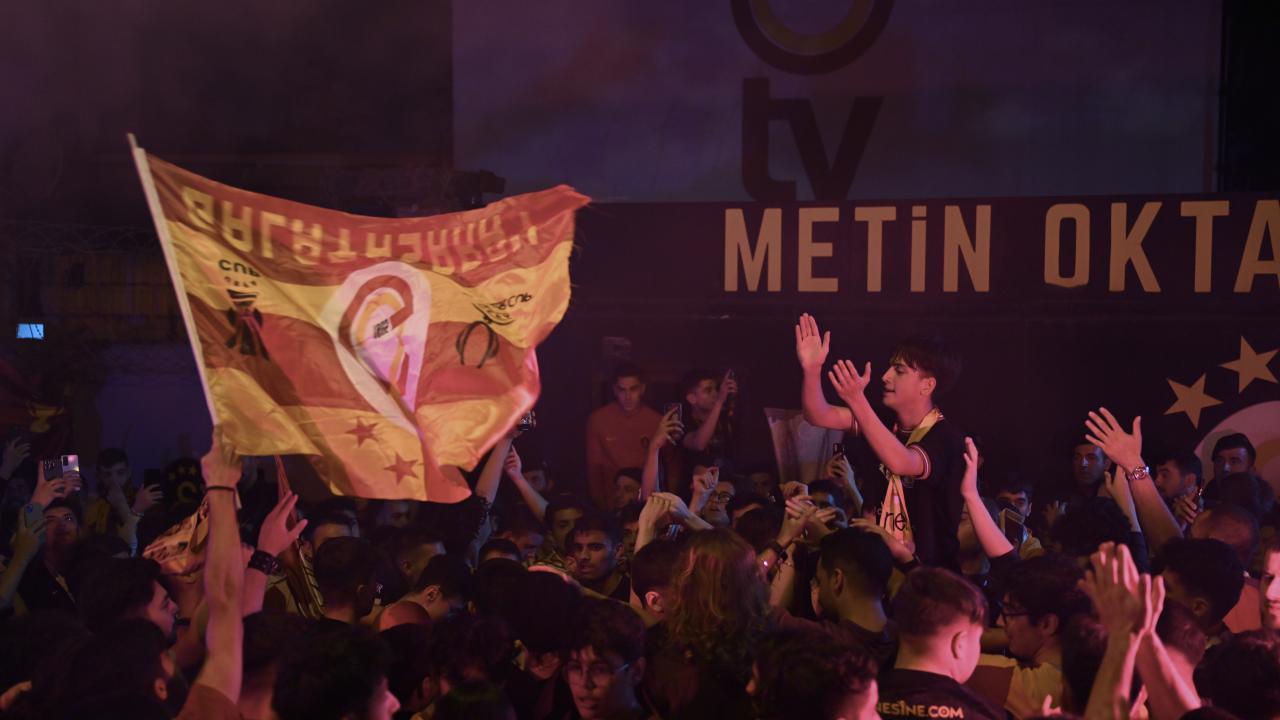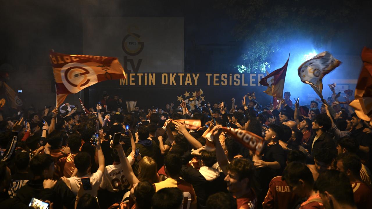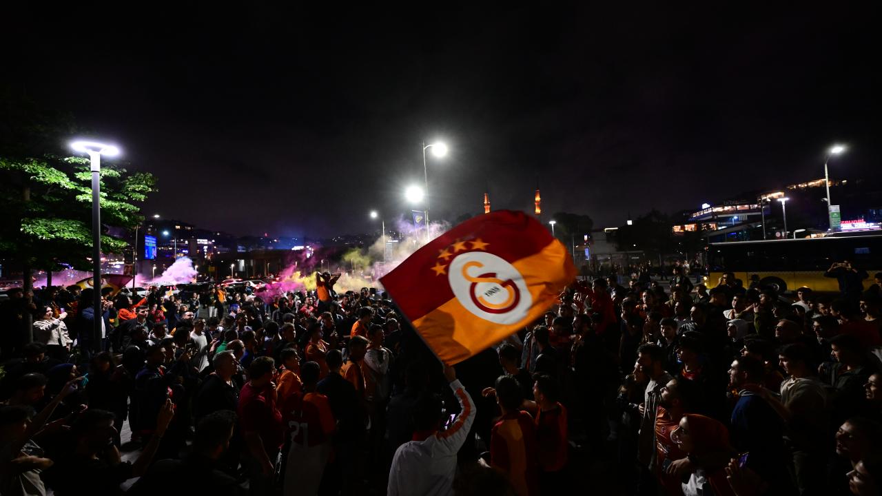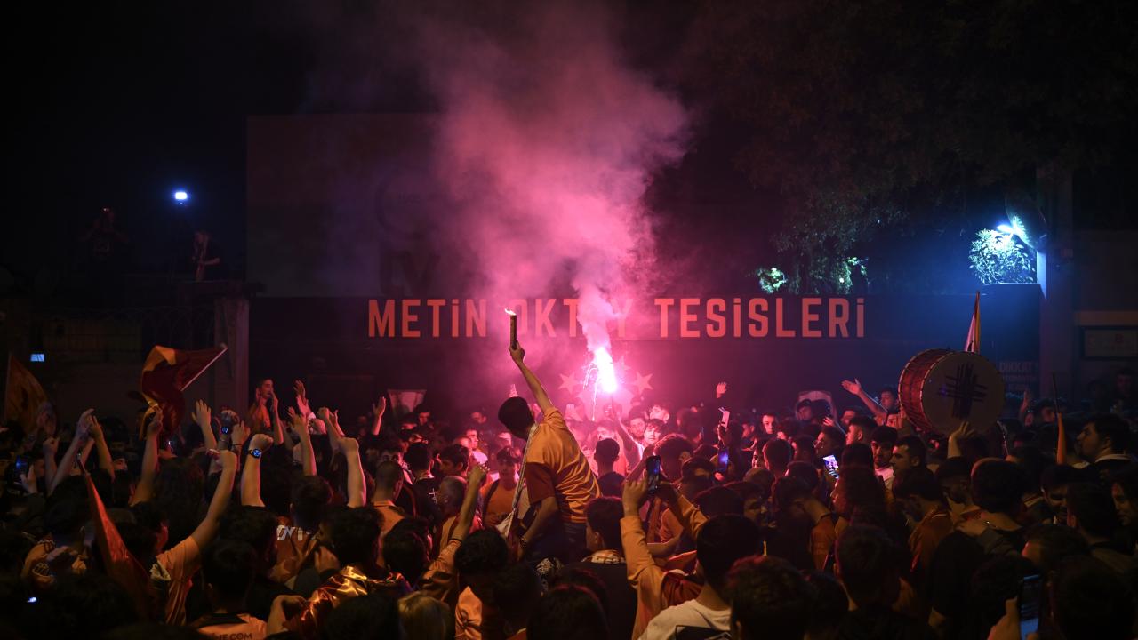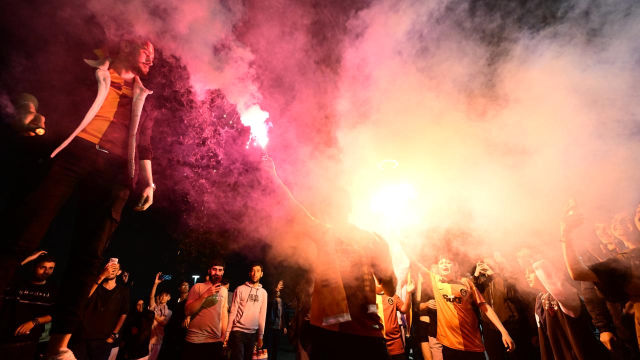 Meşaleler yakarak şampiyonluk coşkusunu doyasıya yaşayan taraftarlar, teknik direktör Okan Buruk ve futbolcular lehine tezahürat yaptı.