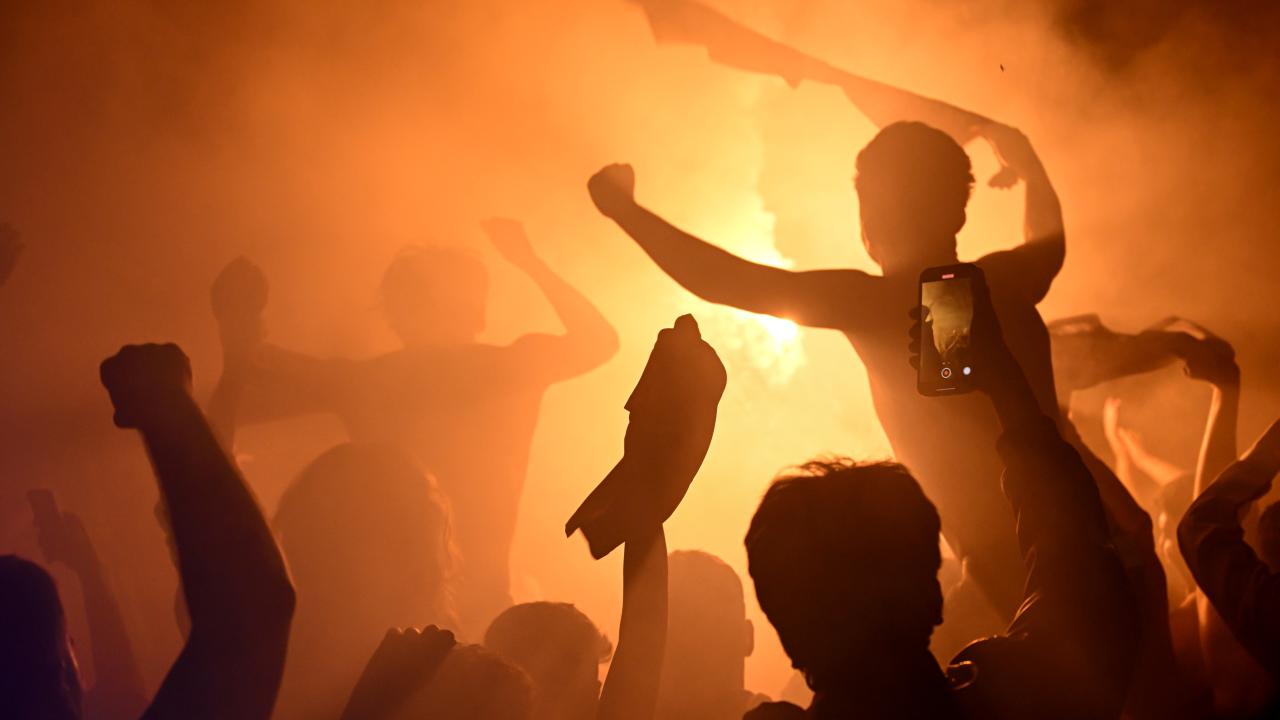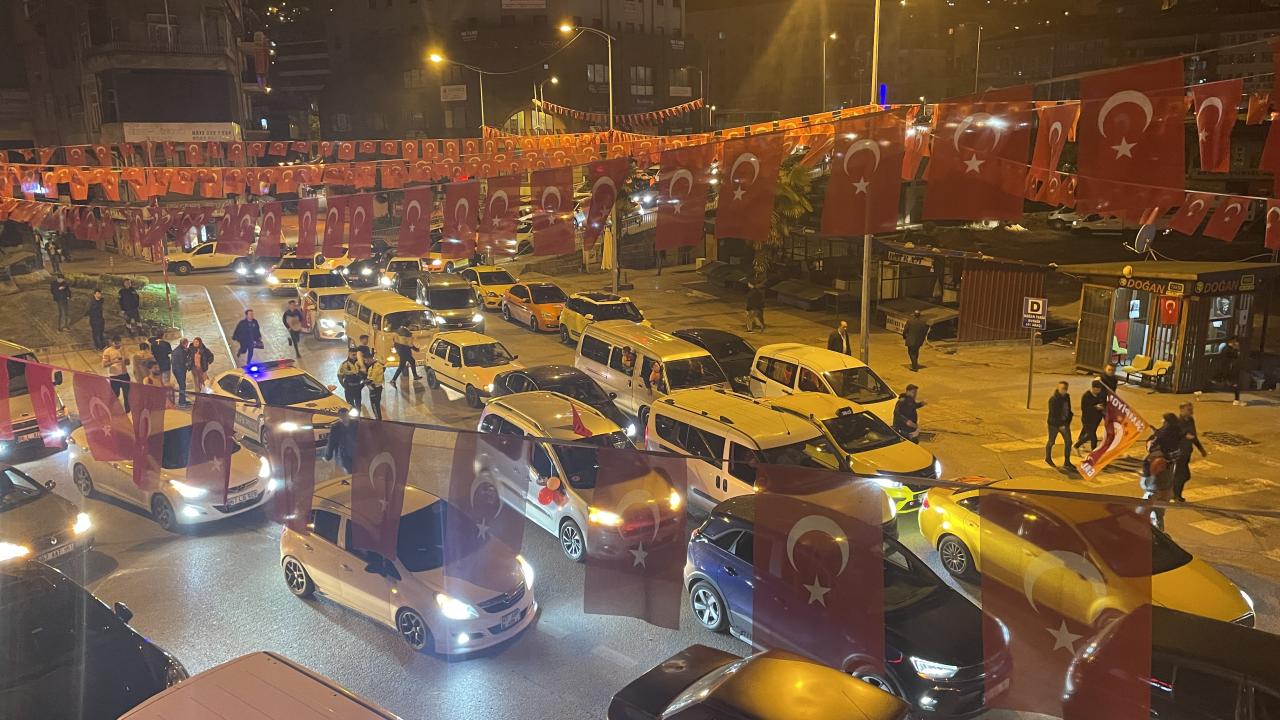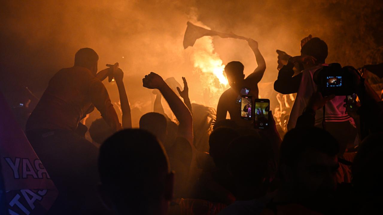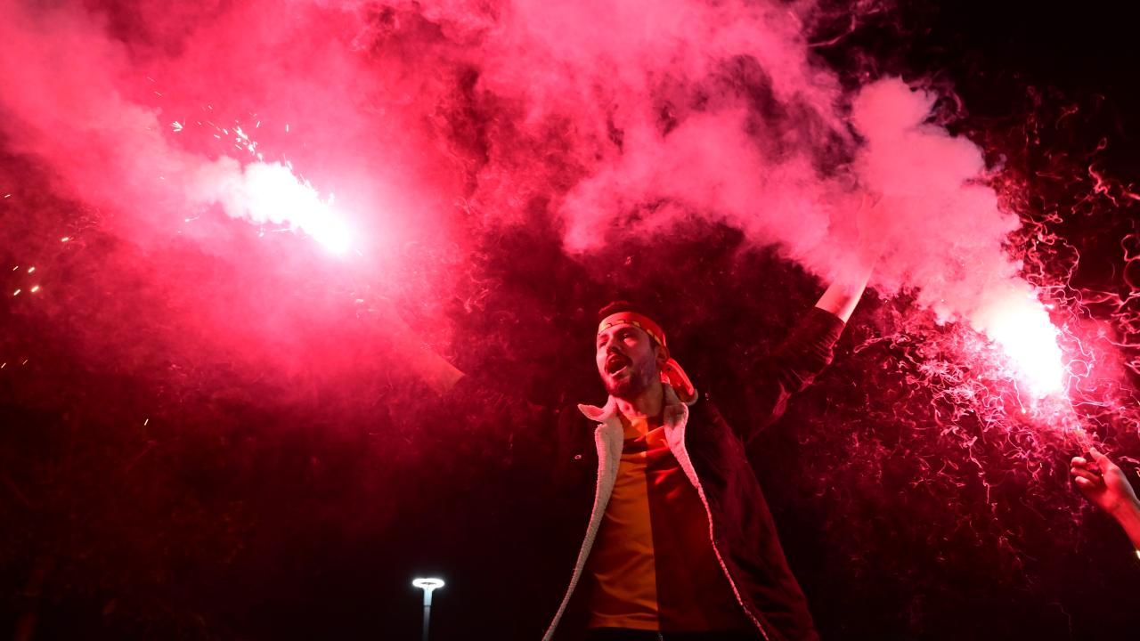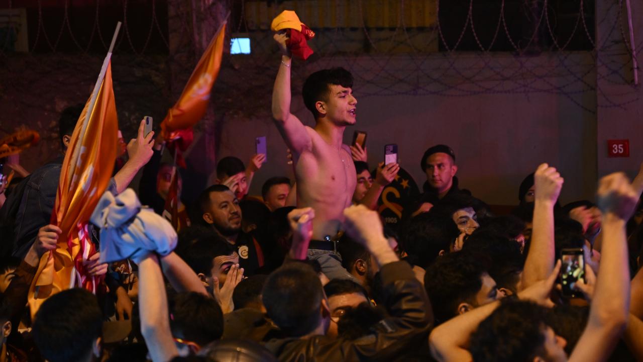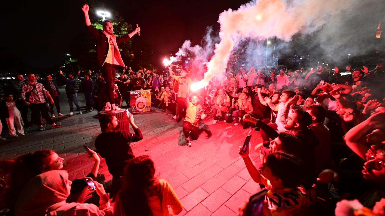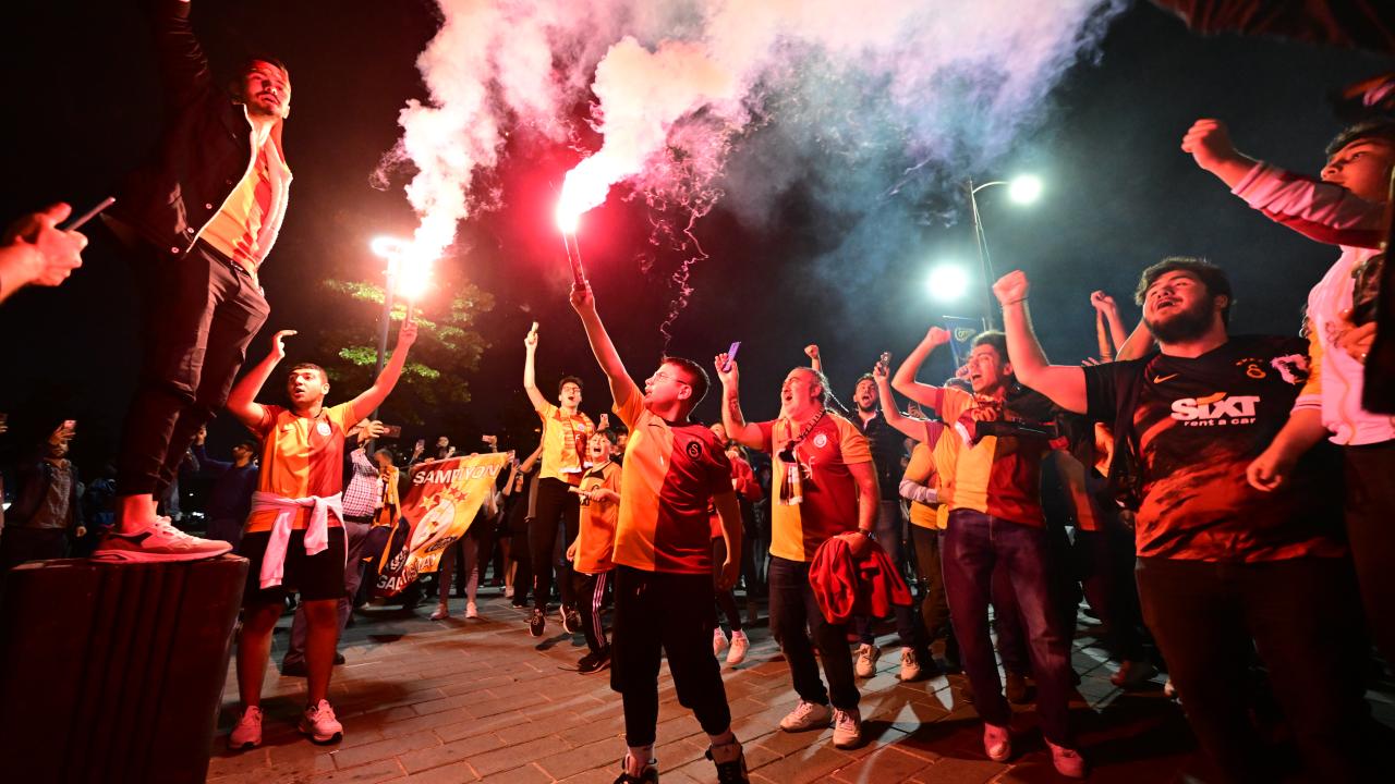 Meşaleler yakarak şampiyonluk coşkusunu doyasıya yaşayan taraftarlar, teknik direktör Okan Buruk ve futbolcular lehine tezahürat yaptı.