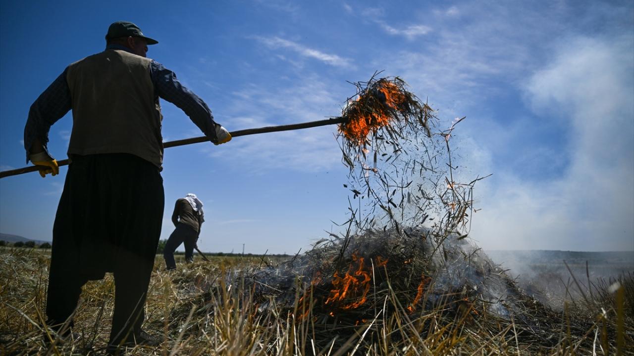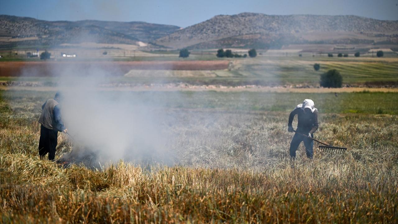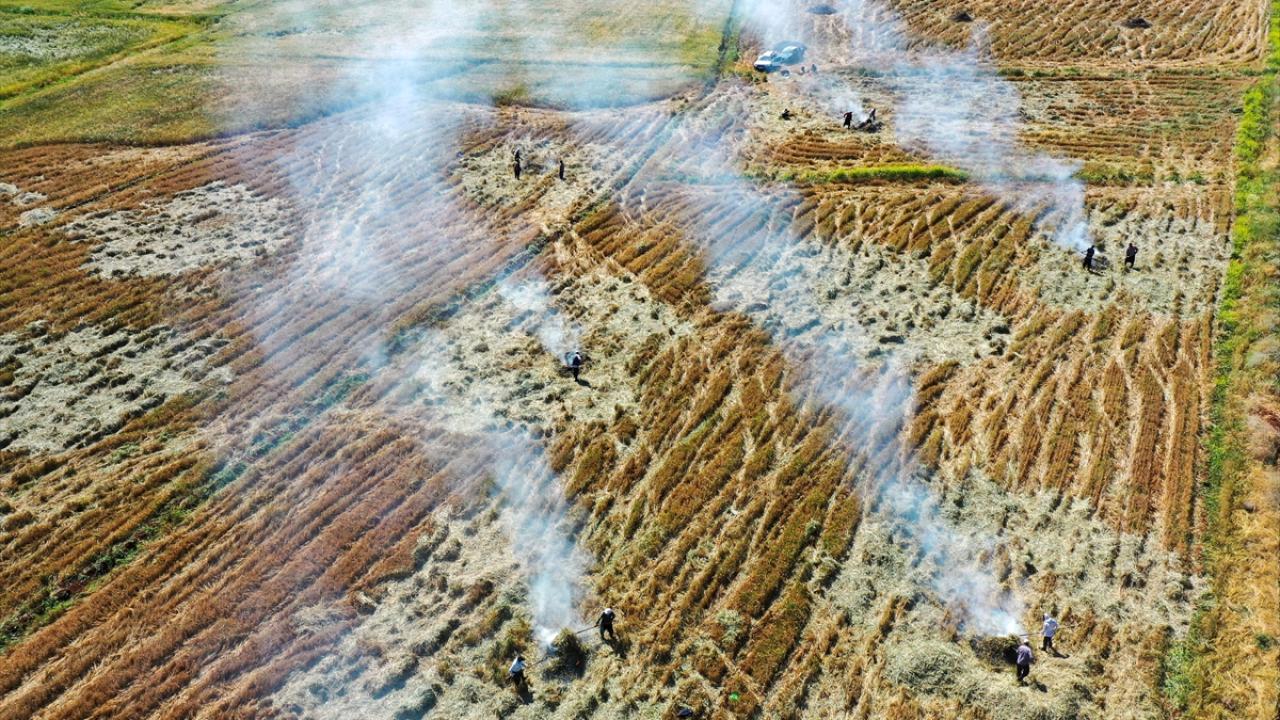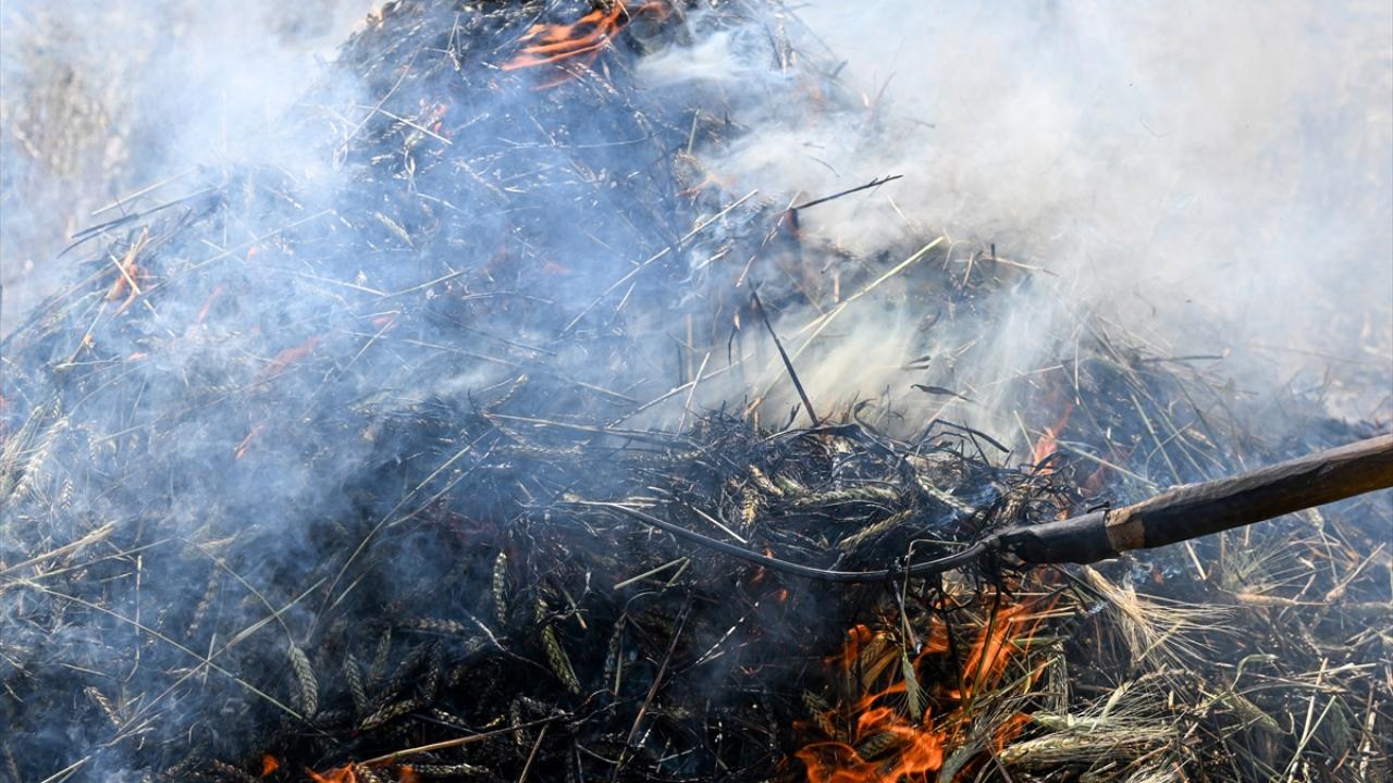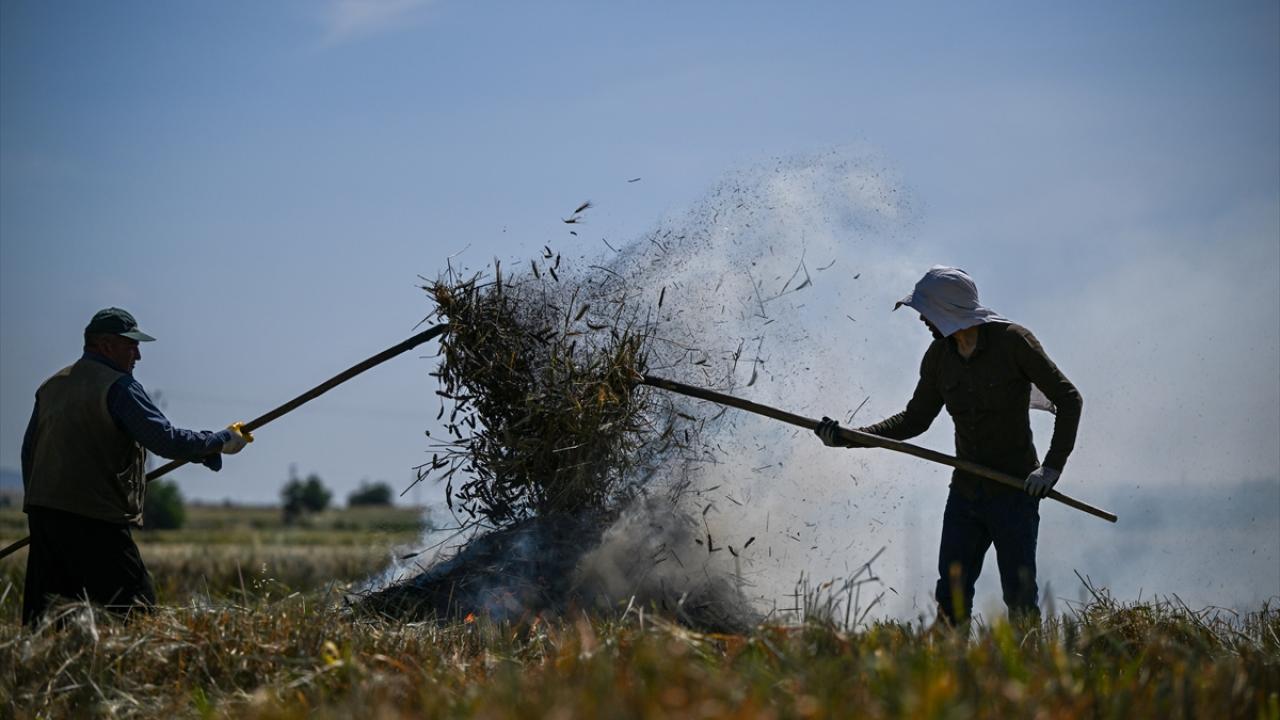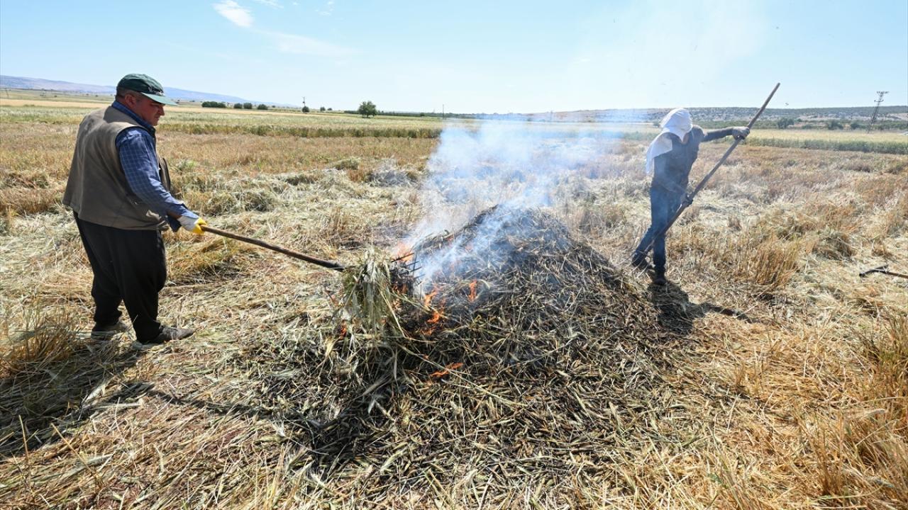 Hava sıcaklığının zaman zaman 35 dereceleri gördüğü tarlada çalışan çiftçiler, küçük yığınlar halinde topladıkları başakları, bir gün kurumaya bıraktıktan sonra ateşle kavuruyor.