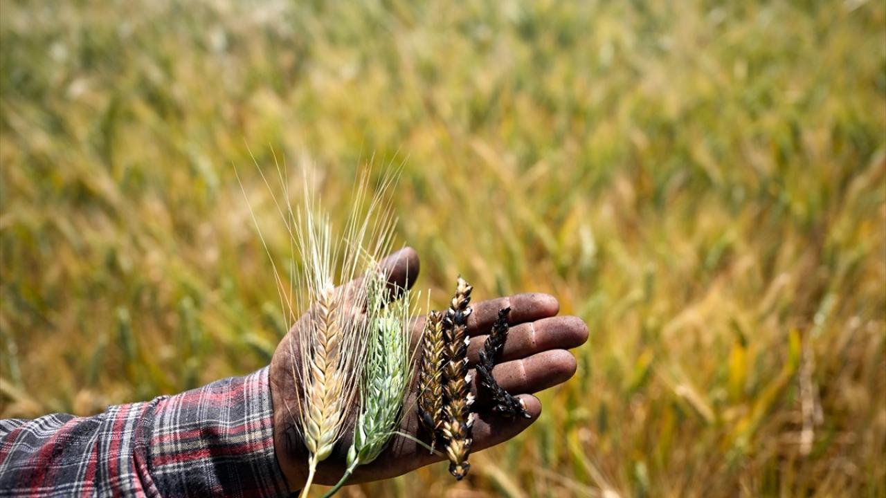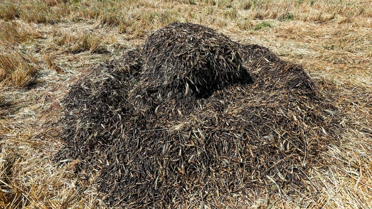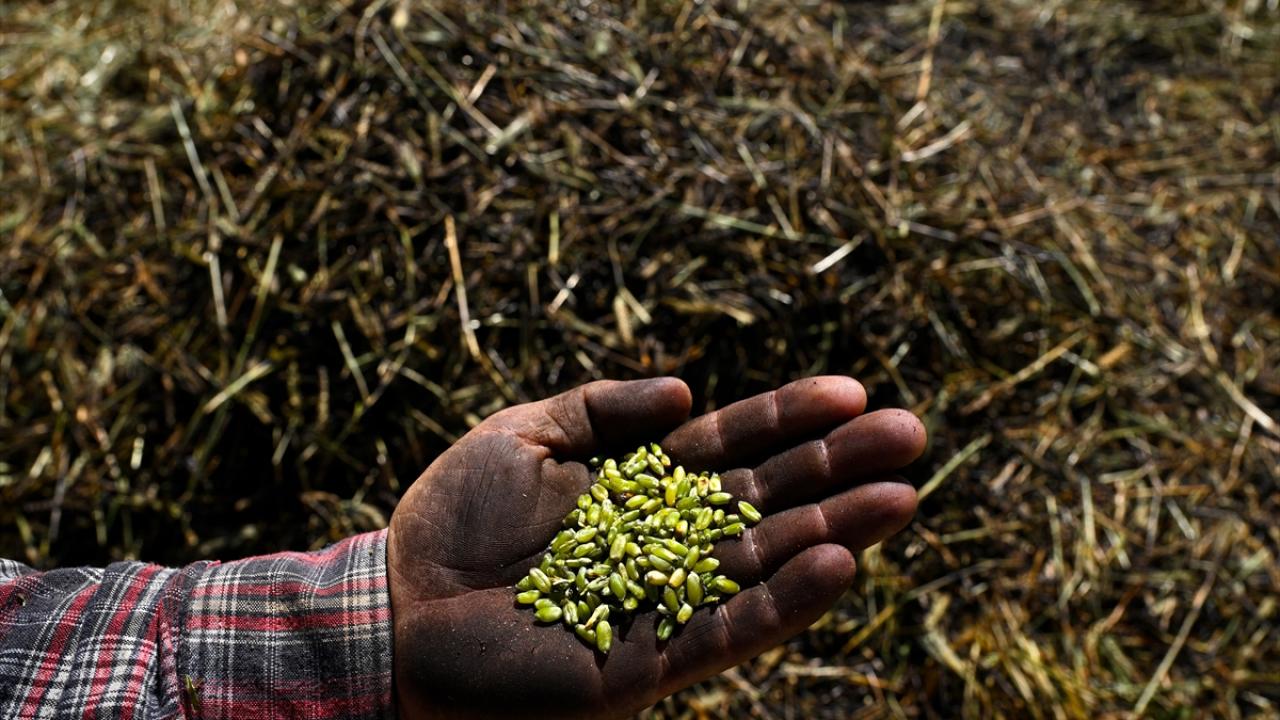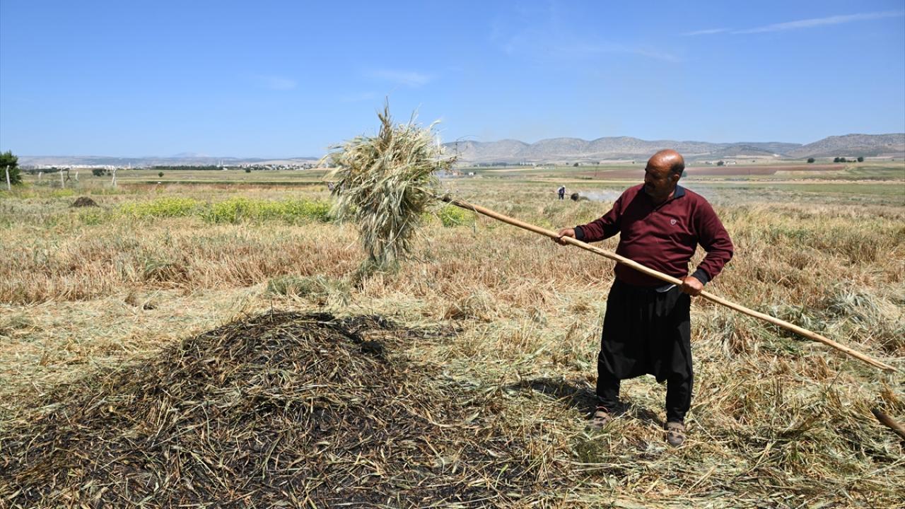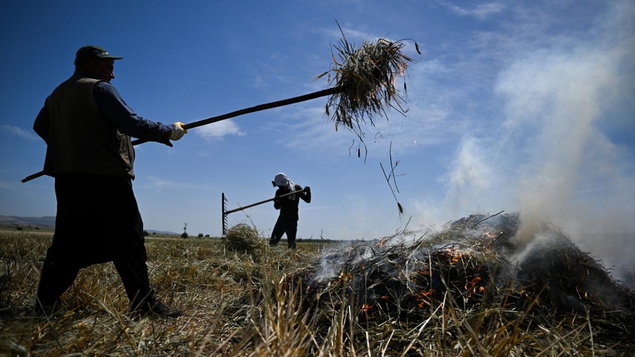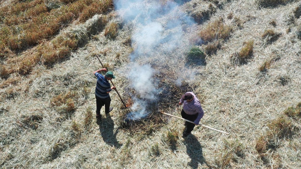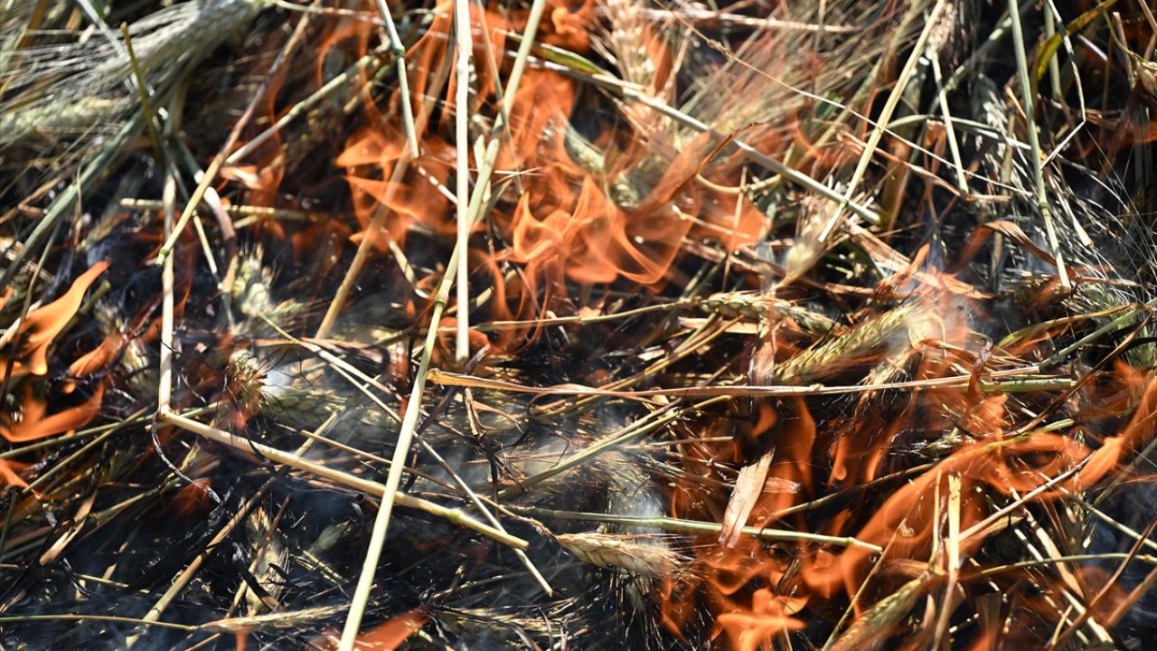 Hava sıcaklığının zaman zaman 35 dereceleri gördüğü tarlada çalışan çiftçiler, küçük yığınlar halinde topladıkları başakları, bir gün kurumaya bıraktıktan sonra ateşle kavuruyor.