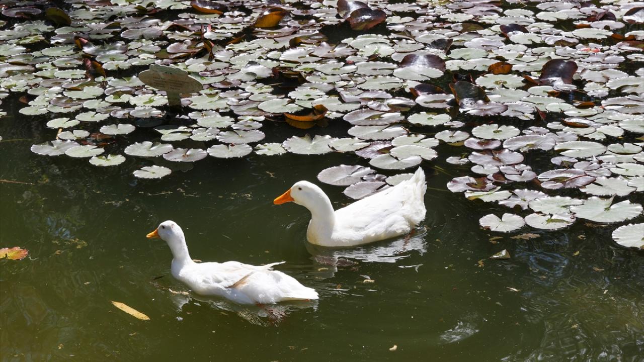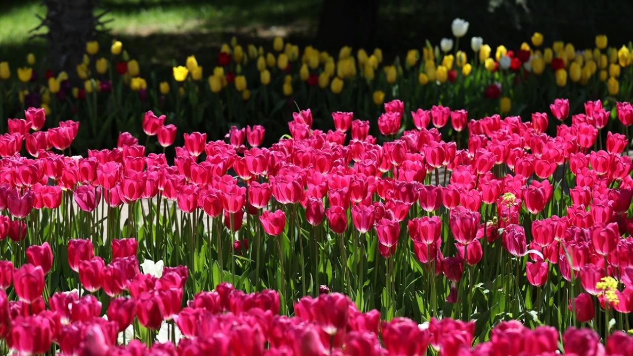 Yapay gölet ve şelalenin de bulunduğu bahçede, ilkbaharla birlikte renk cümbüşü yaşanıyor.