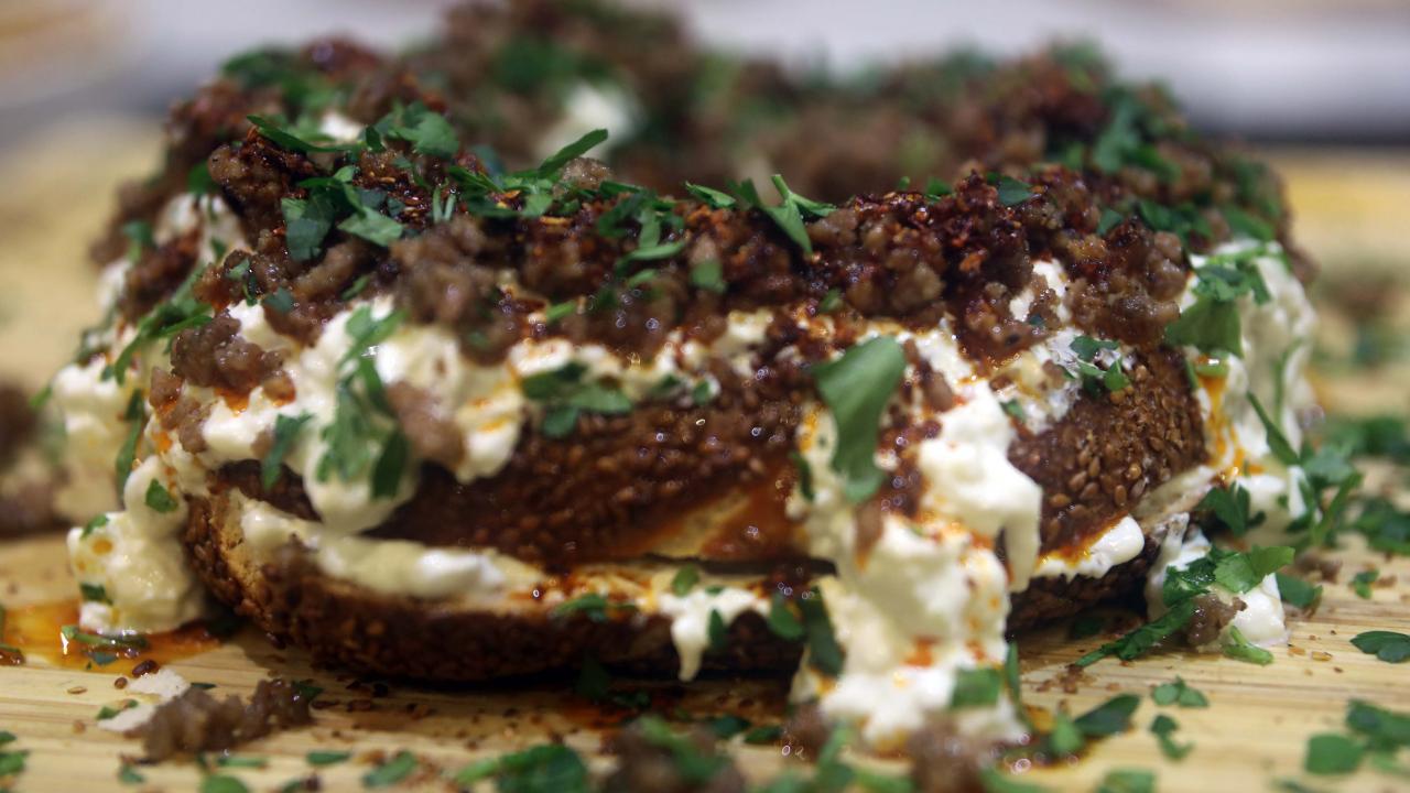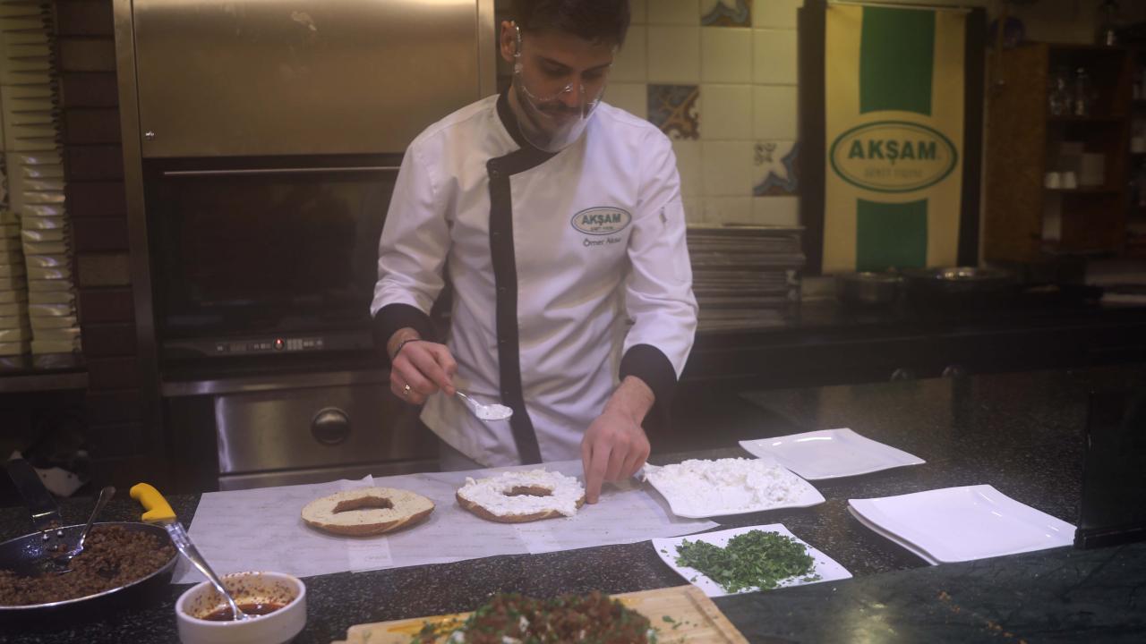 Simit bayıldı yemeğinin yapım aşamalarını anlatan Aksu, "Gevrek simidimizi ortadan ikiye kesiyoruz ve içerisine öncesinde hazırladığımız süzme yoğurt ve taş fırında közlenmiş patlıcanı karıştırıyoruz. İçerisine istek üzerine sarımsak ekleyebiliyoruz. Yaptığımız bu karışımı simidin orta kısmına sürüyoruz. Sürdükten sonra içerisine kavrulmuş kuzu kıymamızı ekliyoruz, sonra kapağı kapatıyoruz. Tekrar üzerine bir yoğurt daha gezdiriyoruz ve üzerine tekrardan bir kıyma en sonunda da maydanoz ve sosumuzu ekleyerek finalimizi yapıyoruz" şeklinde konuştu.
