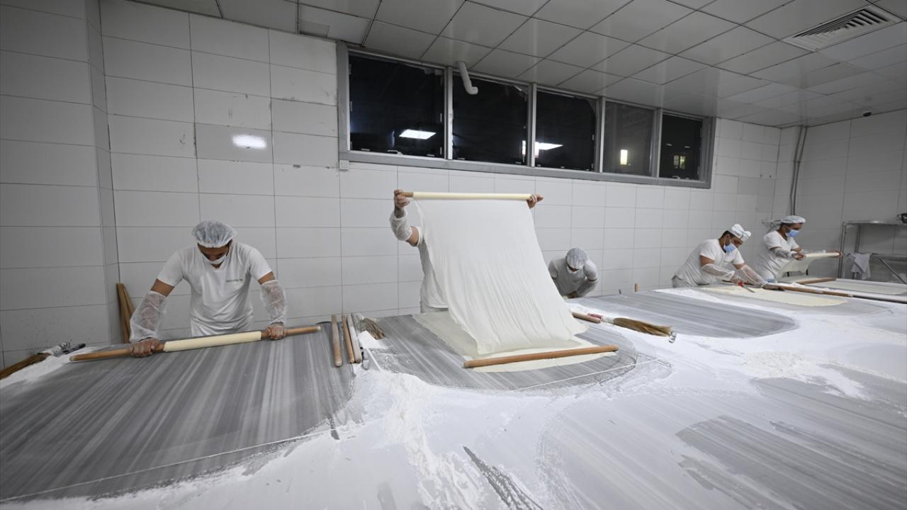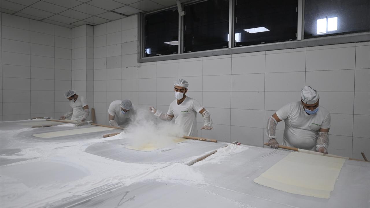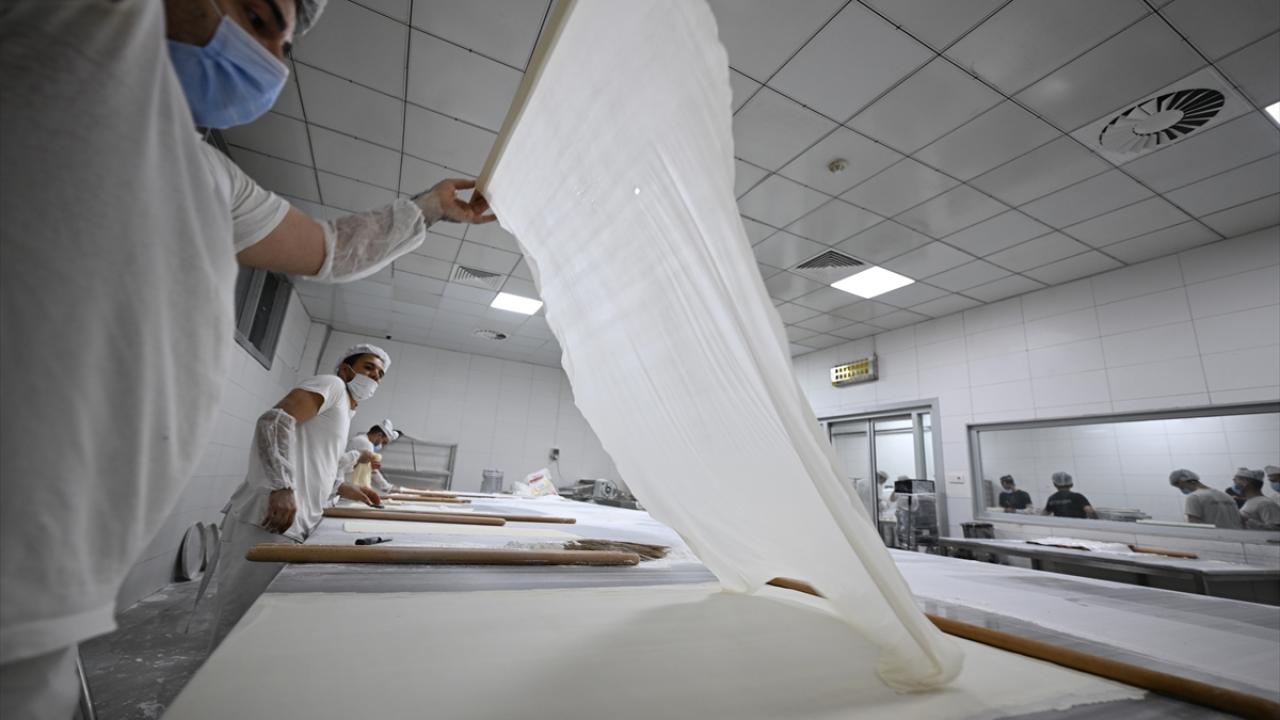 Hamuru merdaneyle adeta kağıt haline getiren ustalar, yufkayı tek tek tepsiye yerleştiriyor. Tereyağı ve fıstıkla süslenen baklava, yaklaşık 1 saat fırında bekledikten sonra şerbeti dökülüp hazır hale getiriliyor.