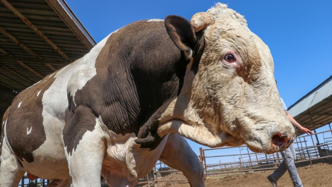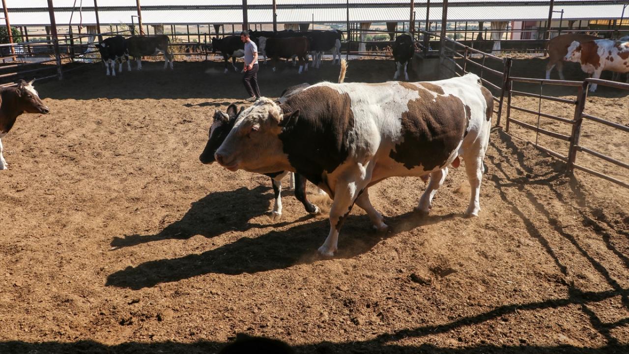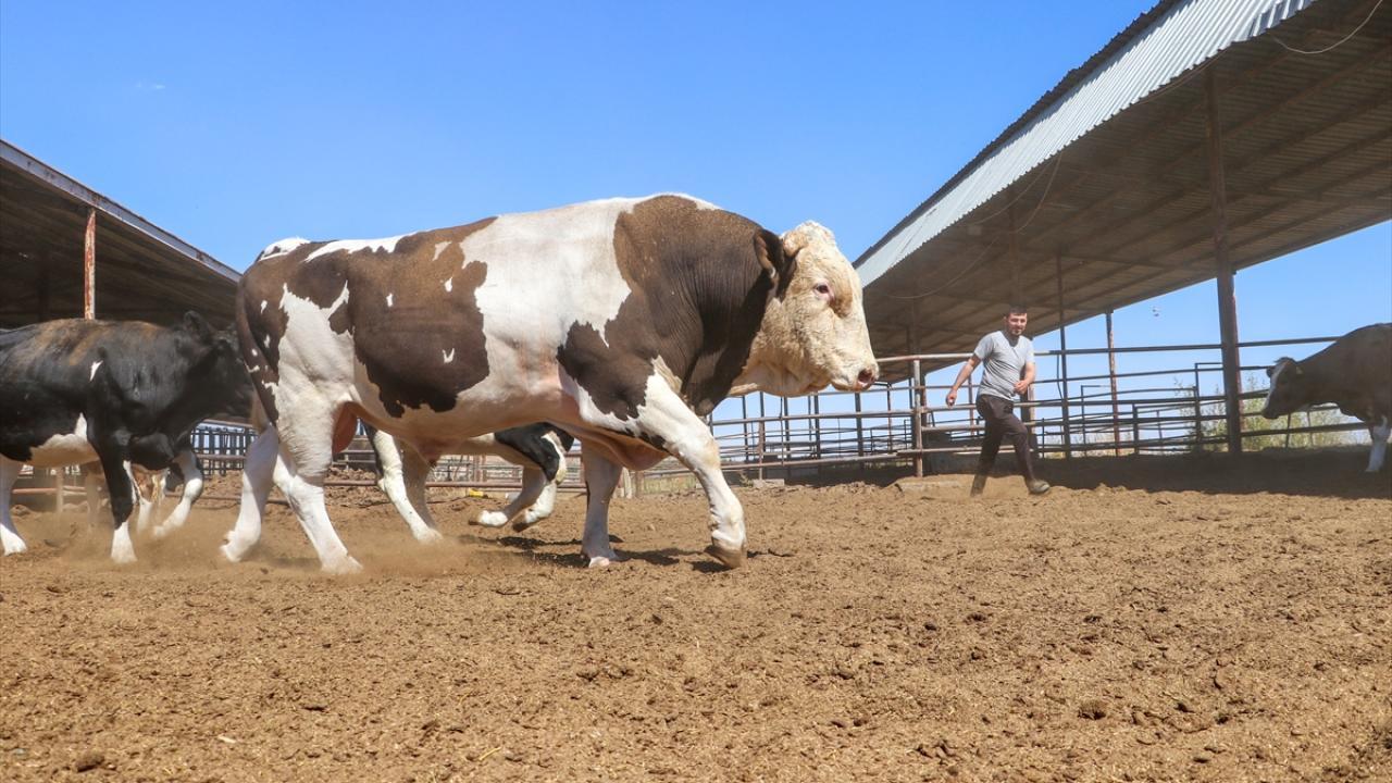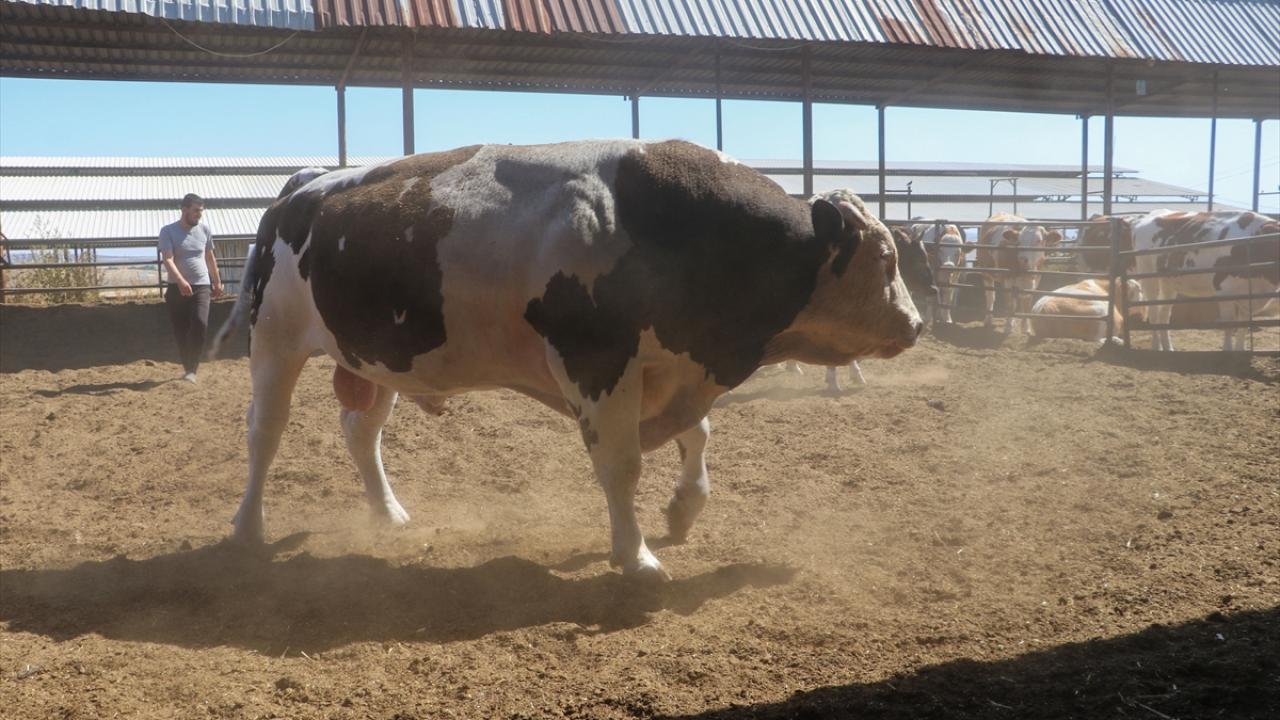 Oğuzeli ilçesi Karataş Mahallesi`ndeki büyükbaş hayvan çiftliğinde çalışan veteriner teknikeri Mehmet Can Bartık`ın yetiştirdiği 3,5 yaşındaki "Fıstık", alıcısını bekliyor.