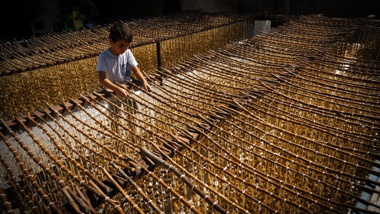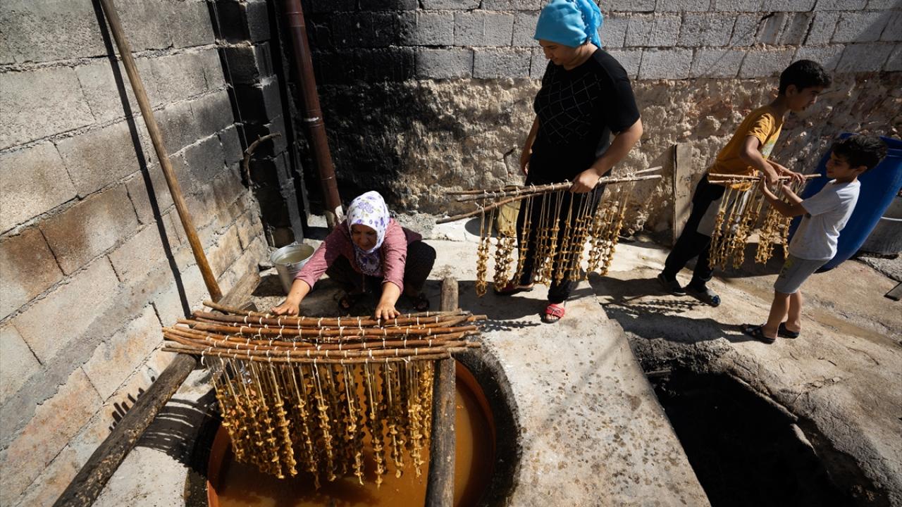 Anadolu`nun birçok bölgesinde yapılagelmiş bir tatlı olan cevizli sucuk, Gaziantep’in Oğuzeli ilçesinde de üzümlerin olgunlaşması ile yapımına başlandı.