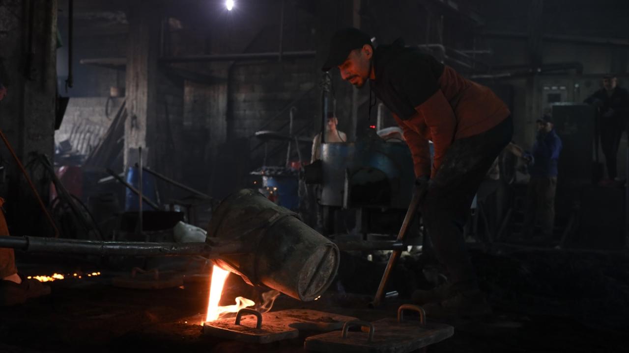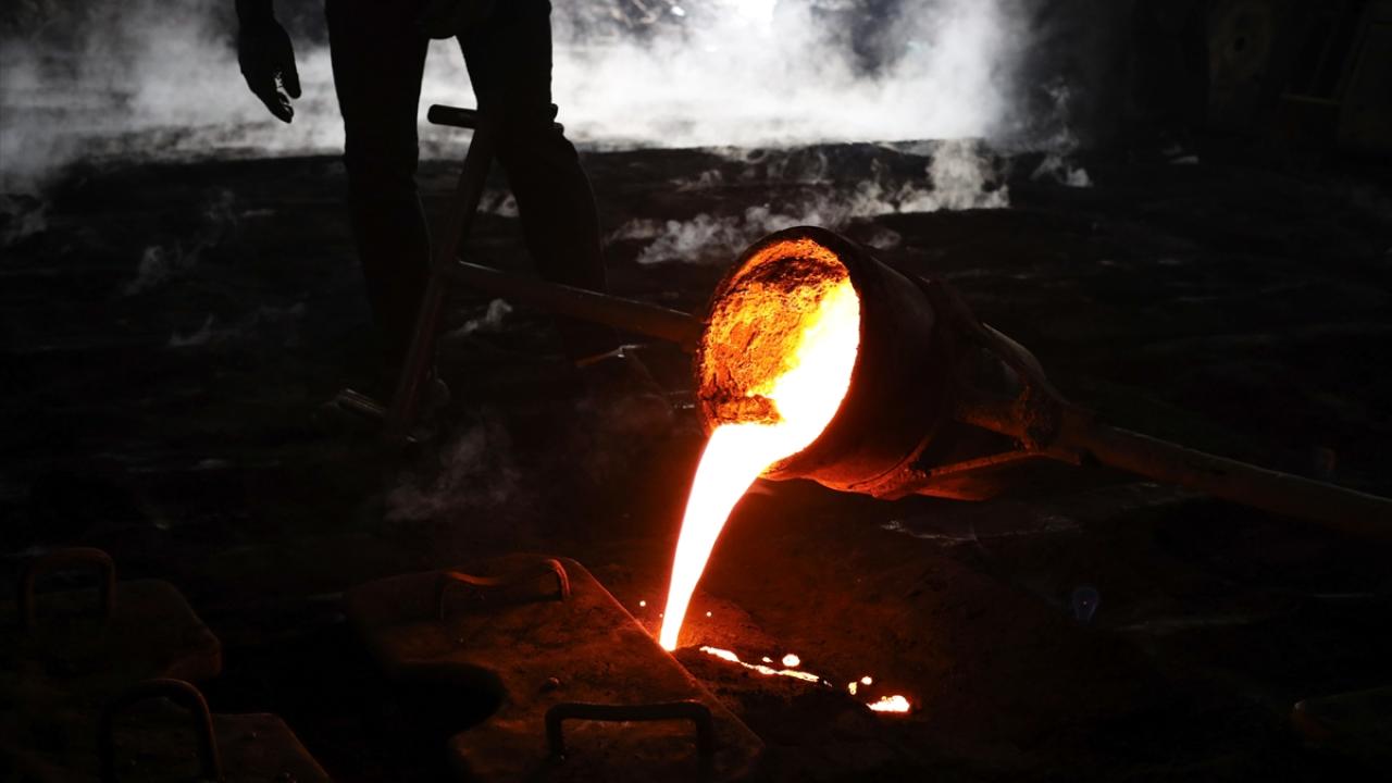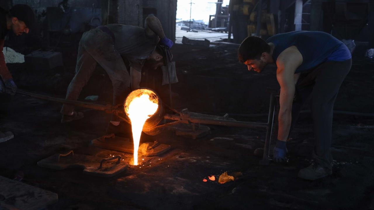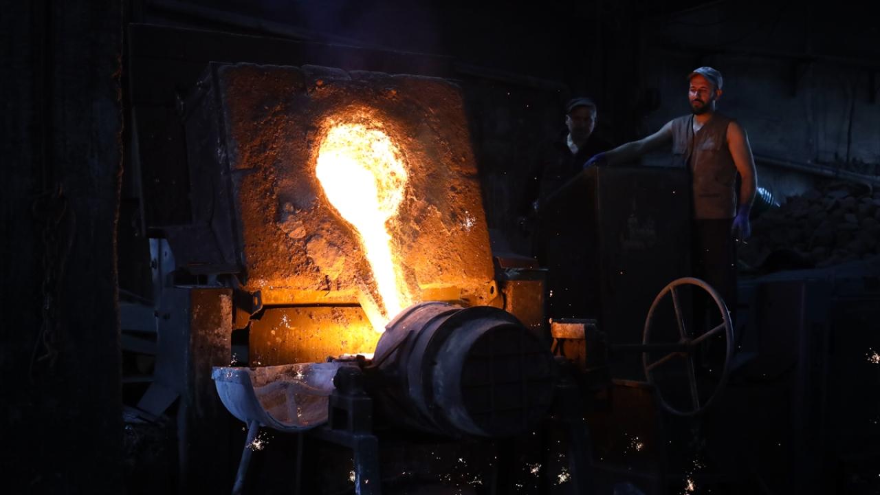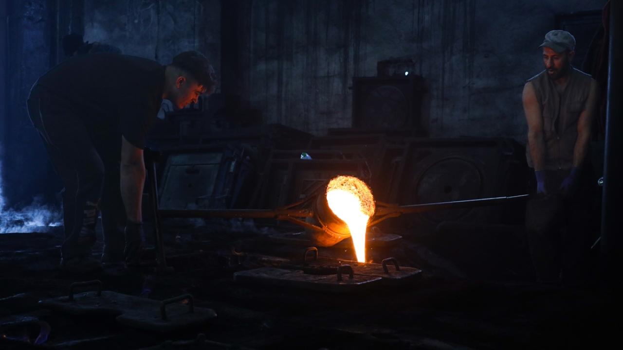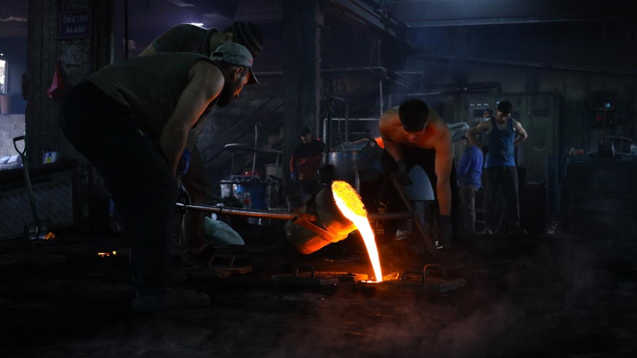 Yüksek sıcaklıklarda eritilen metaller, işçiler tarafından potalarla kalıplara dökülerek çeşitli ürünlere dönüştürülüyor.