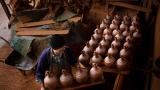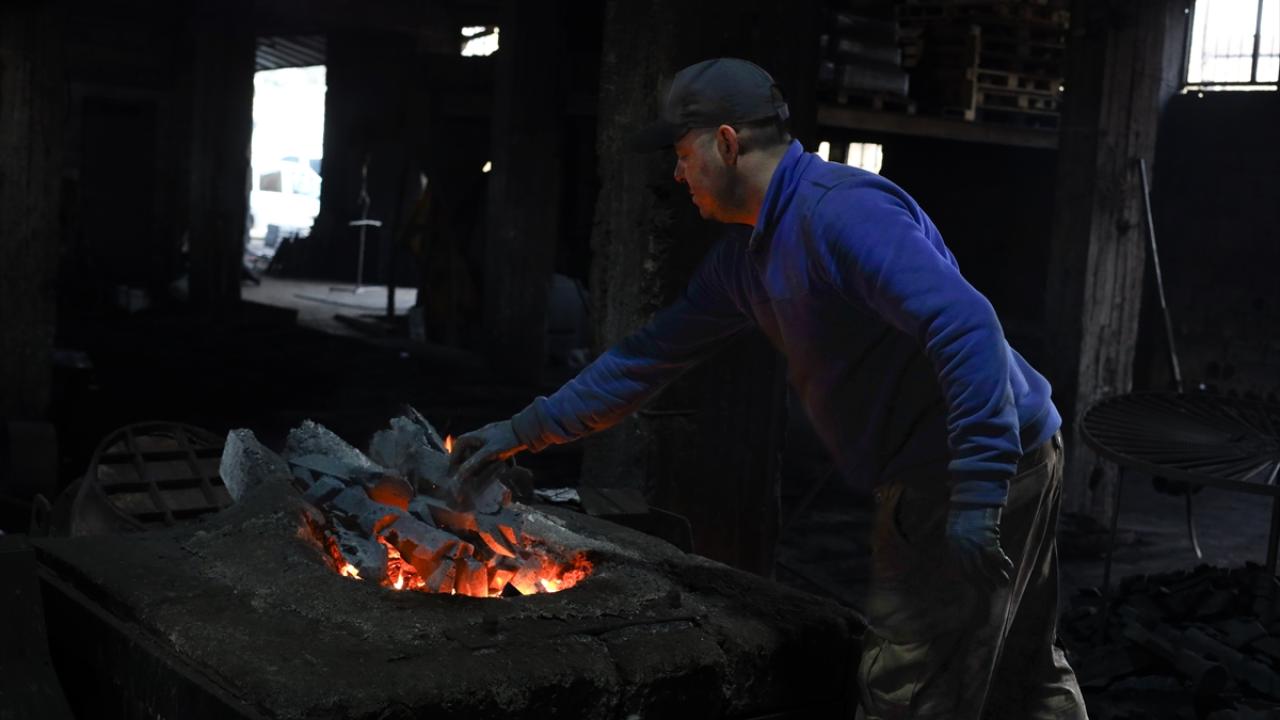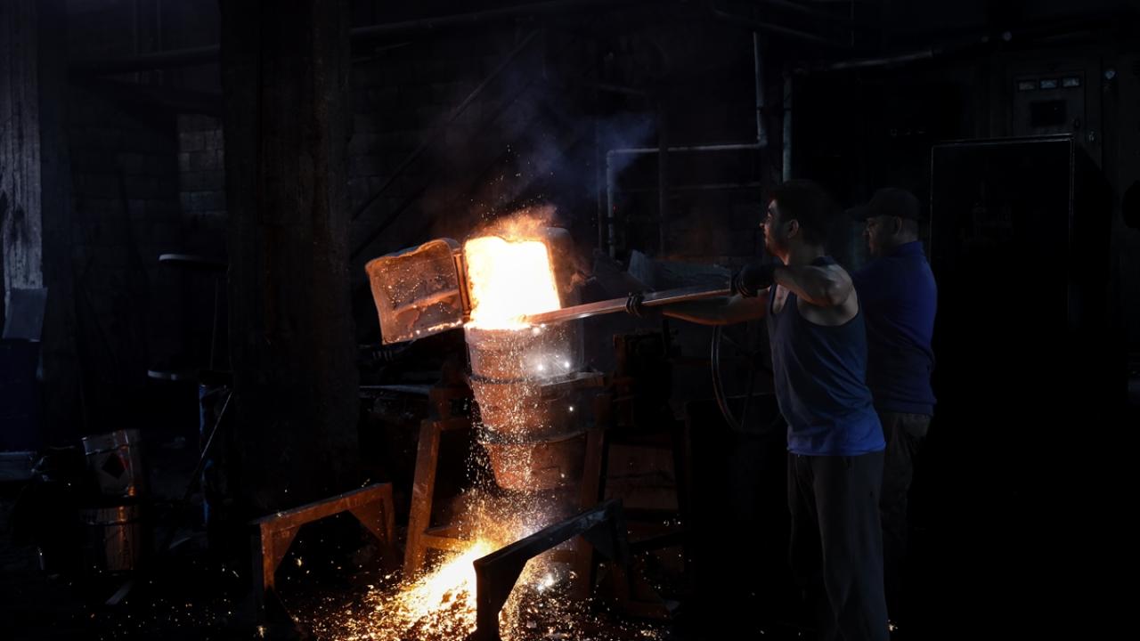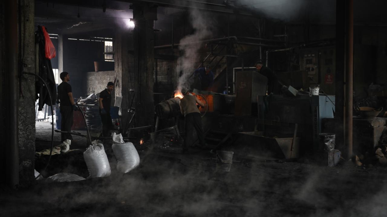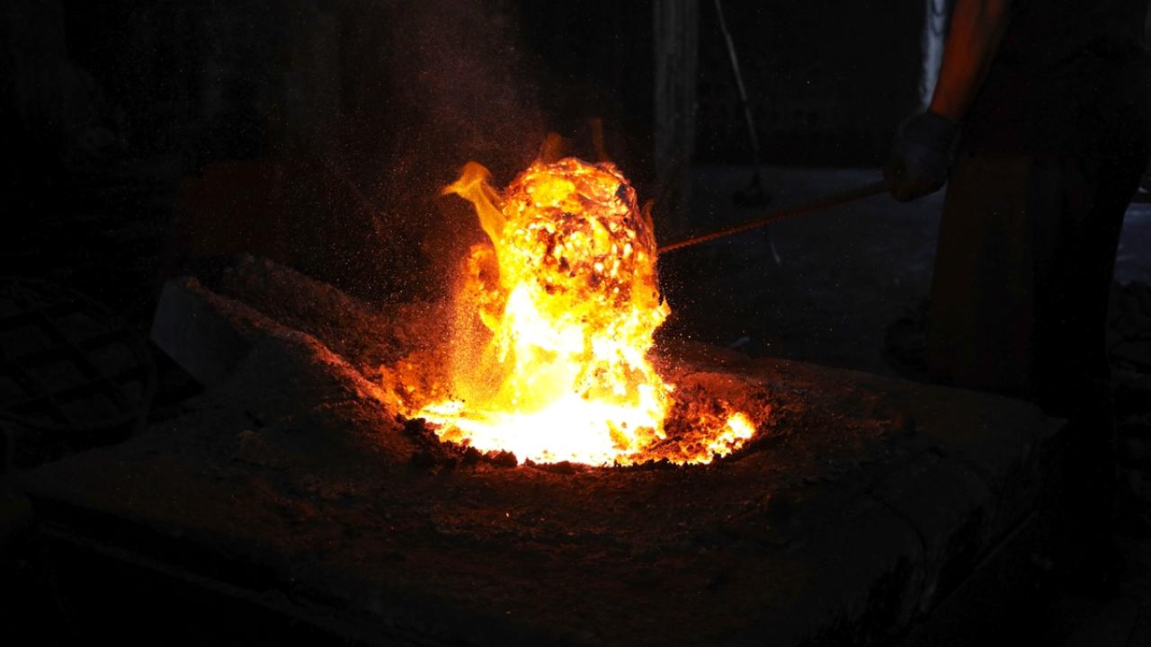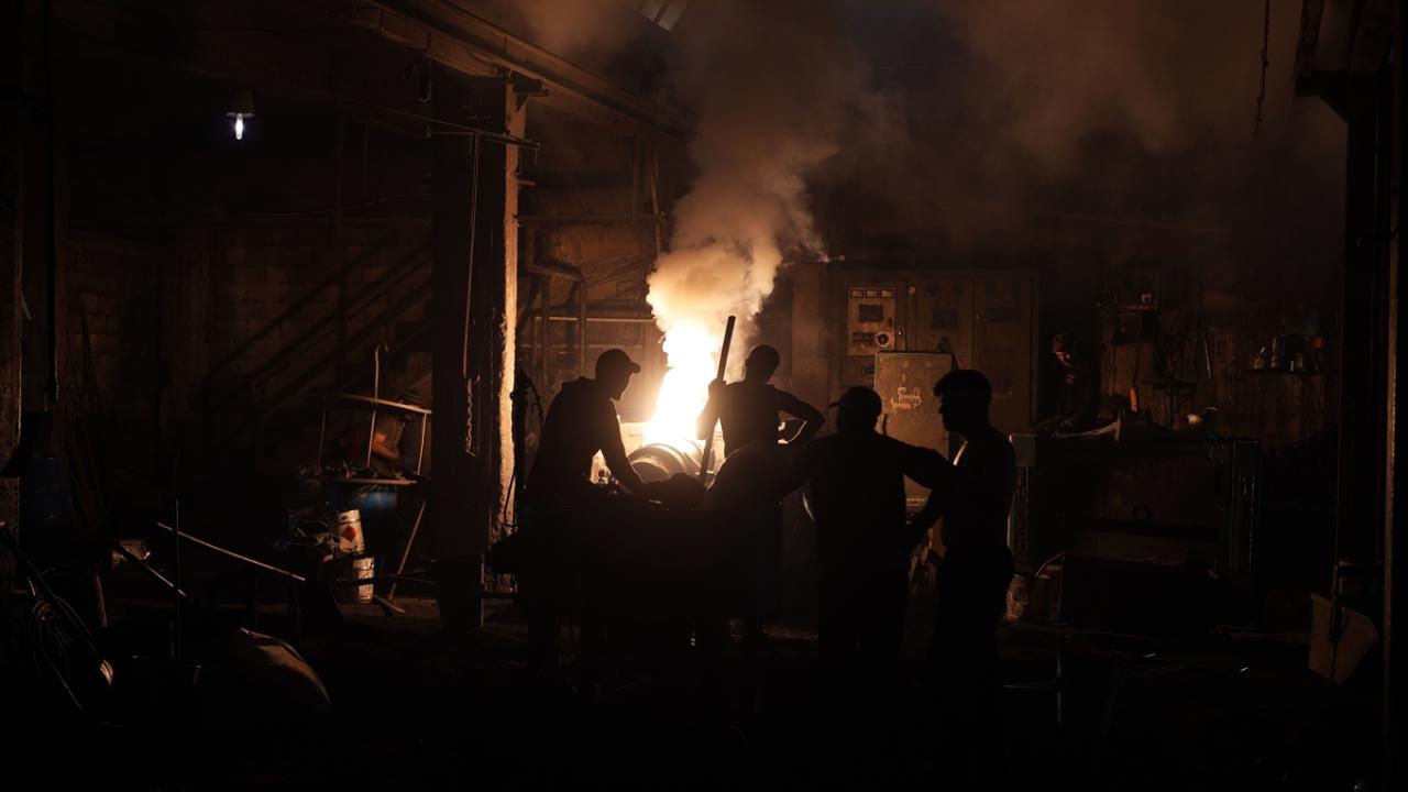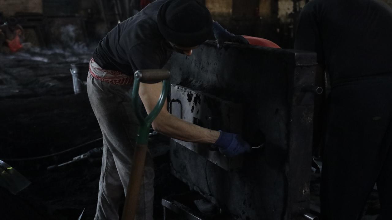 Yüksek sıcaklıklarda eritilen metaller, işçiler tarafından potalarla kalıplara dökülerek çeşitli ürünlere dönüştürülüyor.
