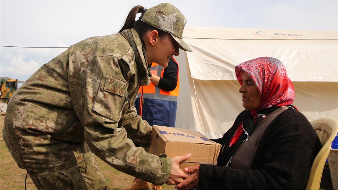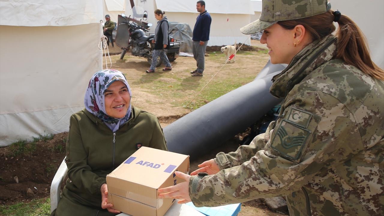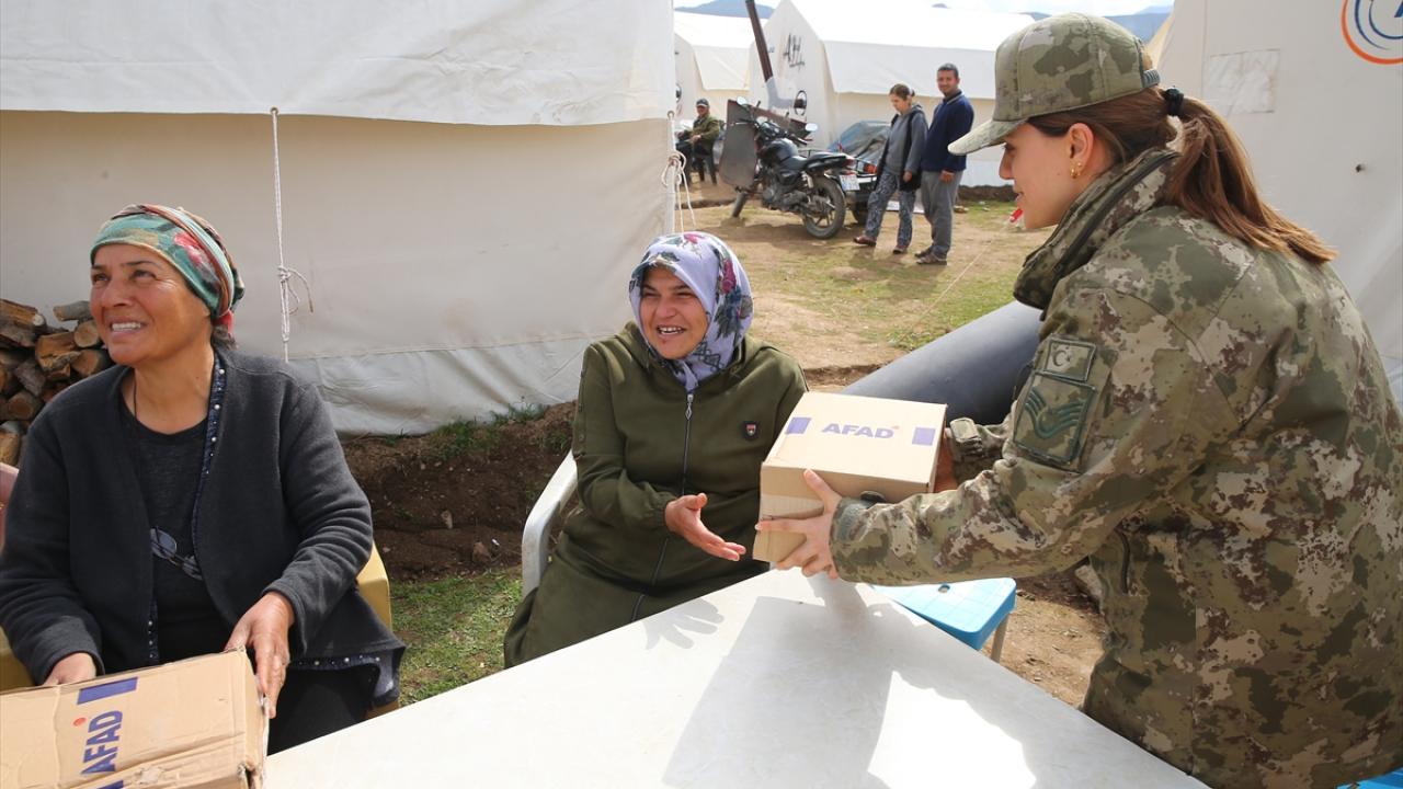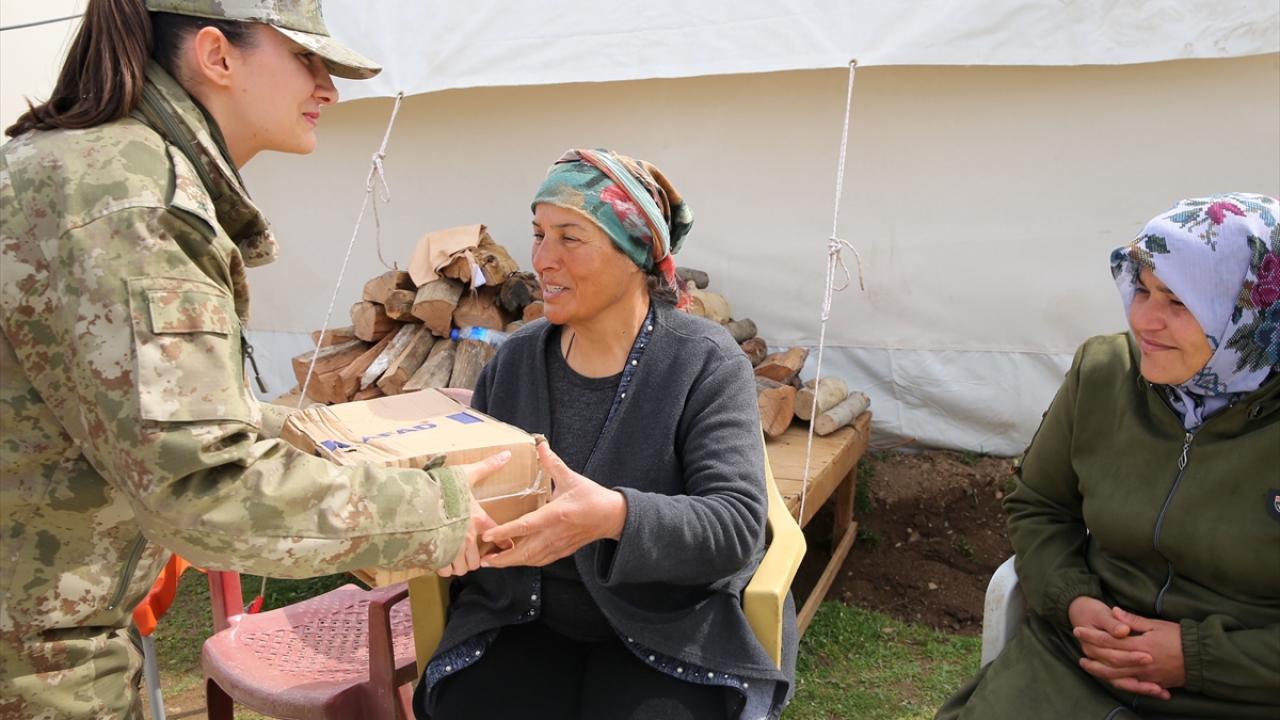 Türk Silahlı Kuvvetleri mensubu kadın subay ve astsubaylar, 6 Şubat'taki Kahramanmaraş merkezli depremlerden etkilenen Gaziantep'in İslahiye ilçesindeki depremzede kadınların 8 Mart Dünya Kadınlar Günü'nü kutladı.