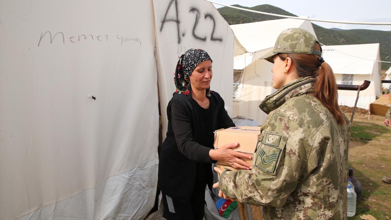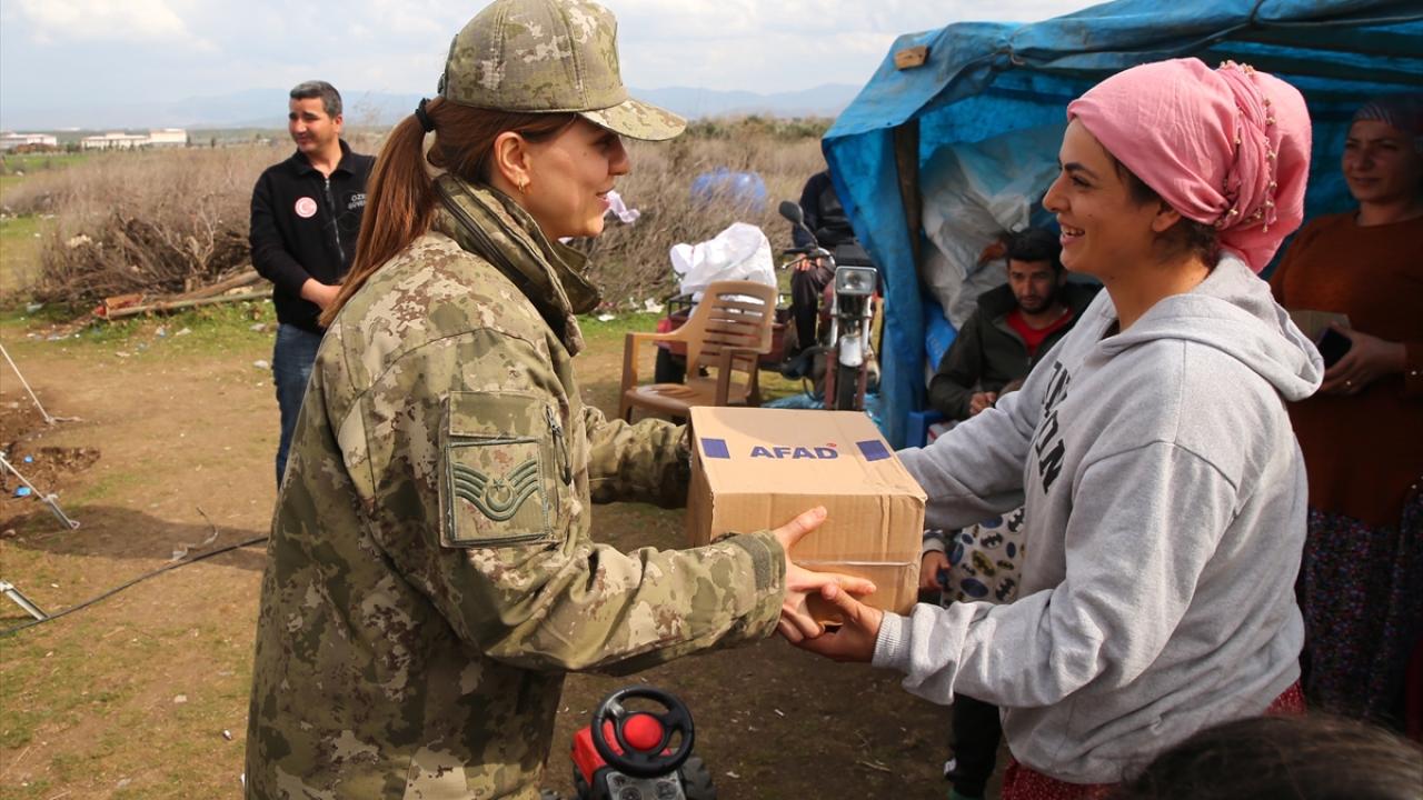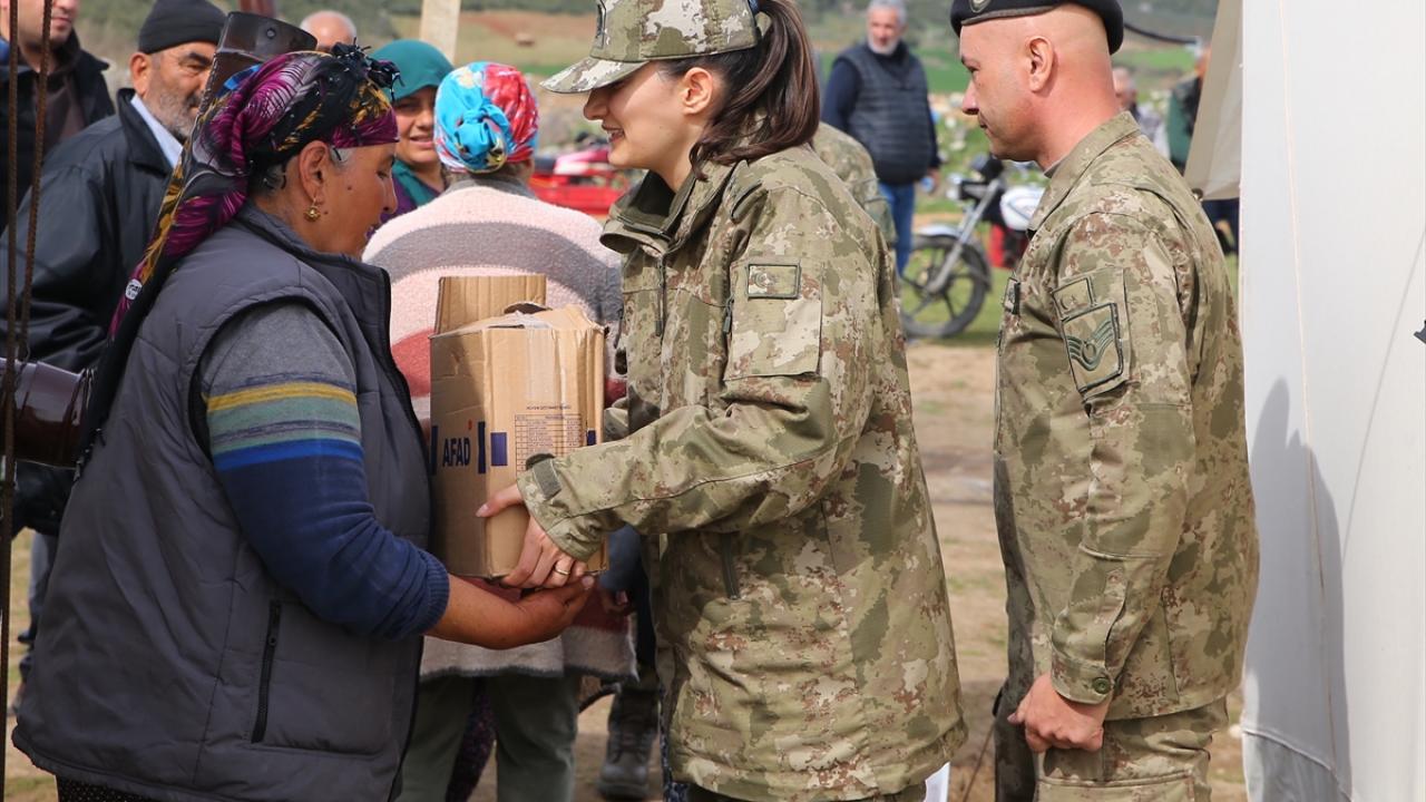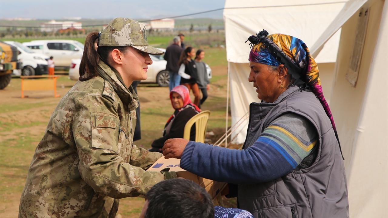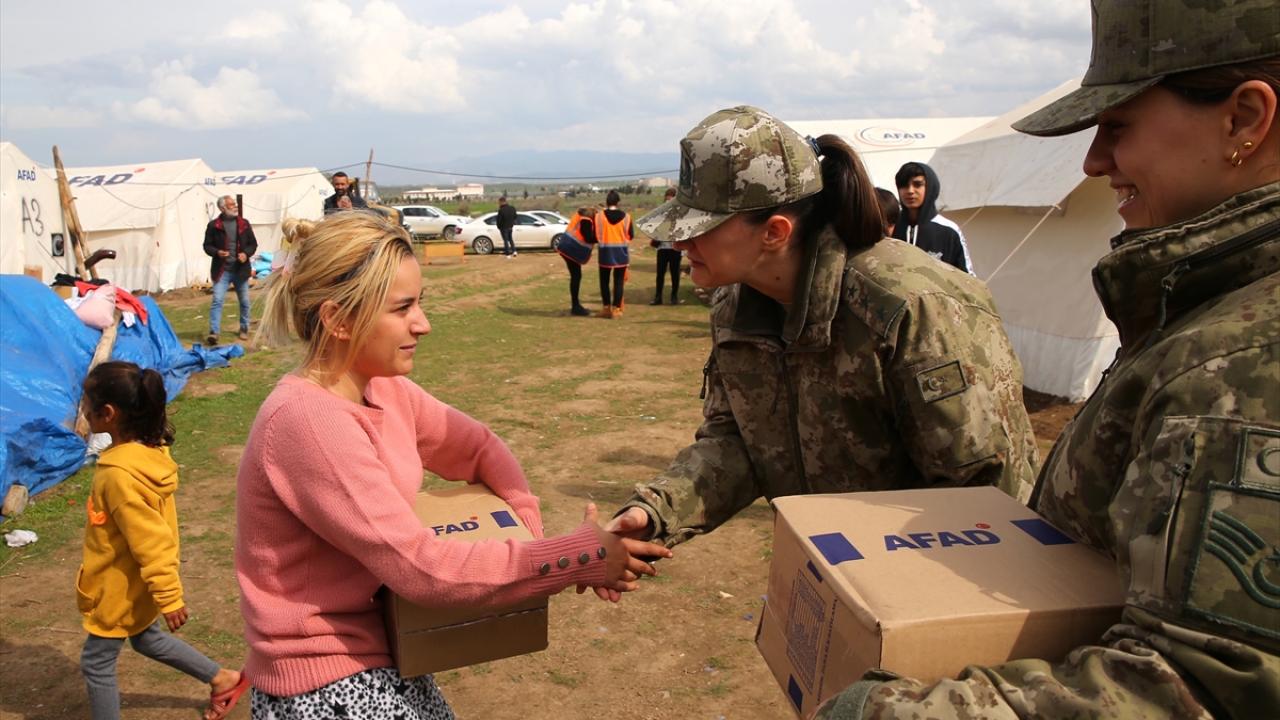 Türk Silahlı Kuvvetleri mensubu kadın subay ve astsubaylar, 6 Şubat'taki Kahramanmaraş merkezli depremlerden etkilenen Gaziantep'in İslahiye ilçesindeki depremzede kadınların 8 Mart Dünya Kadınlar Günü'nü kutladı.