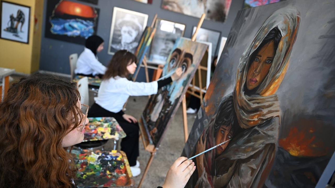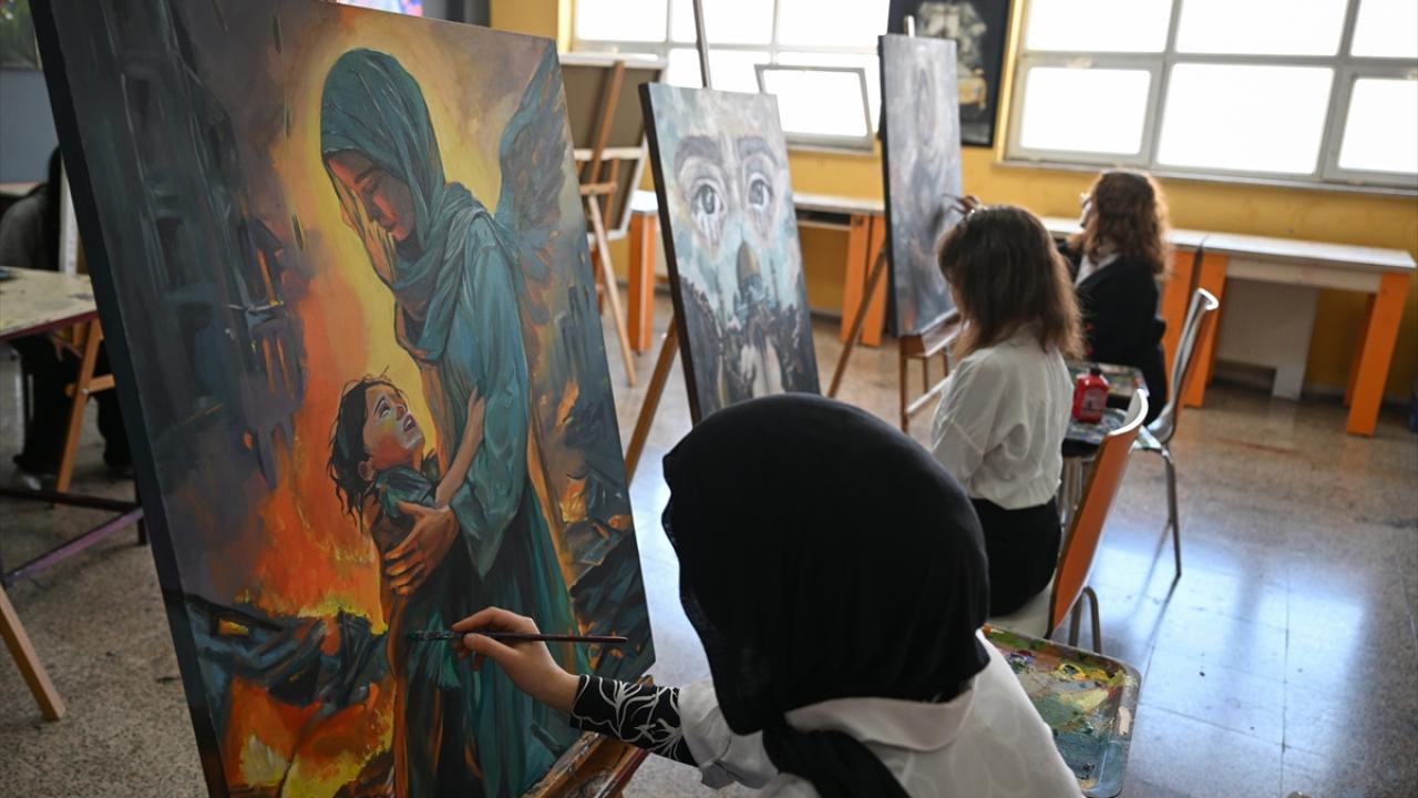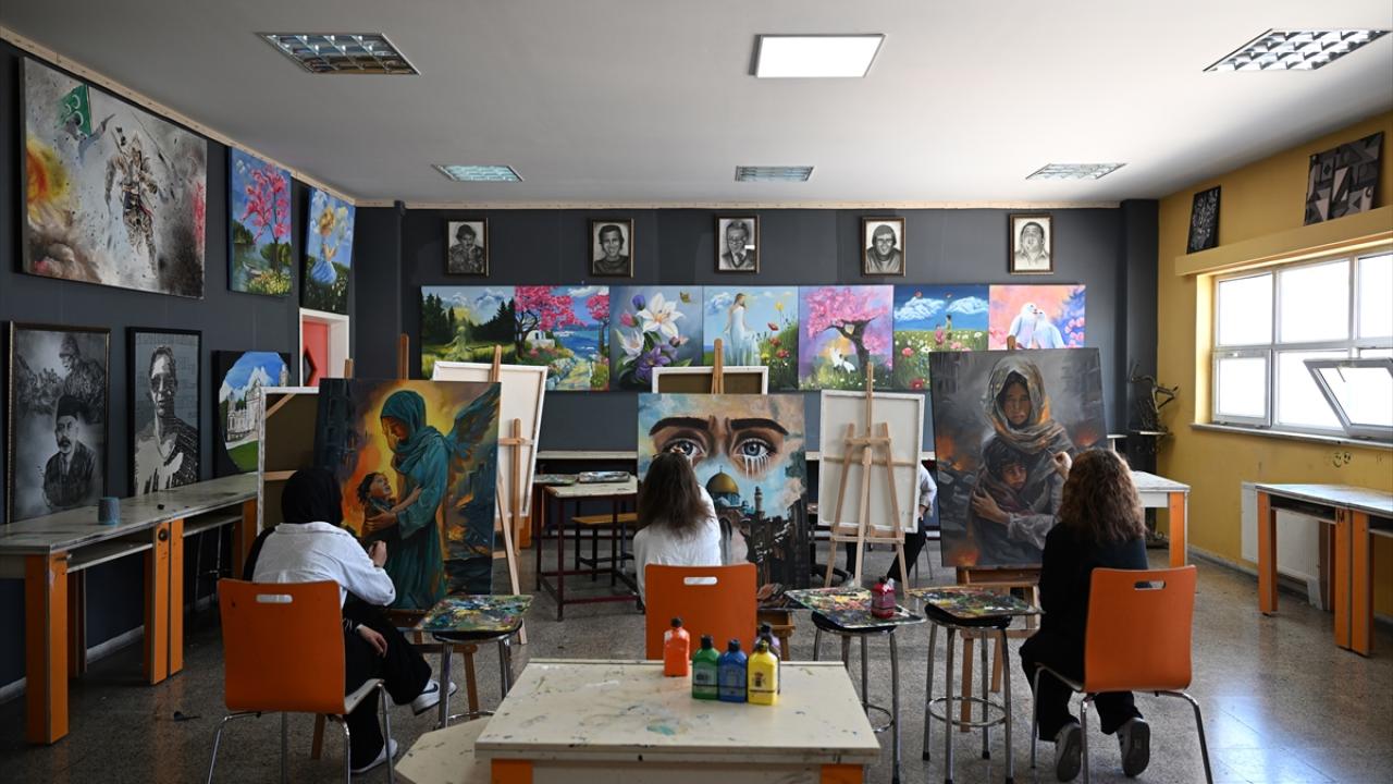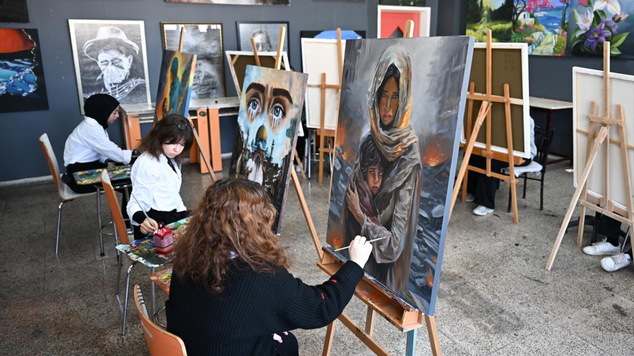 Resim bölümü öğrencileri, İl Milli Eğitim Müdürlüğünün "Gazze`nin Gözyaşı" projesi kapsamında resim çalışması yaptı.