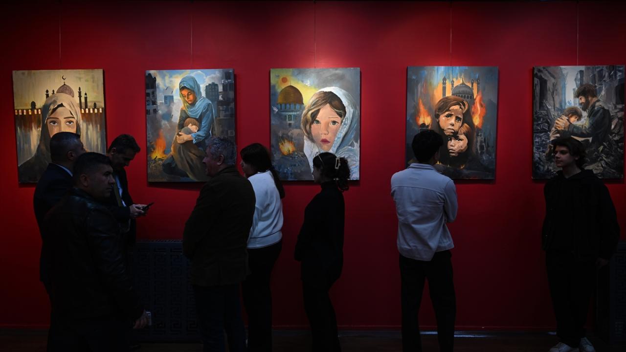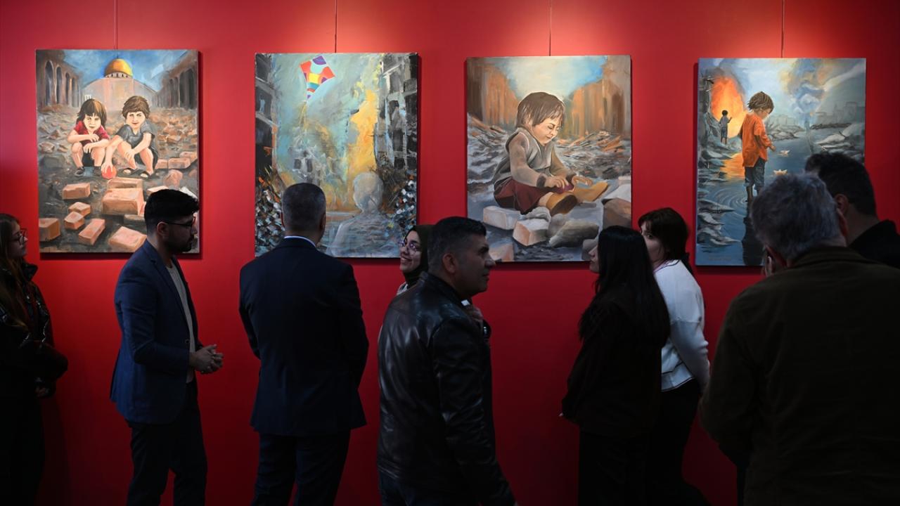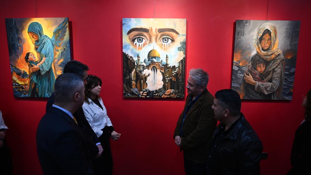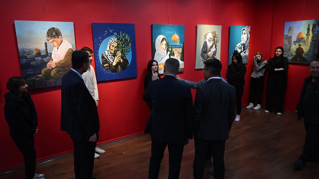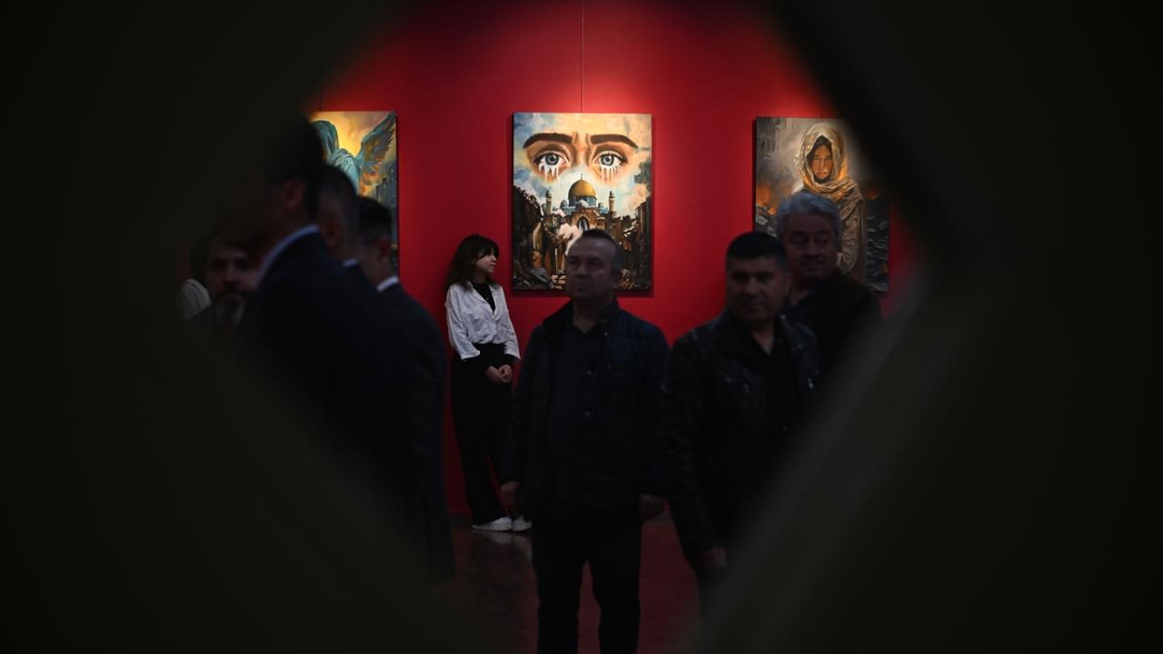Gazze`deki dramın yansıtıldığı 26 eser, okulun sergi salonunda sanat severlerle buluştu.
