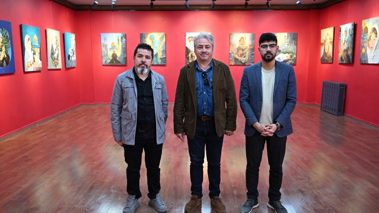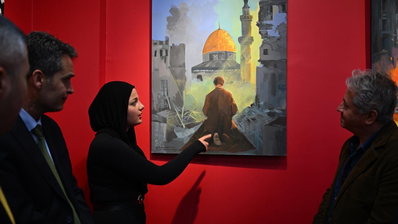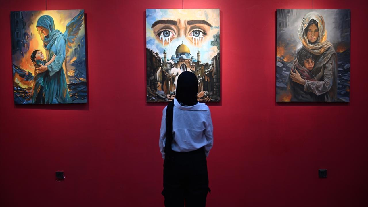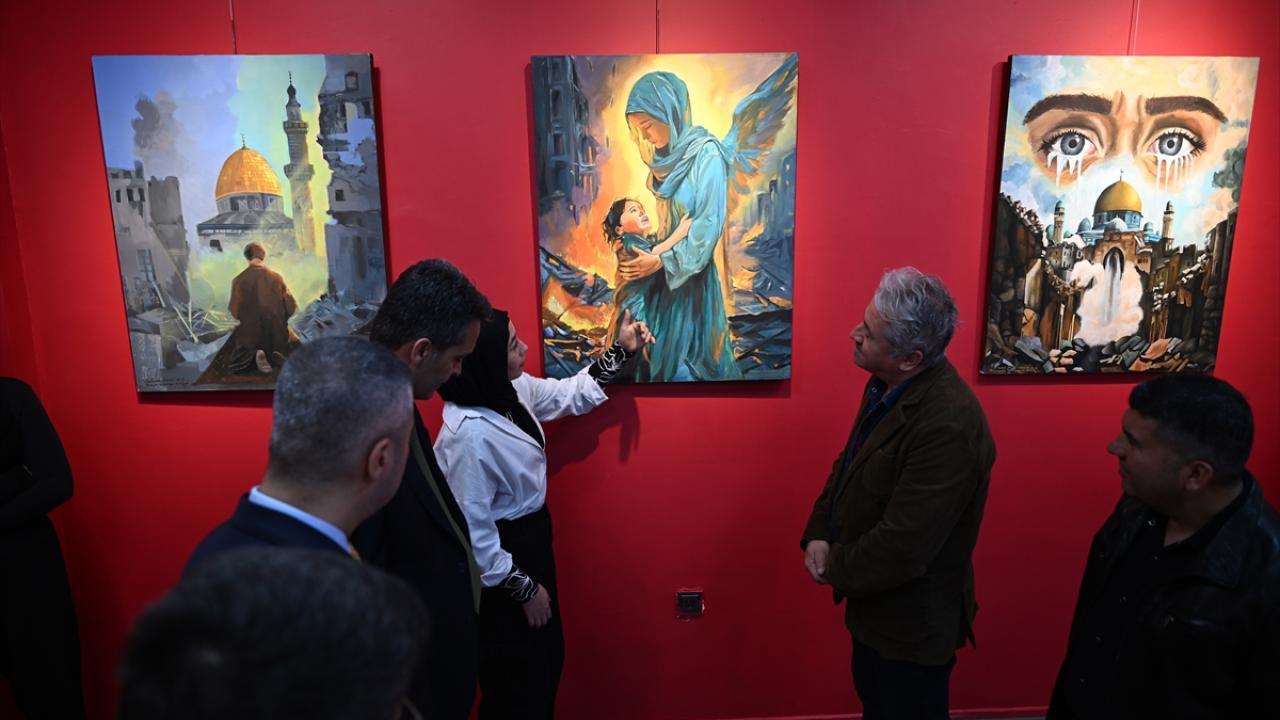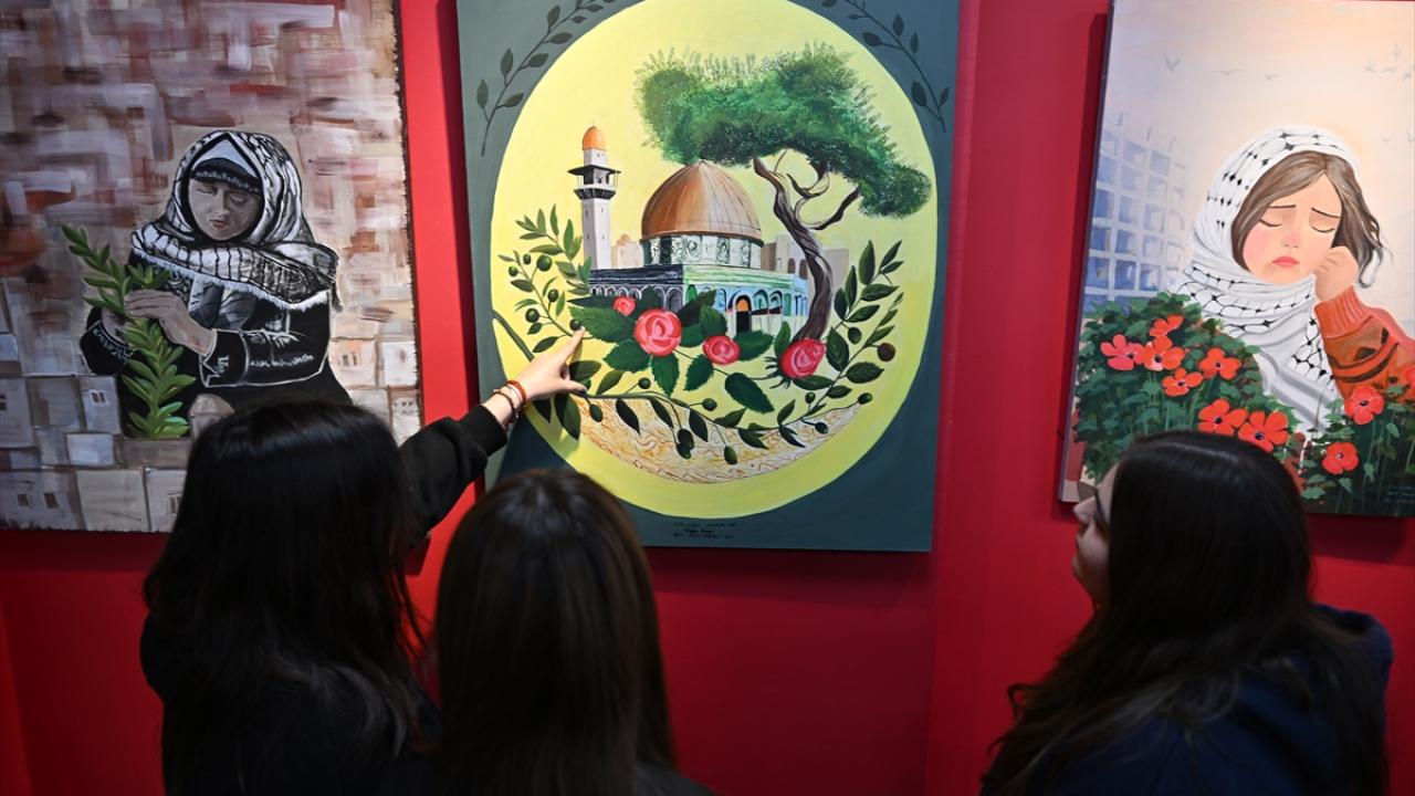 Gazze`deki dramın yansıtıldığı 26 eser, okulun sergi salonunda sanat severlerle buluştu.
