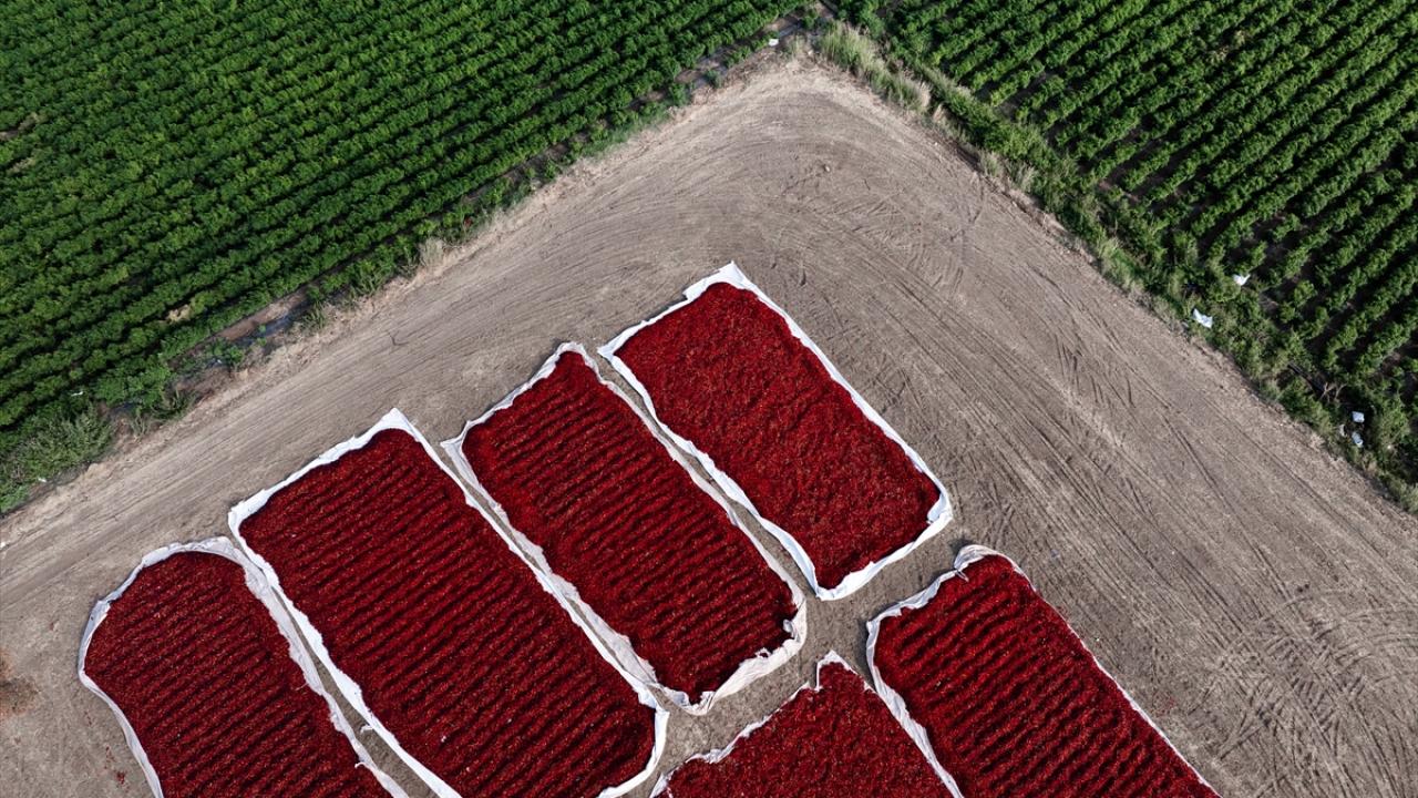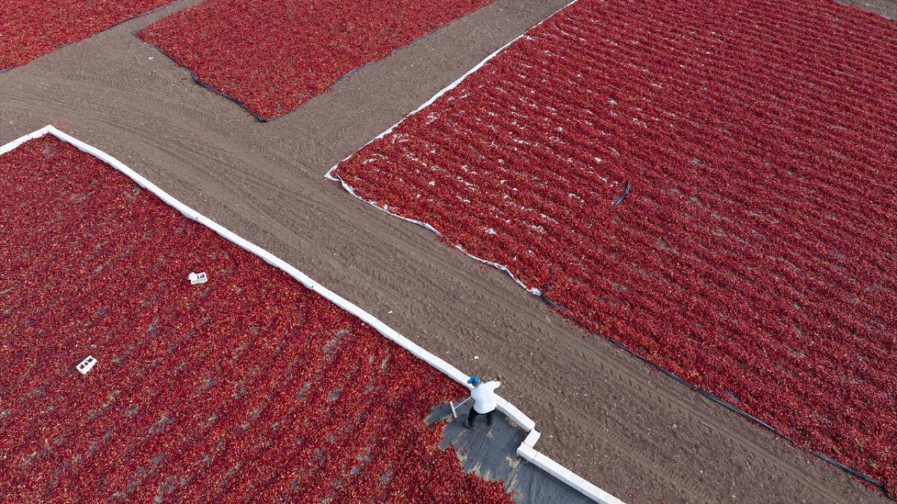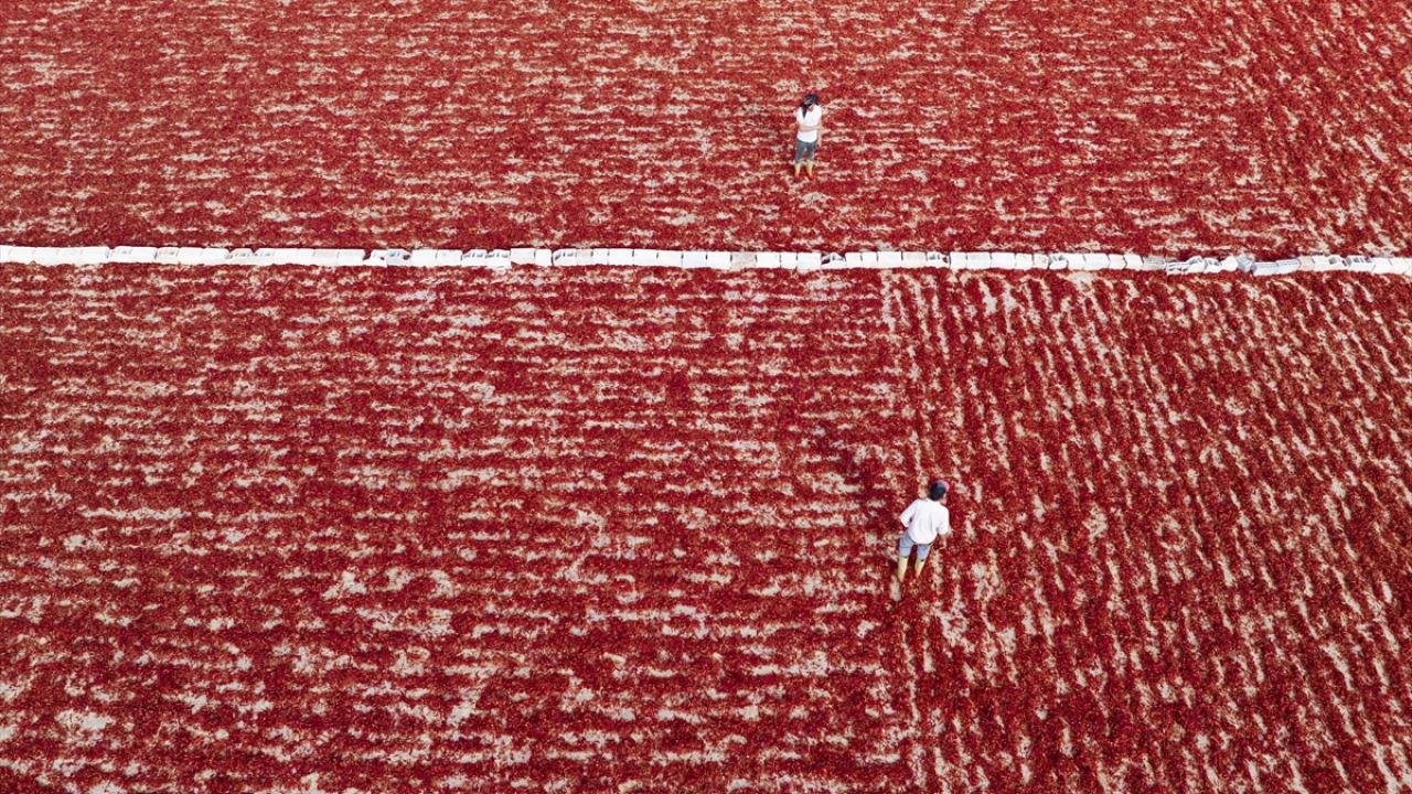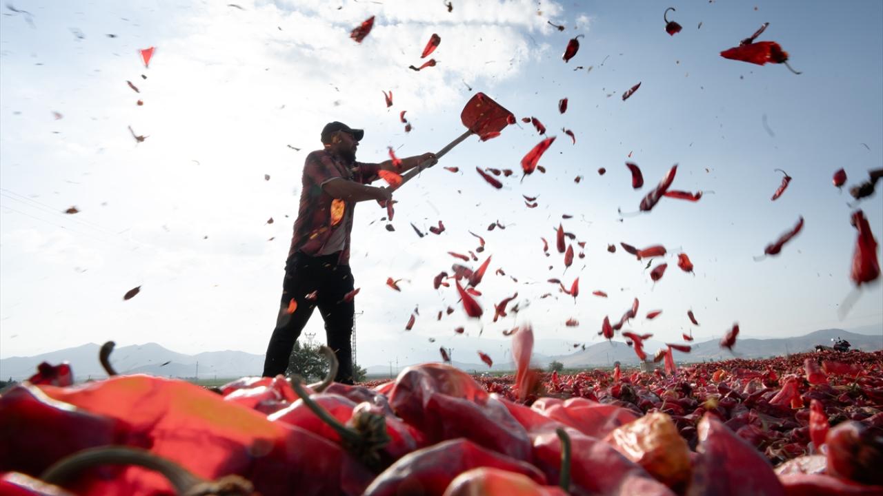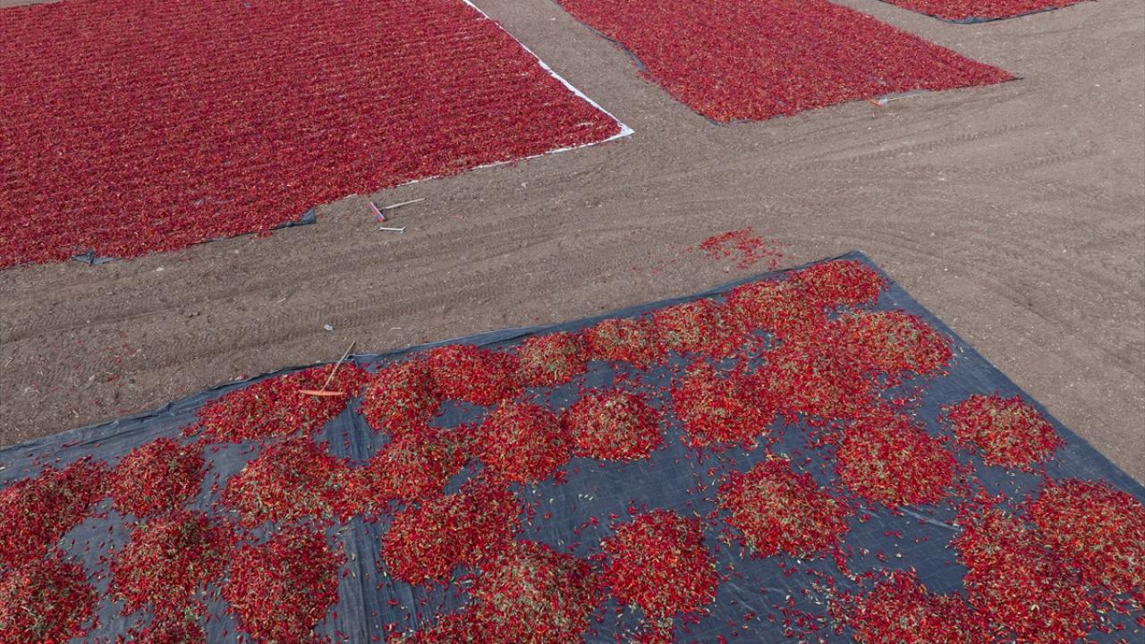 Yoğun emek isteyen süreçte çiftçiler sabahın ilk saatlerinde çalışmaya başlarken kurutma alanları kırmızıya bürünüyor.