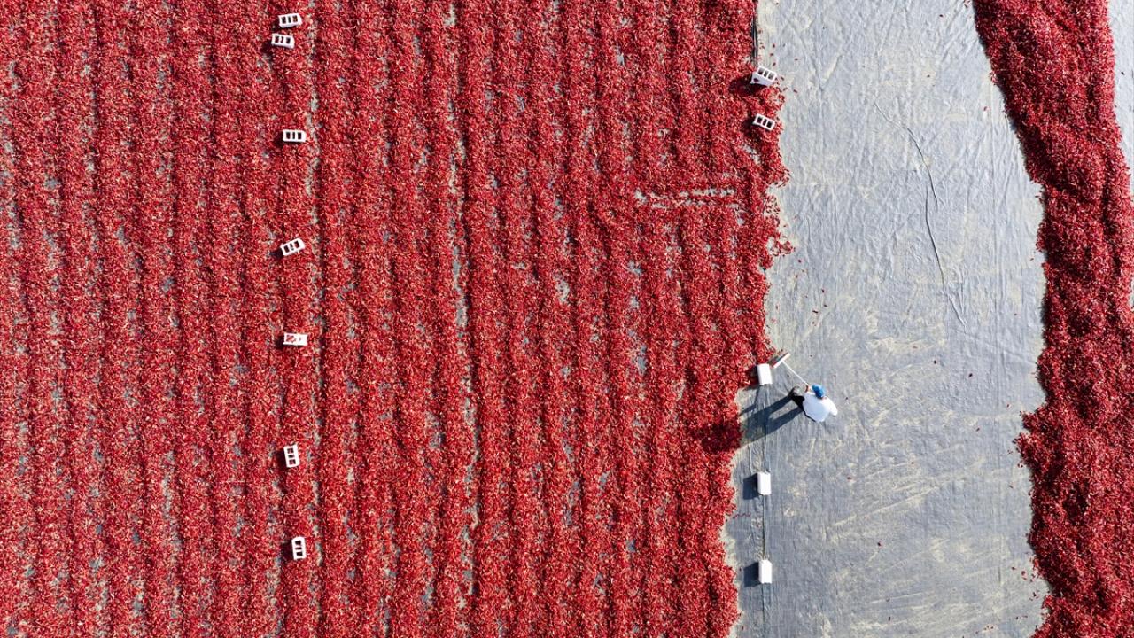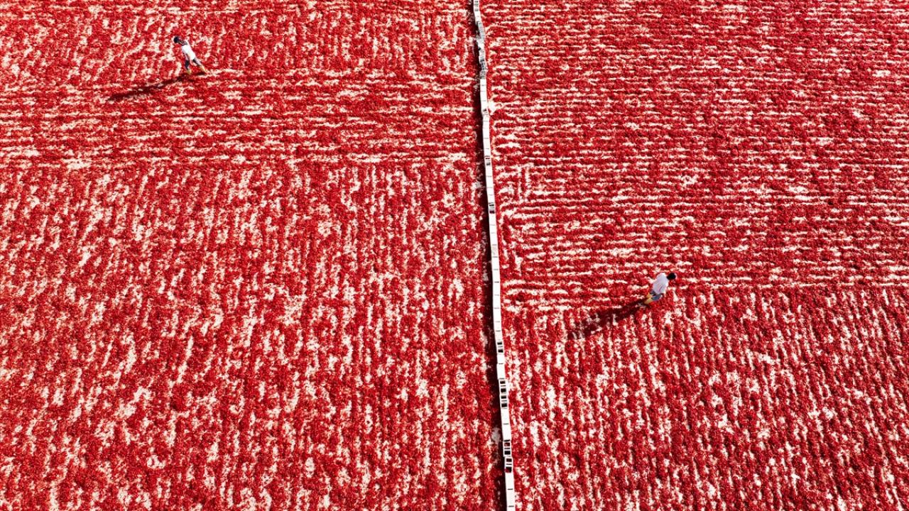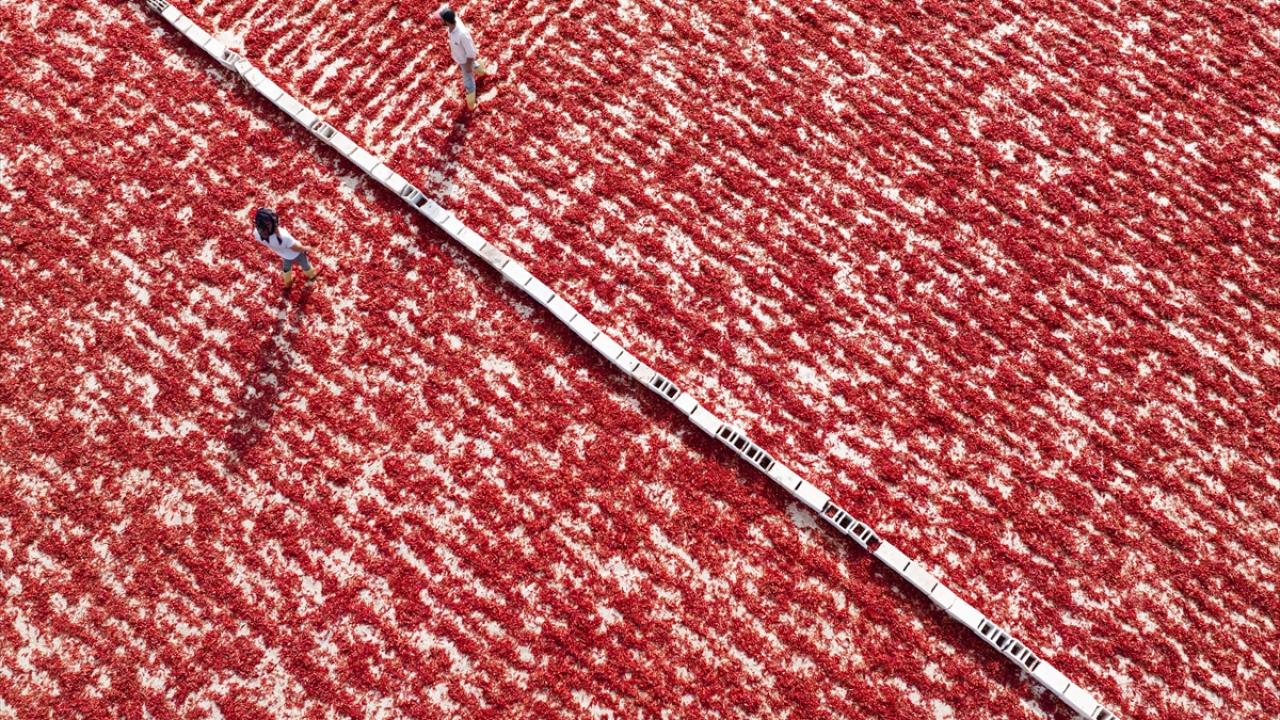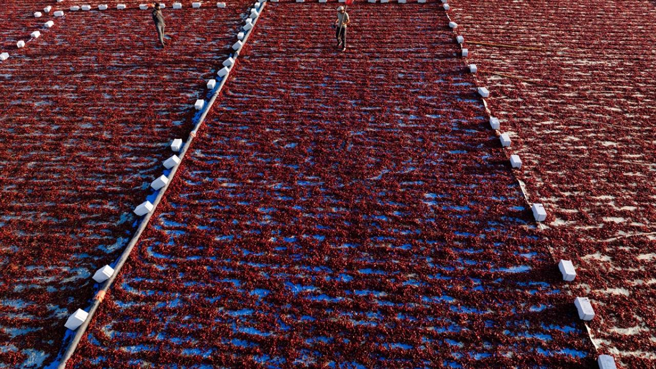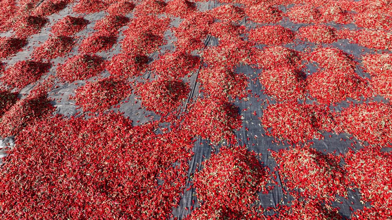 Yoğun emek isteyen süreçte çiftçiler sabahın ilk saatlerinde çalışmaya başlarken kurutma alanları kırmızıya bürünüyor.