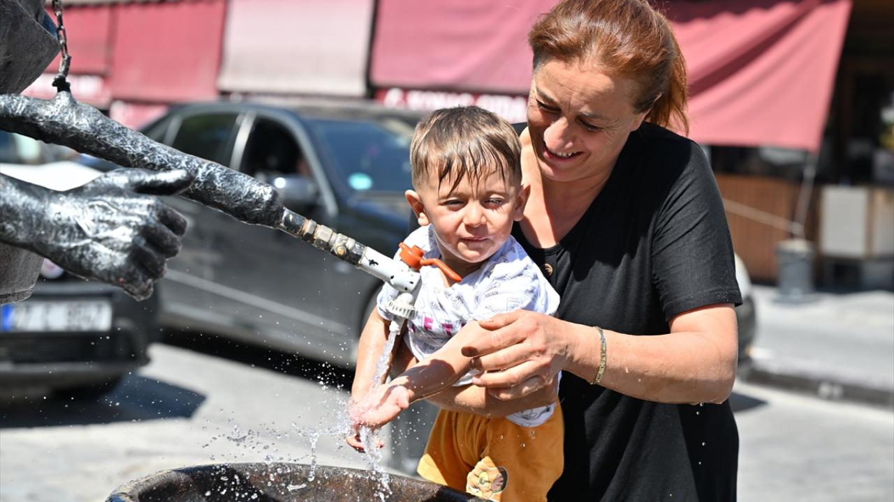 Kentte sıcaktan bunalan vatandaşlar gölgelik alanlarda vakit geçirirken, bazıları da çeşmelerde yüzünü ve başını ıslatarak serinlemeye çalıştı.