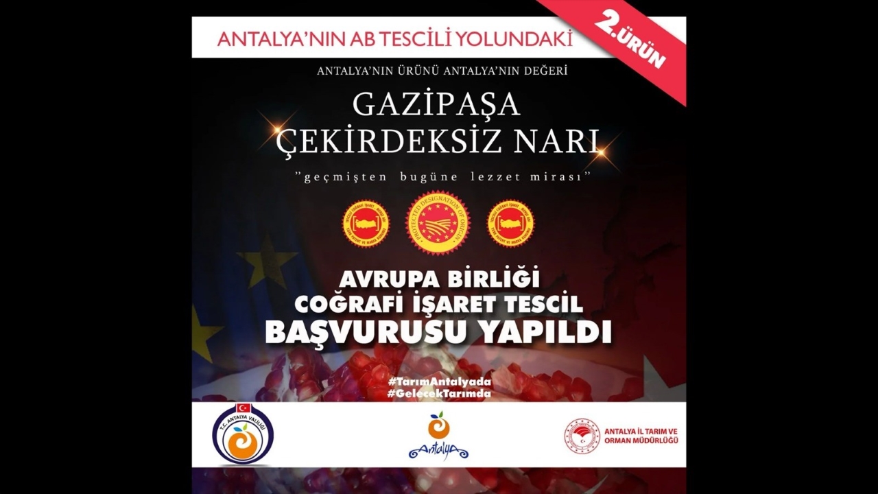 Antalya İl Tarım ve Orman Müdürlüğü koordinasyonunda yürütülen çalışmalar sonucunda, Gazipaşa çekirdeksiz narı, Antalya’nın Avrupa Birliği Coğrafi İşaret (PDO) tescil başvurusu yapılan ikinci ürünü oldu.