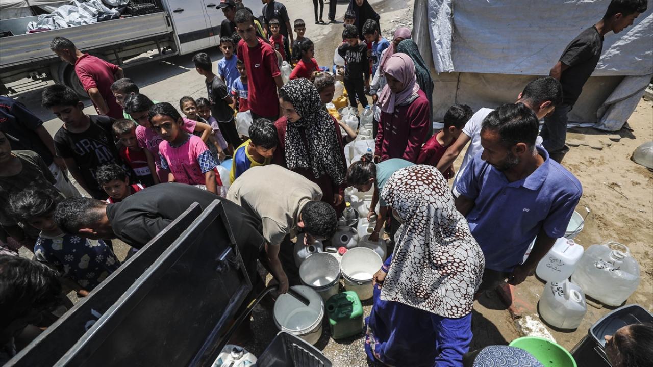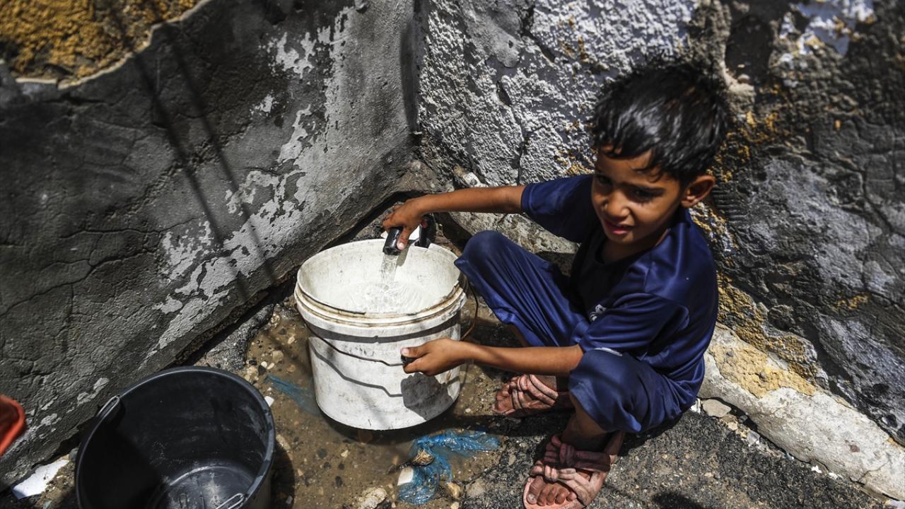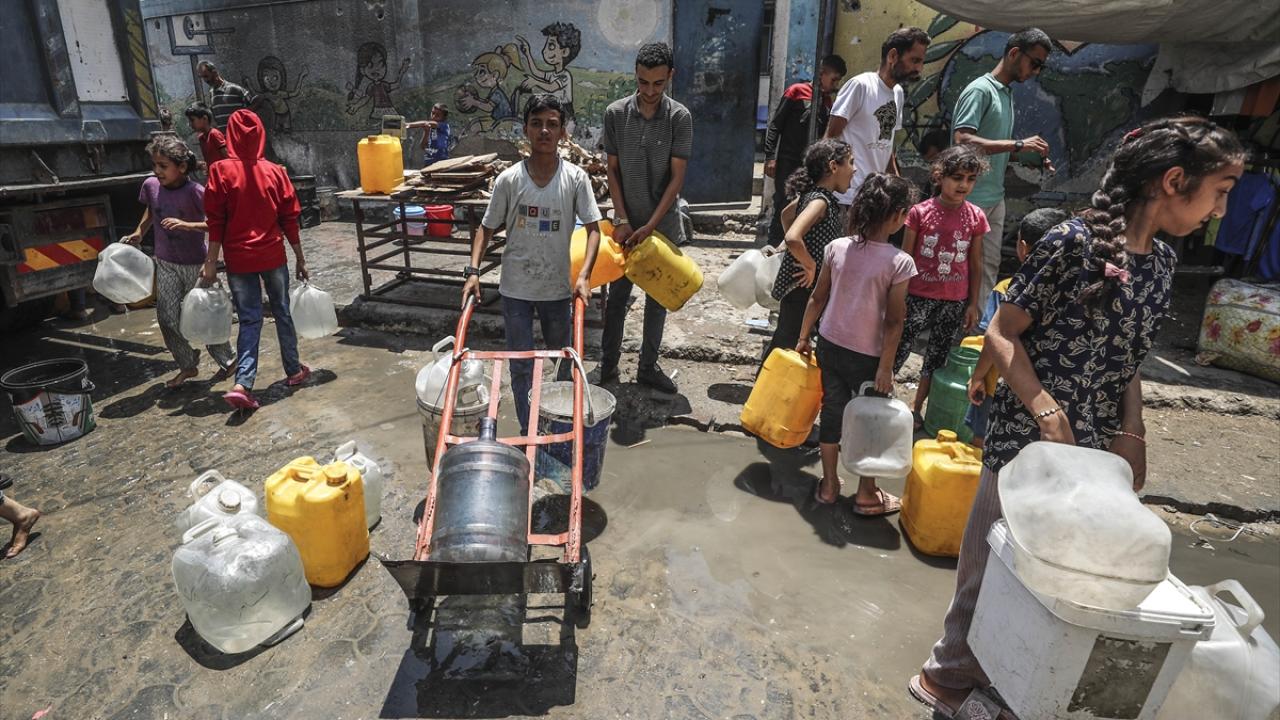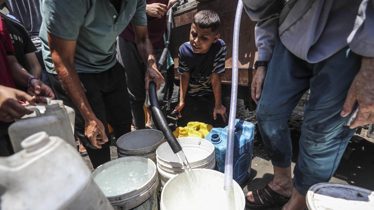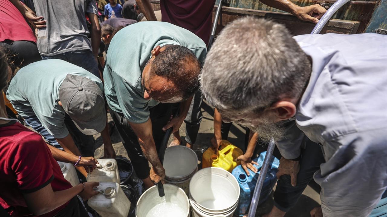 Gazze kentinde yerinden edilmiş Filistinler, tankerlerle dağıtılan suyu bidonlara doldurarak günlük su ihtiyaçlarını karşılamaya çalışıyor.