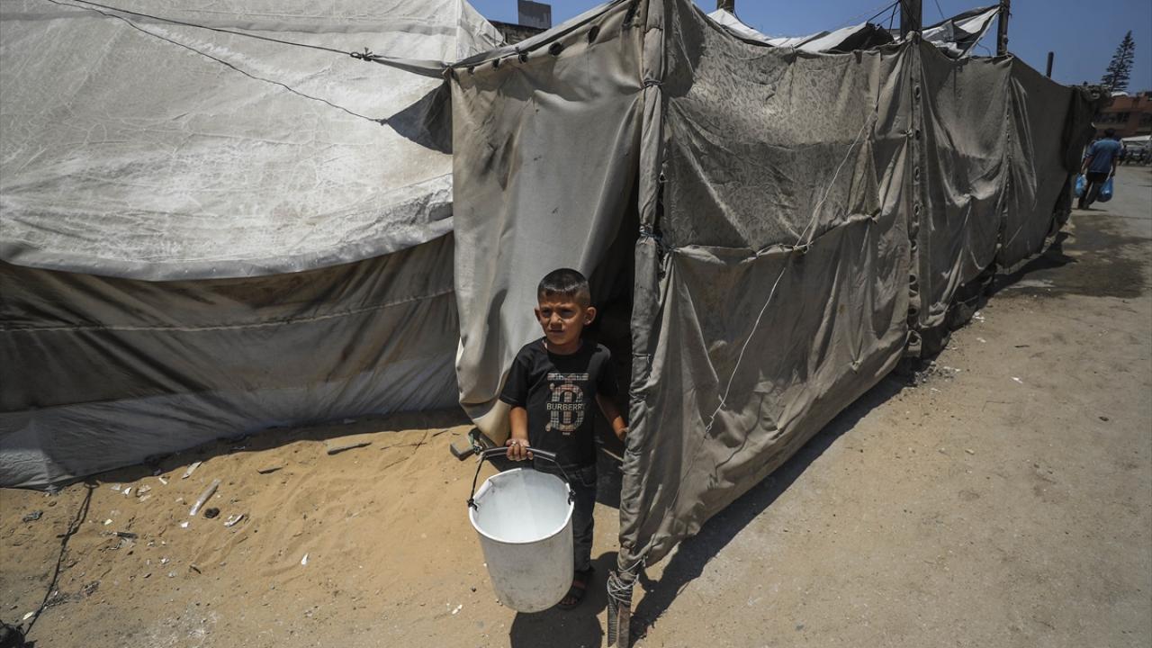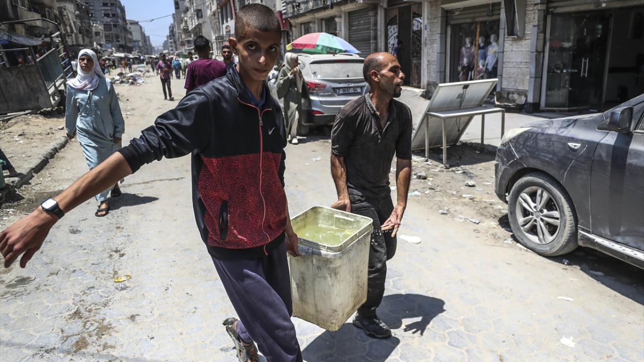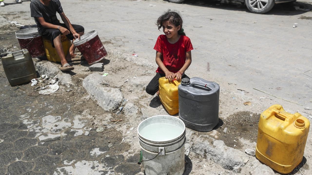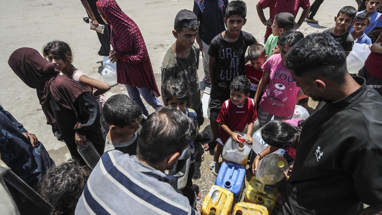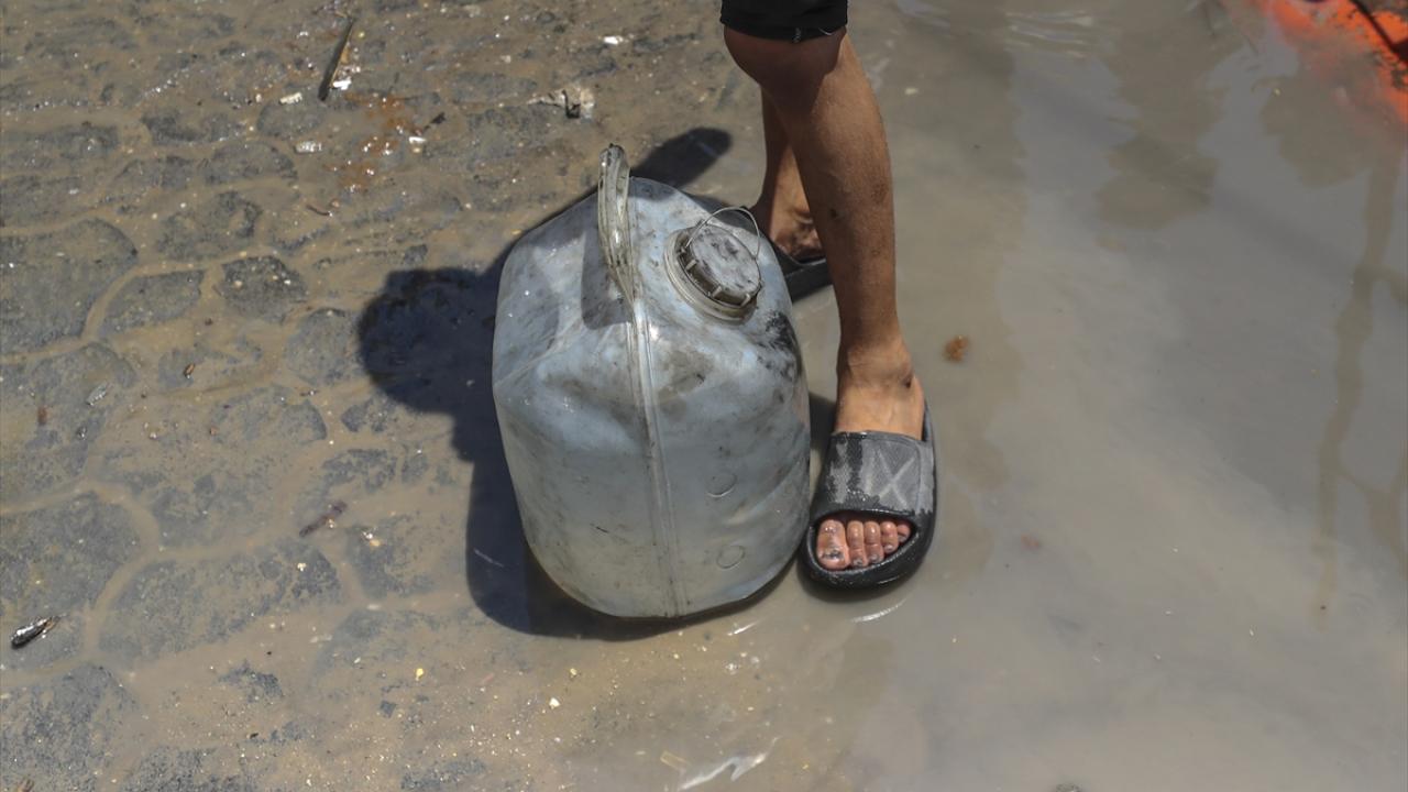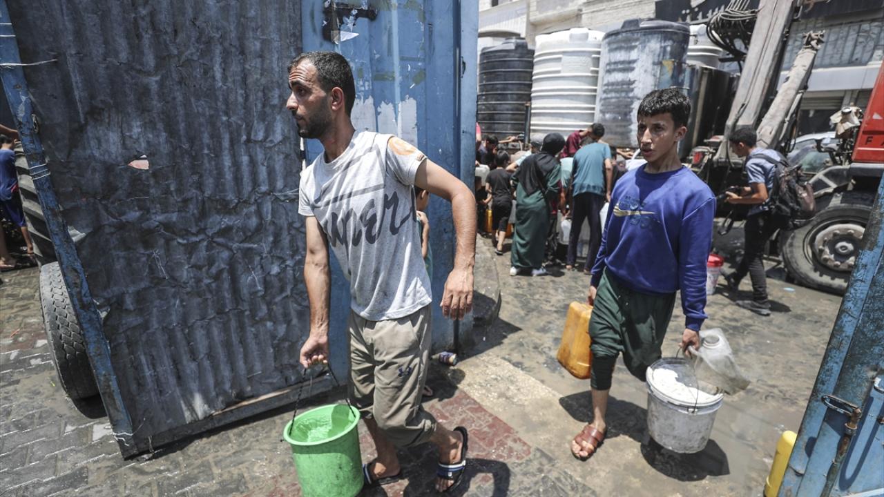 Gazze kentinde yerinden edilmiş Filistinler, tankerlerle dağıtılan suyu bidonlara doldurarak günlük su ihtiyaçlarını karşılamaya çalışıyor.