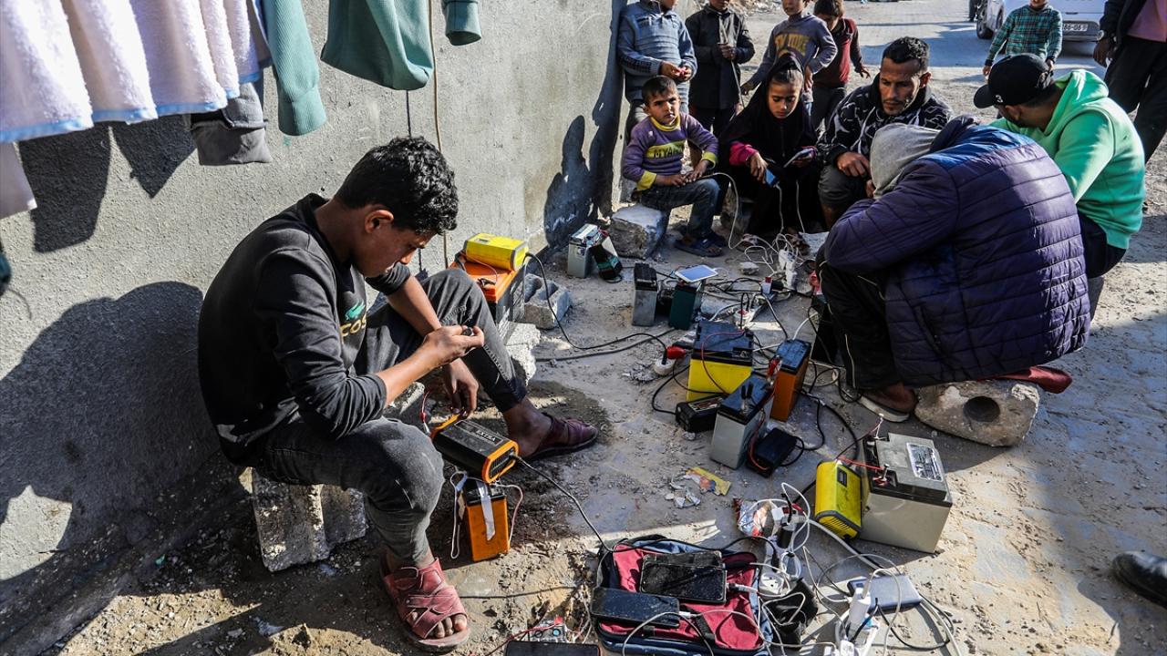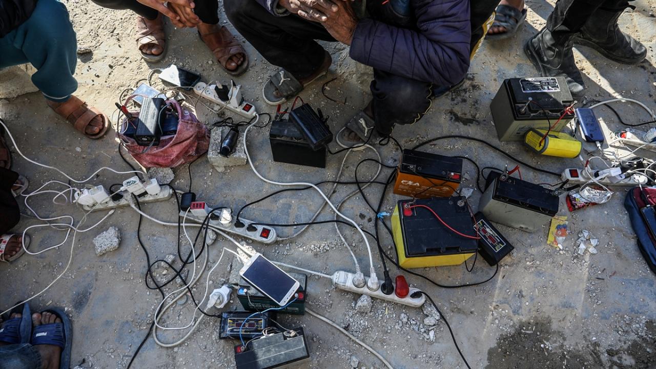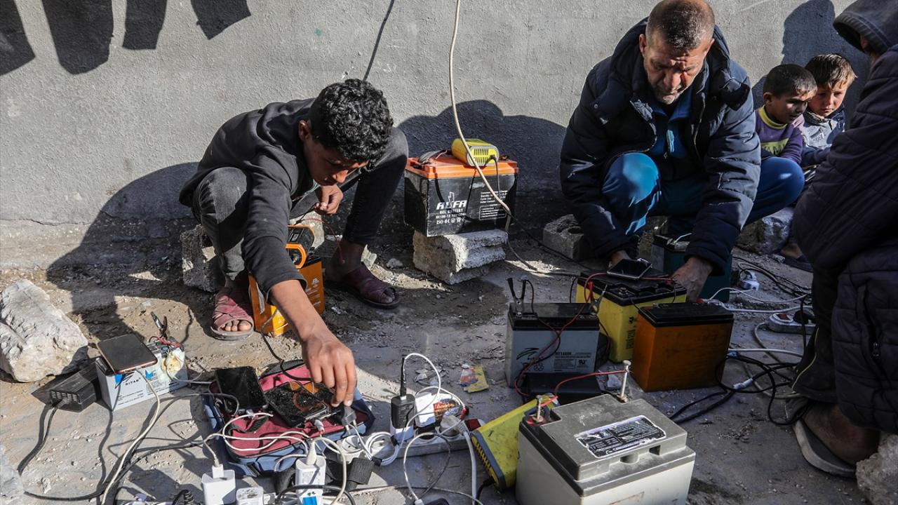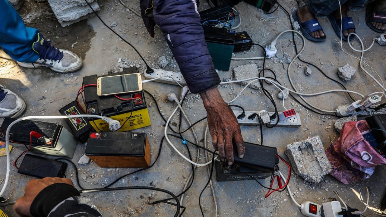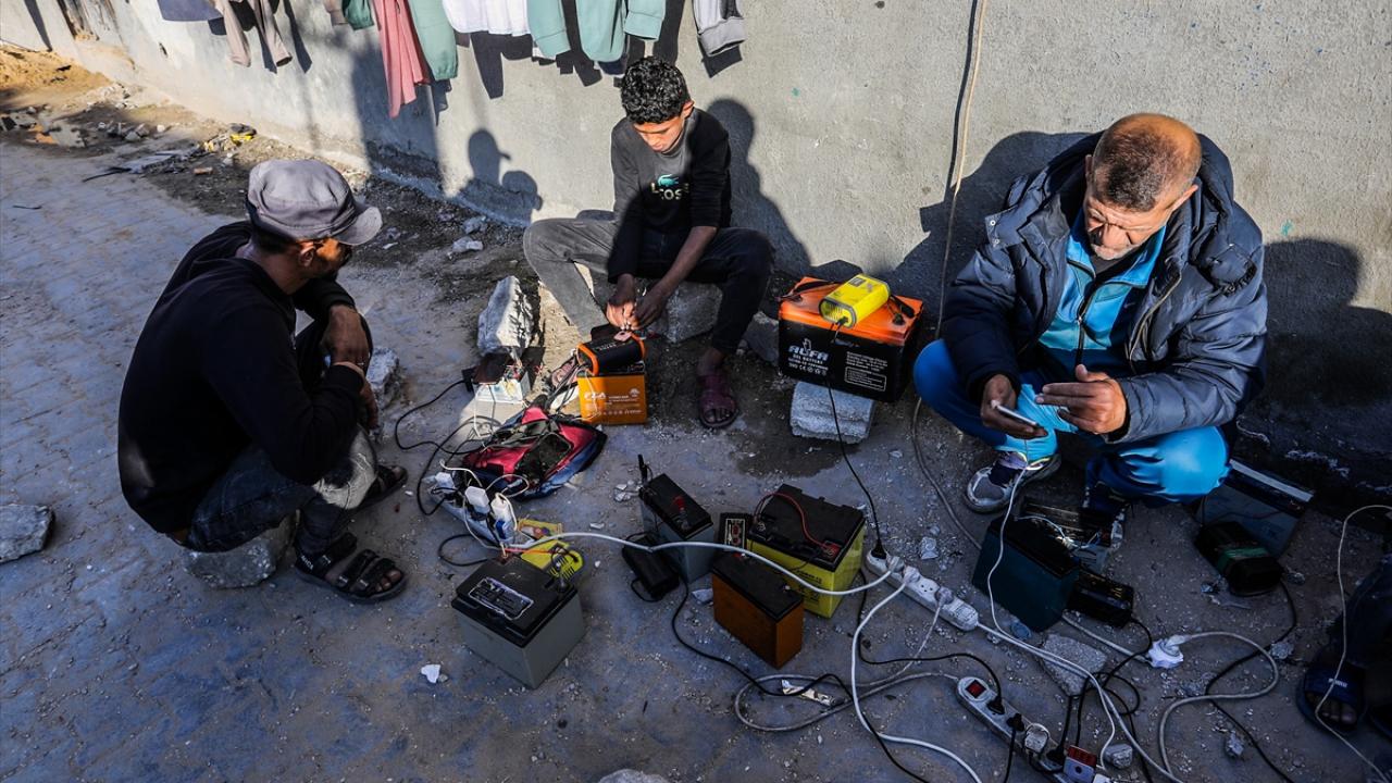 Elektrik erişiminin tamamen kısıtlandığı Gazze Şeridi`nin güneyindeki Han Yunus kentinde yaşayan Filistinliler, telefonlarını şarj edebilmek için akü ve güneş enerjisinden yararlanıyor.