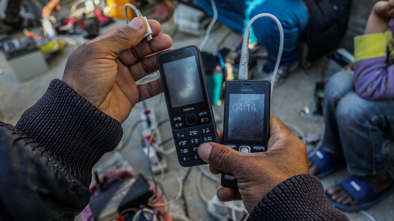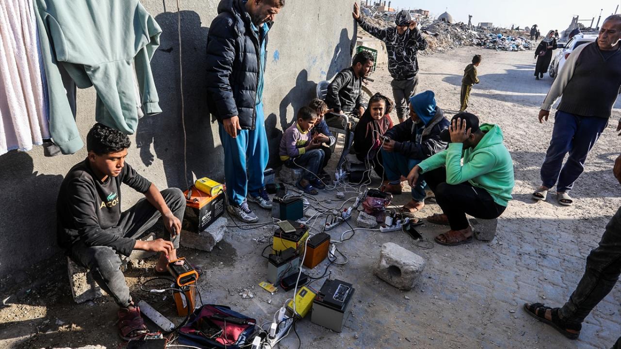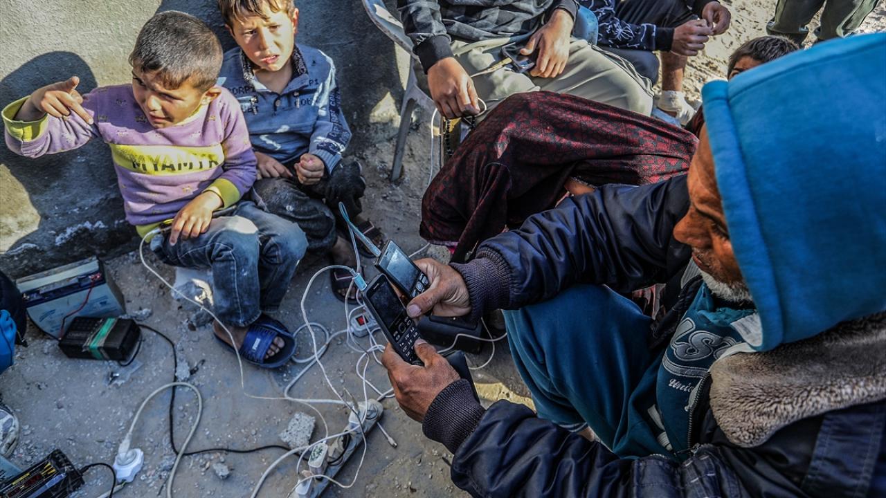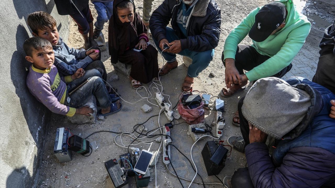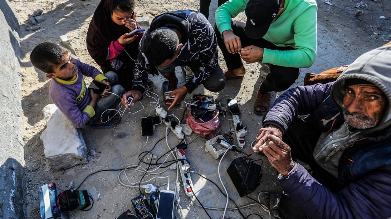 Elektrik erişiminin tamamen kısıtlandığı Gazze Şeridi`nin güneyindeki Han Yunus kentinde yaşayan Filistinliler, telefonlarını şarj edebilmek için akü ve güneş enerjisinden yararlanıyor.