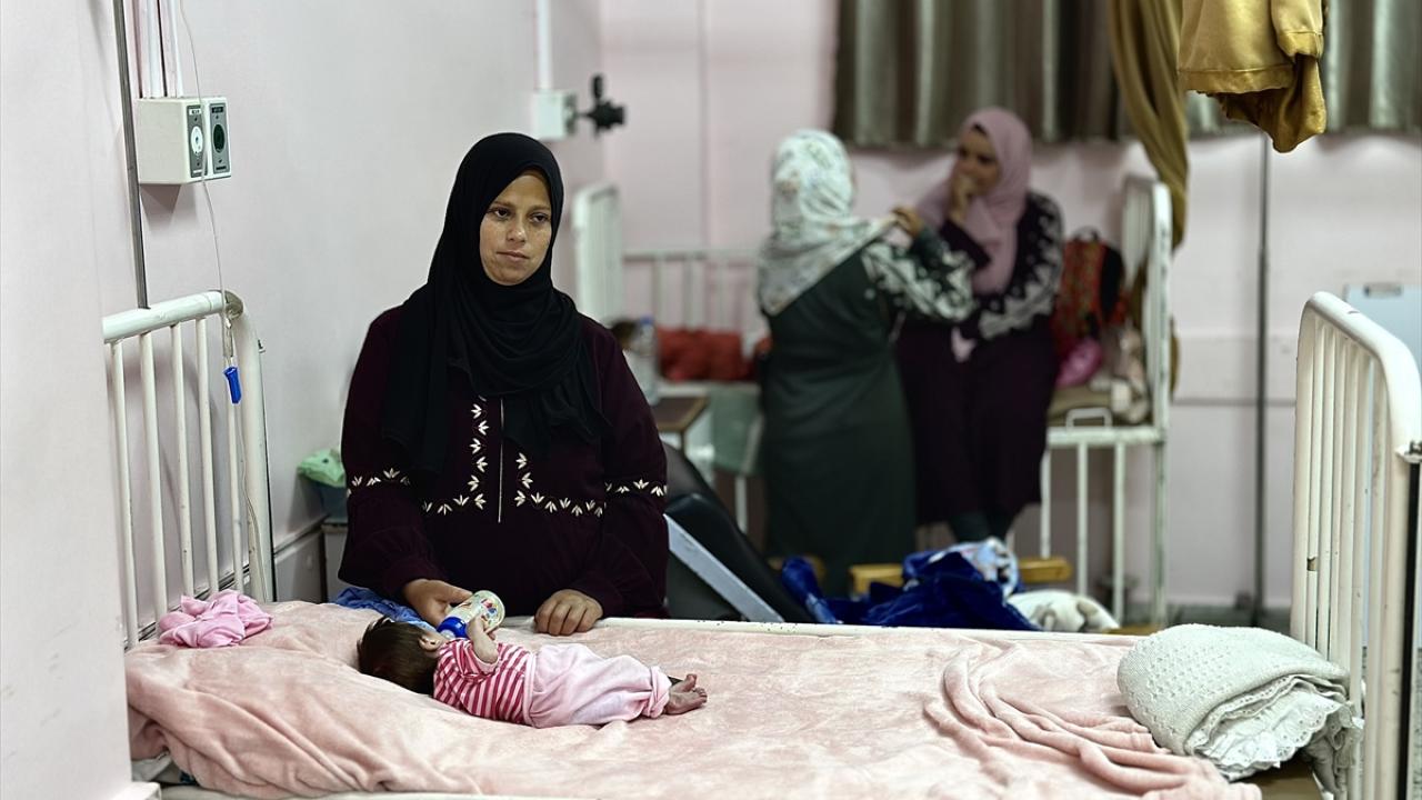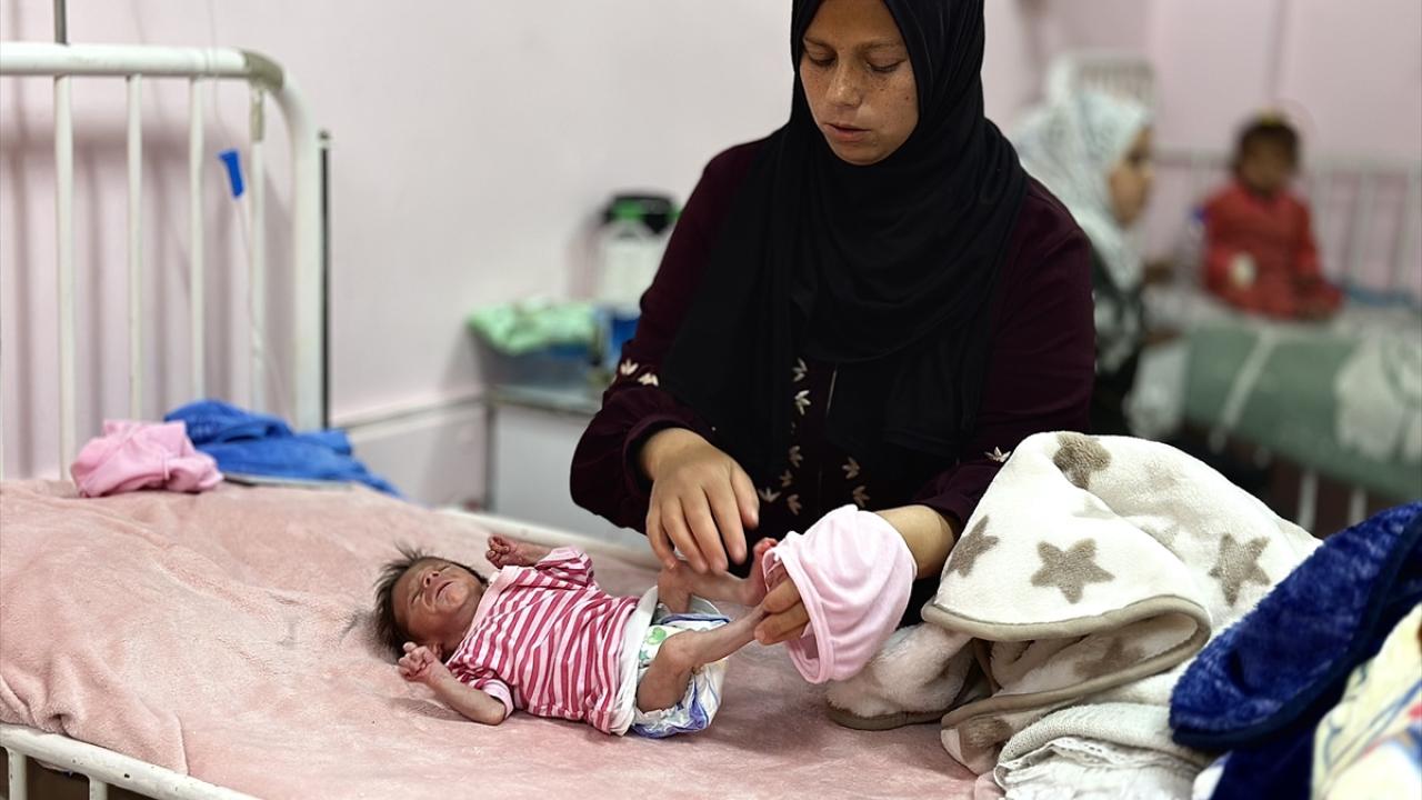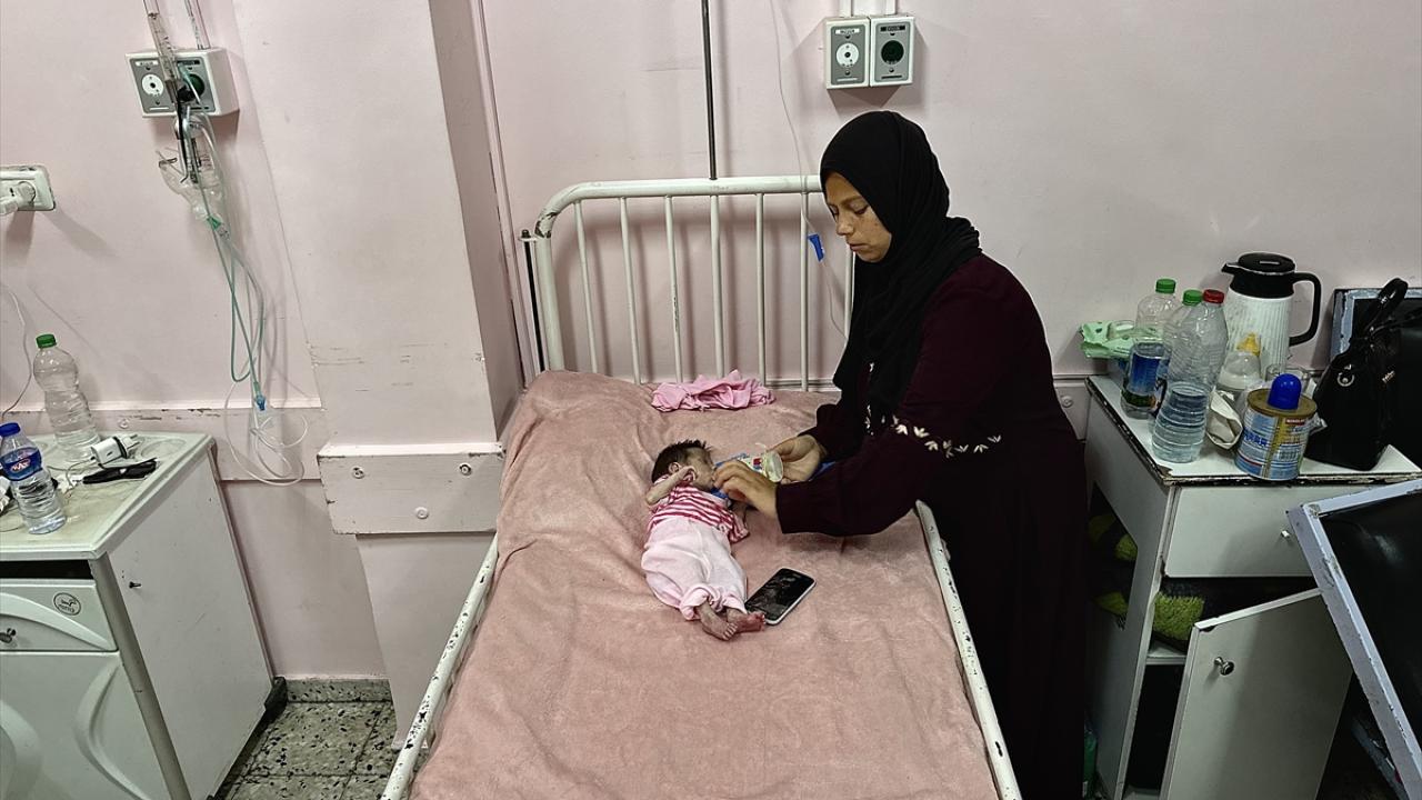 Yetersiz beslenme teşhisi konulan yüzlerce çocuktan biri olan 4 aylık Yusuf el-Neccar, Han Yunus kentindeki Nasır Hastanesi`nde tedavi görüyor.