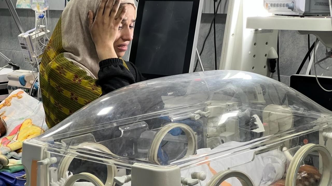Fotoğrafta bir bebeğin annesi kuvözün önünde ağlayarak bebeğine veda etti.