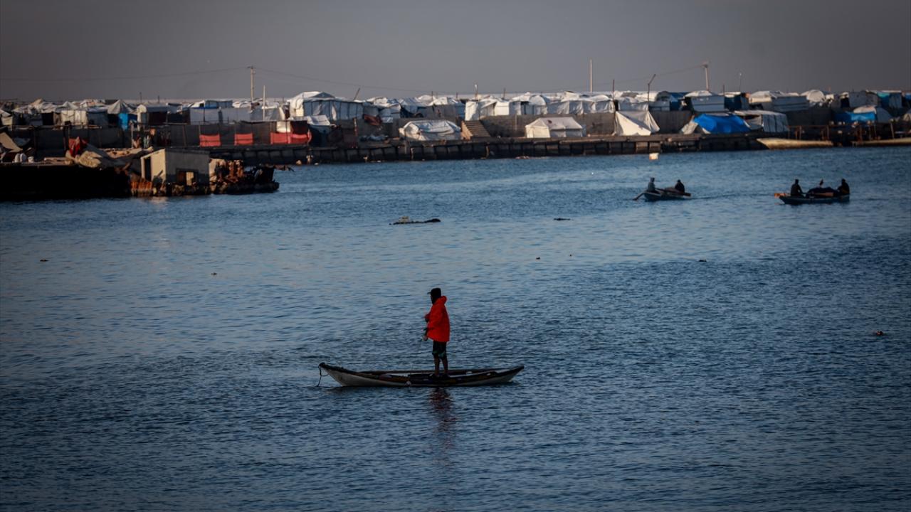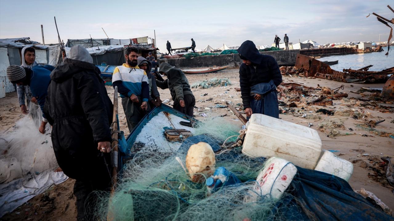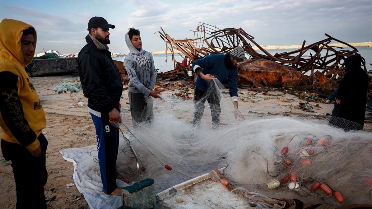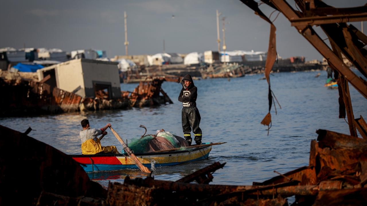 Gazze Limanı'ndaki Filistinli balıkçılar, saldırılarda zarar gören av ekipmanlarına rağmen ağ atarak geçimlerini sürdürmeye çalışıyor.