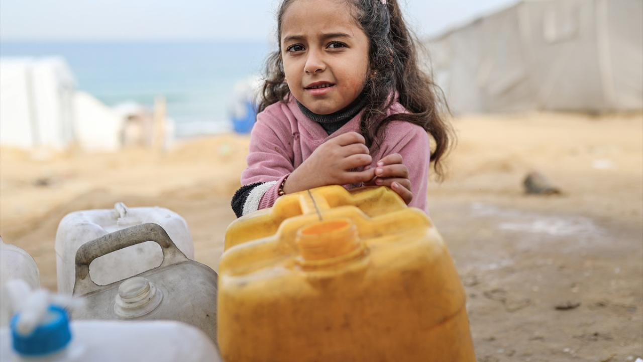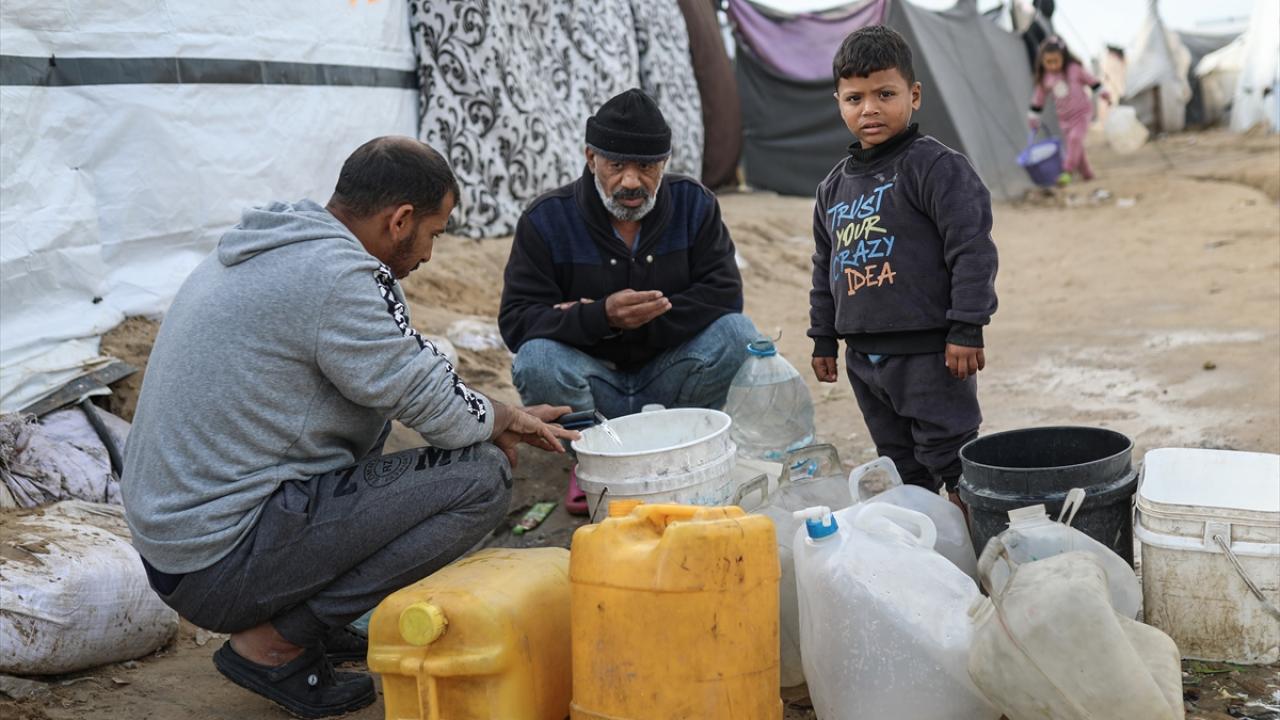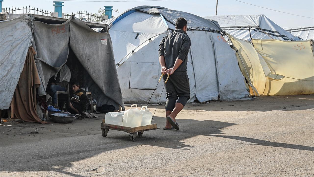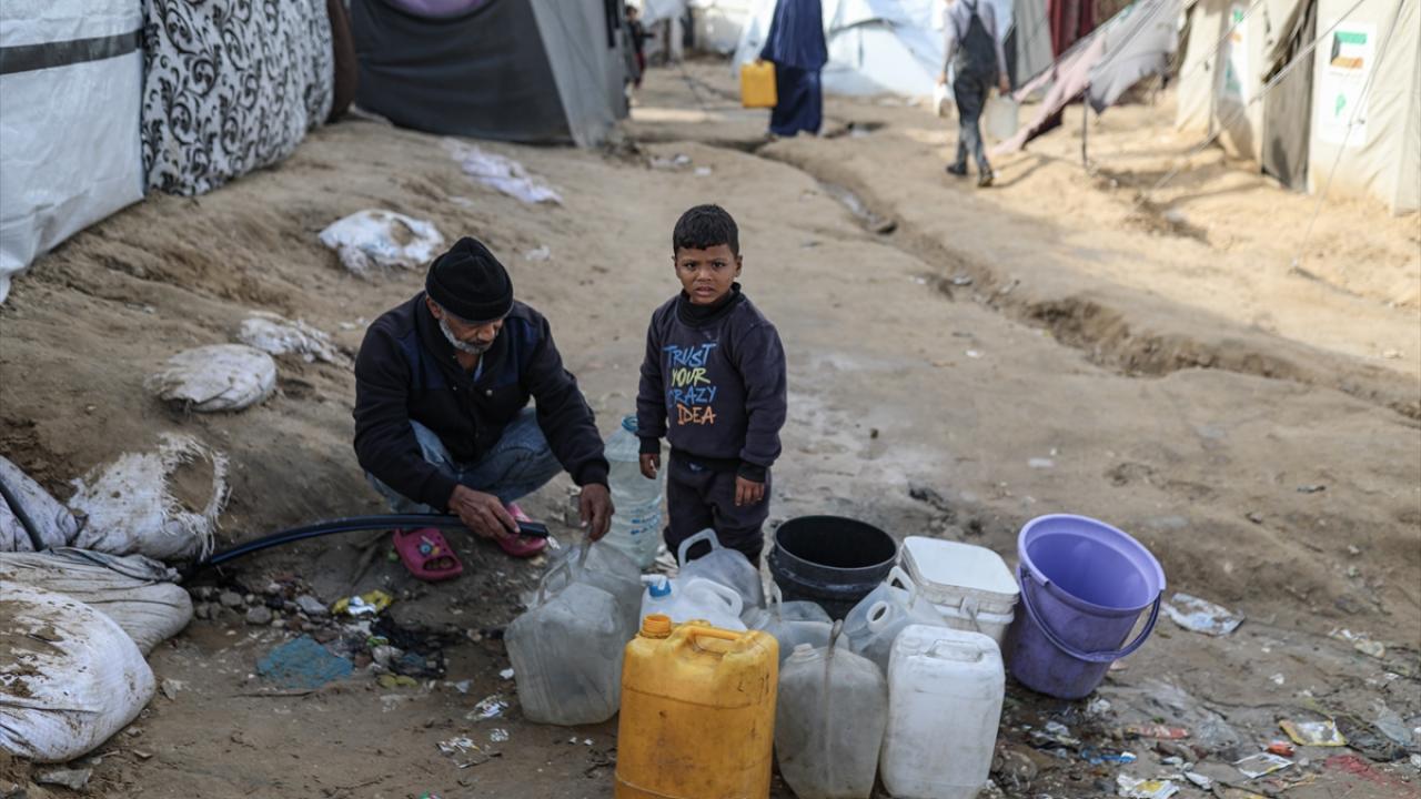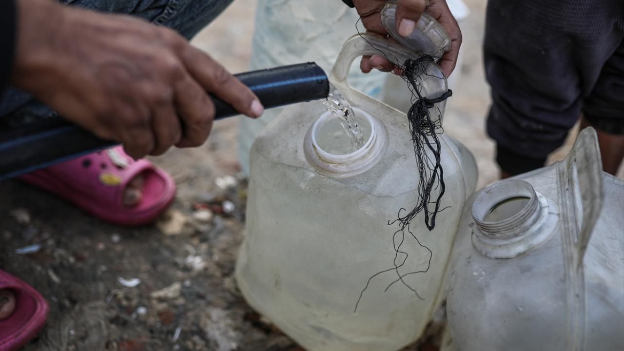 İsrail saldırıları sonucu altyapının ağır hasar gördüğü ve su krizinin yaşandığı Gazze Şeridi’nin orta kesimindeki Deyr Belah kentinde, yerinden edilen Filistinliler kaldıkları çadır kampta, bölgedeki sınırlı sayıdaki su kuyusu ve depolardan çıkarılan suyu bidonlara doldurarak günlük su ihtiyaçlarını karşılamaya çalışıyor.