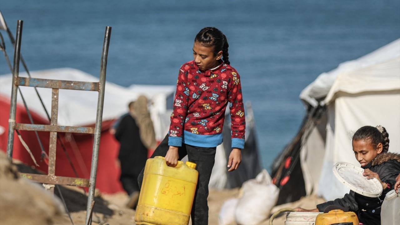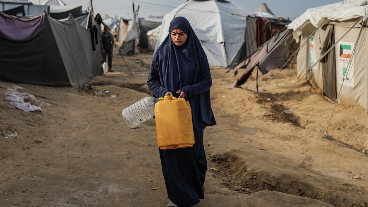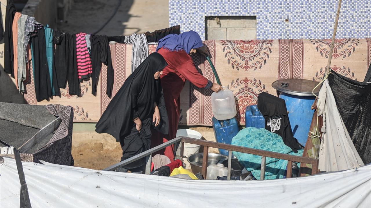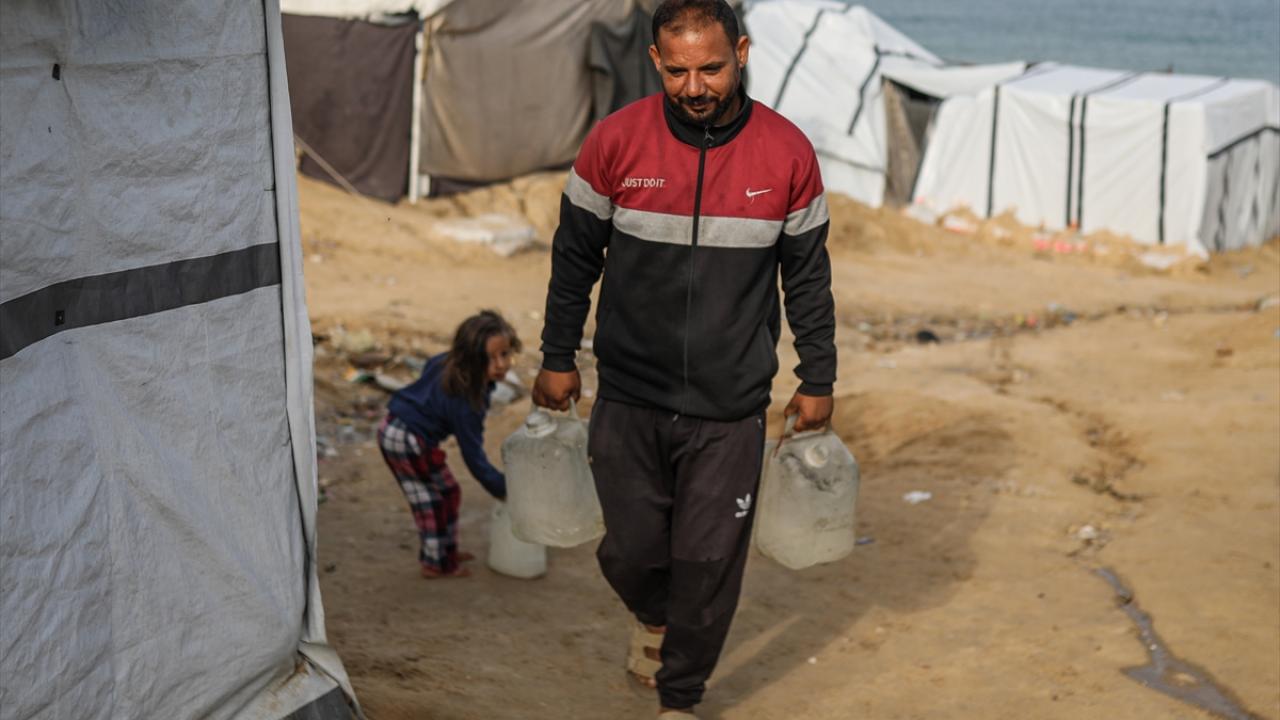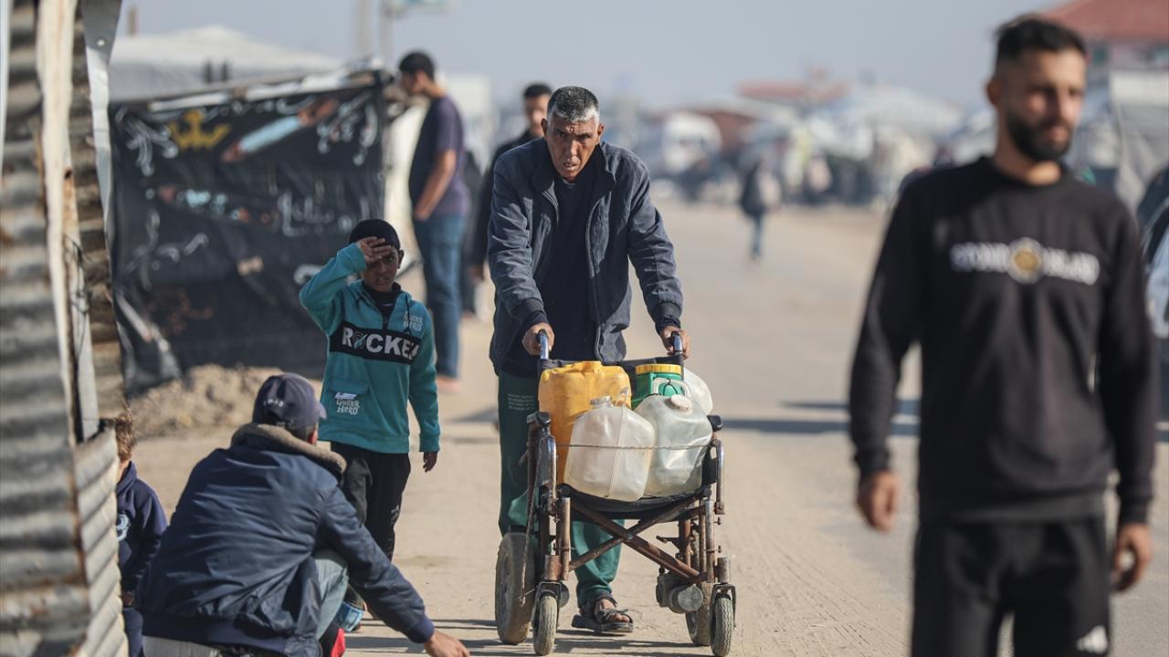 İsrail saldırıları sonucu altyapının ağır hasar gördüğü ve su krizinin yaşandığı Gazze Şeridi’nin orta kesimindeki Deyr Belah kentinde, yerinden edilen Filistinliler kaldıkları çadır kampta, bölgedeki sınırlı sayıdaki su kuyusu ve depolardan çıkarılan suyu bidonlara doldurarak günlük su ihtiyaçlarını karşılamaya çalışıyor.