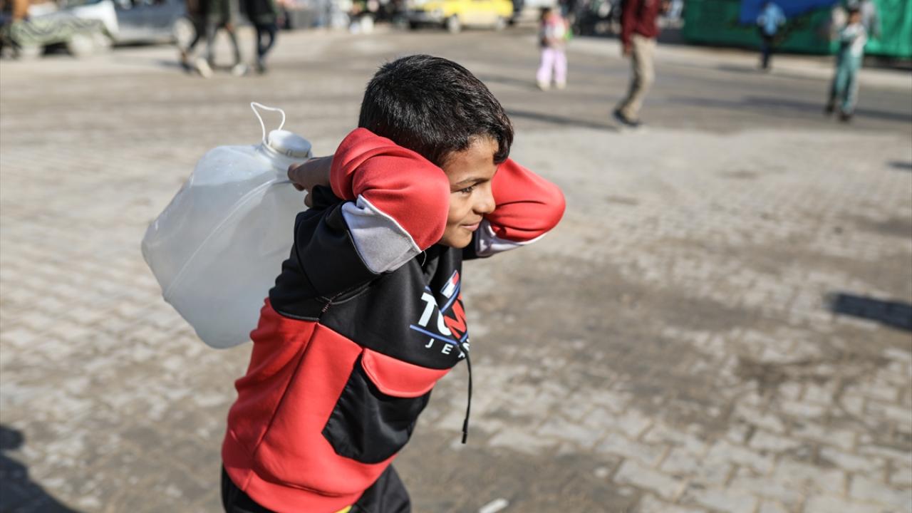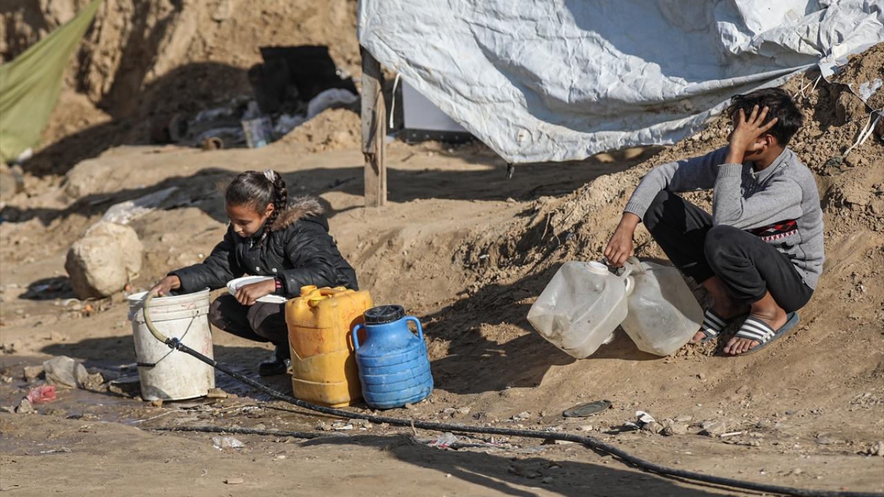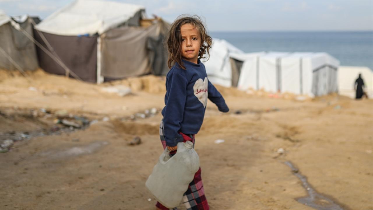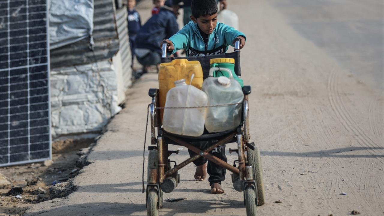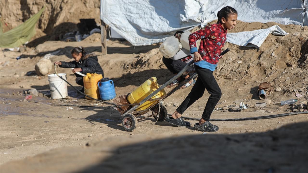 İsrail saldırıları sonucu altyapının ağır hasar gördüğü ve su krizinin yaşandığı Gazze Şeridi’nin orta kesimindeki Deyr Belah kentinde, yerinden edilen Filistinliler kaldıkları çadır kampta, bölgedeki sınırlı sayıdaki su kuyusu ve depolardan çıkarılan suyu bidonlara doldurarak günlük su ihtiyaçlarını karşılamaya çalışıyor.
