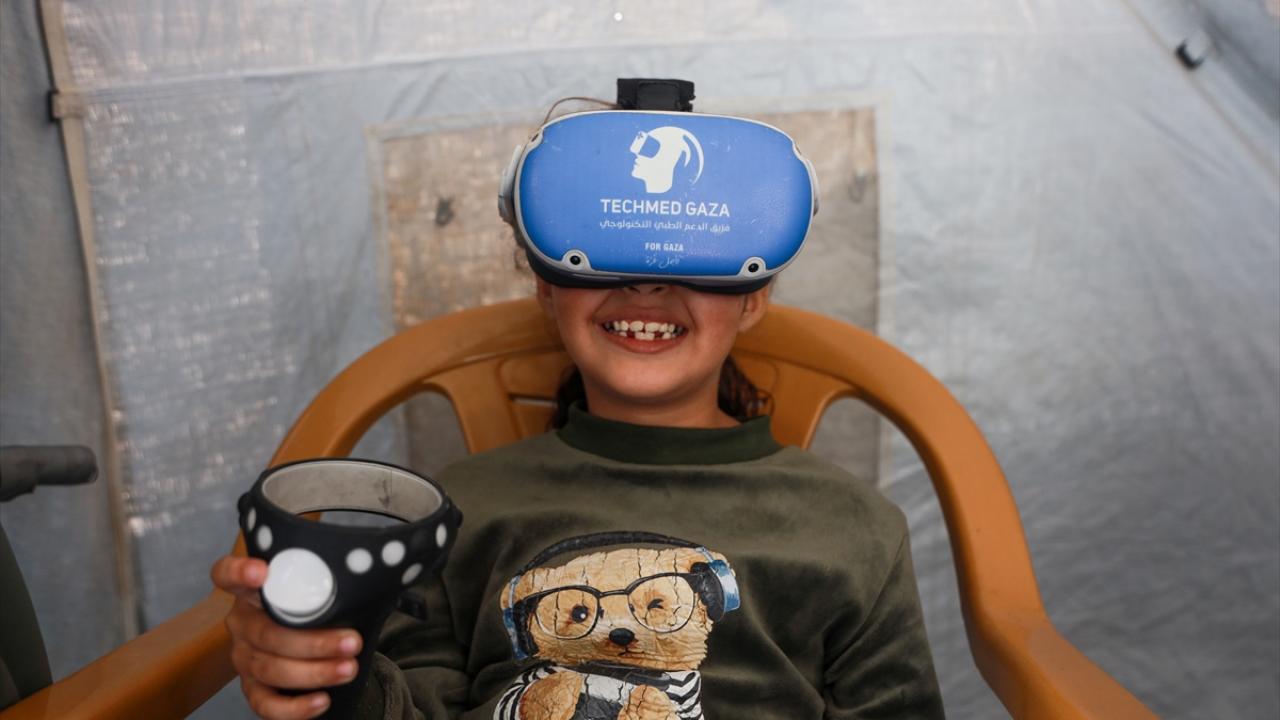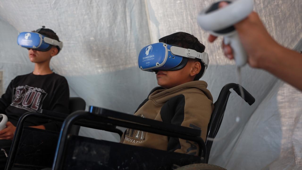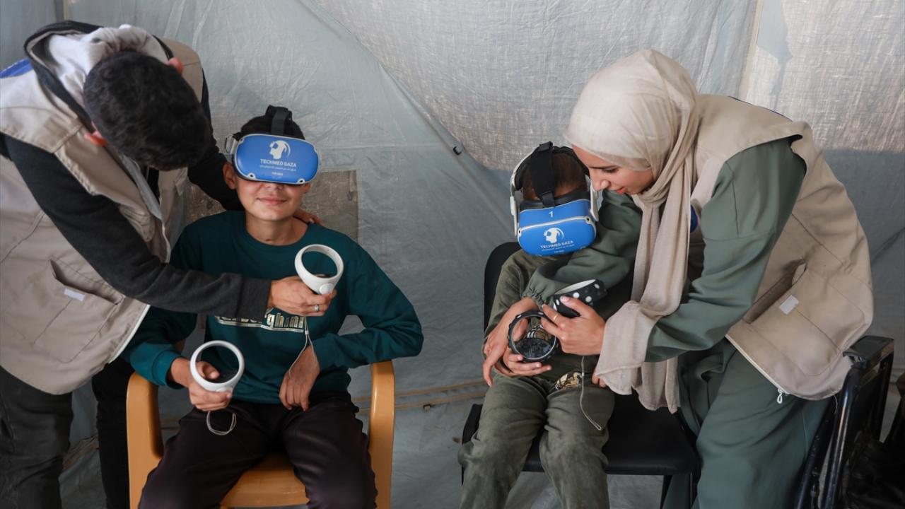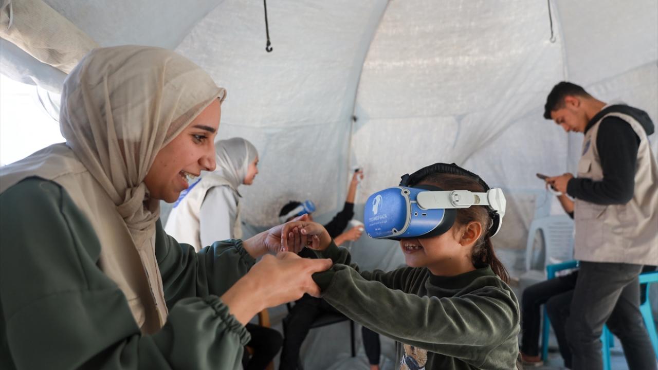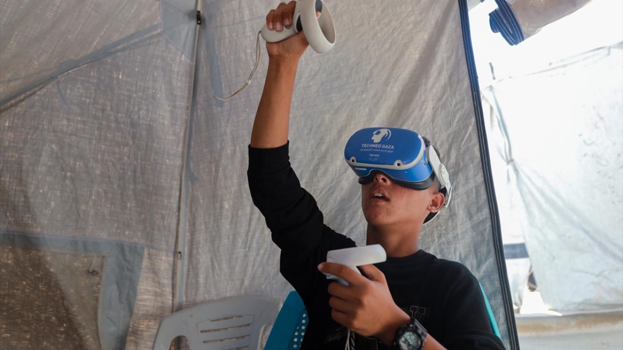 Gazze Şeridi'nin orta kesimindeki Zuveyde bölgesindeki sağlık ekipleri, savaşın psikolojik etkileriyle mücadele eden çocuklara sanal gerçeklik teknolojisiyle terapi uyguluyor.