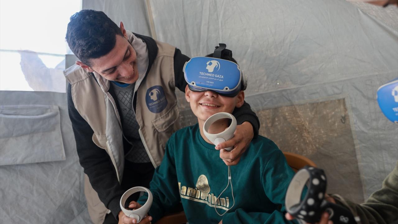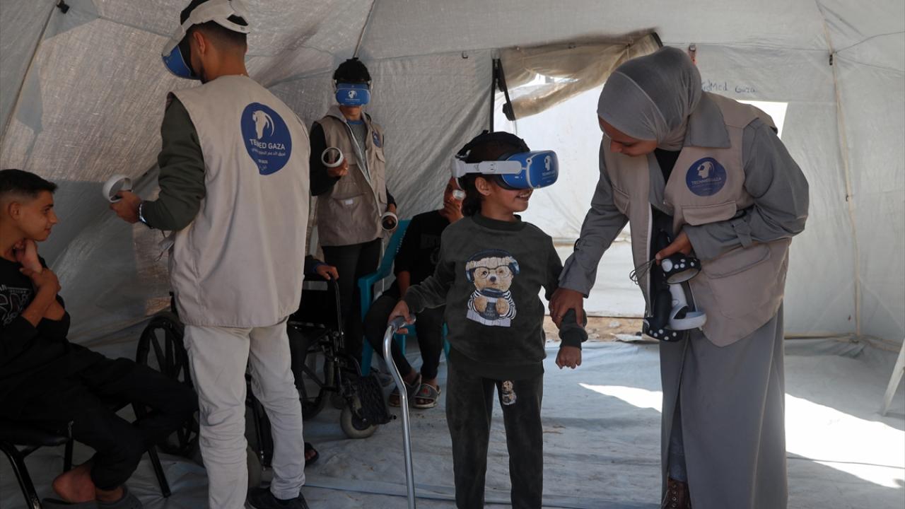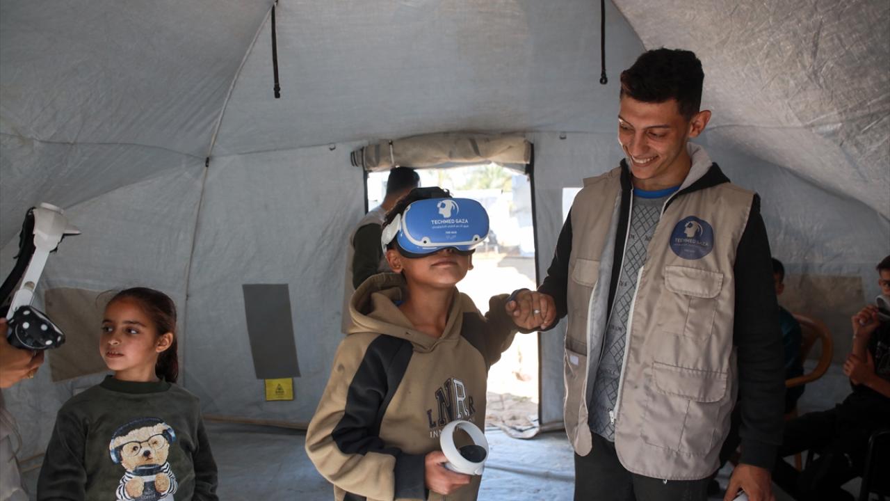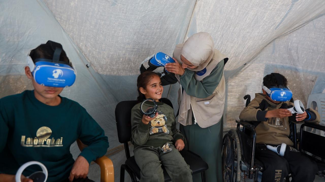 Gazze Şeridi'nin orta kesimindeki Zuveyde bölgesindeki sağlık ekipleri, savaşın psikolojik etkileriyle mücadele eden çocuklara sanal gerçeklik teknolojisiyle terapi uyguluyor.