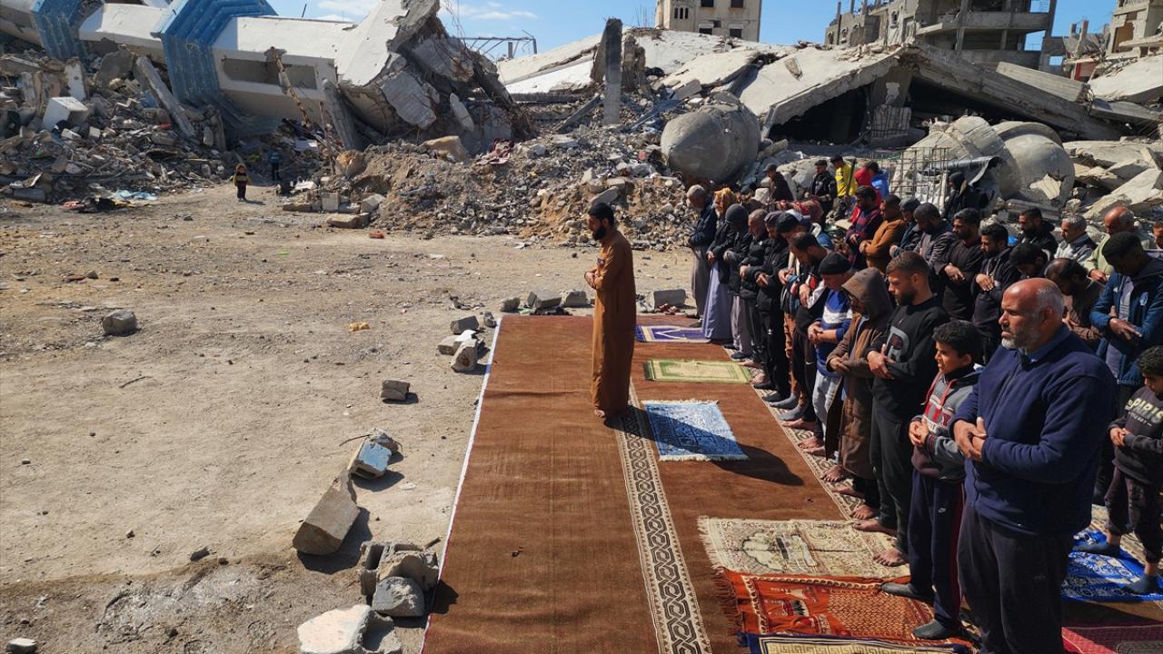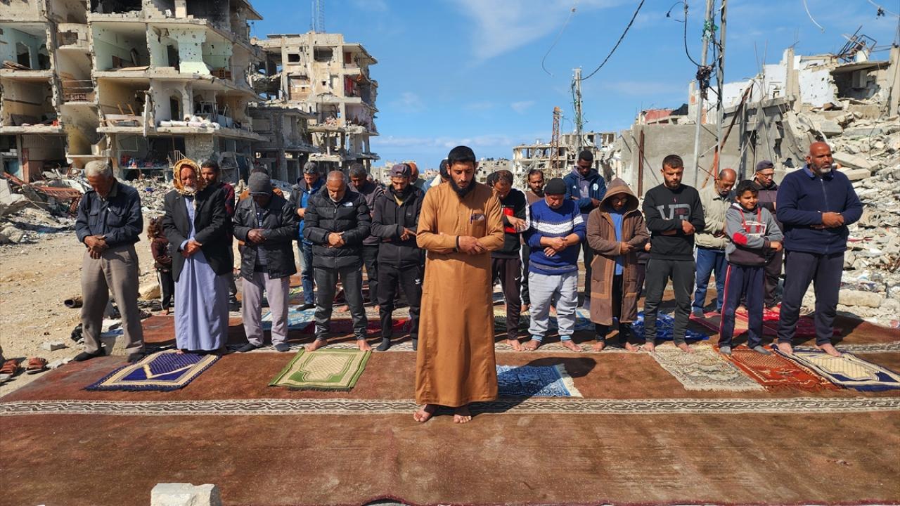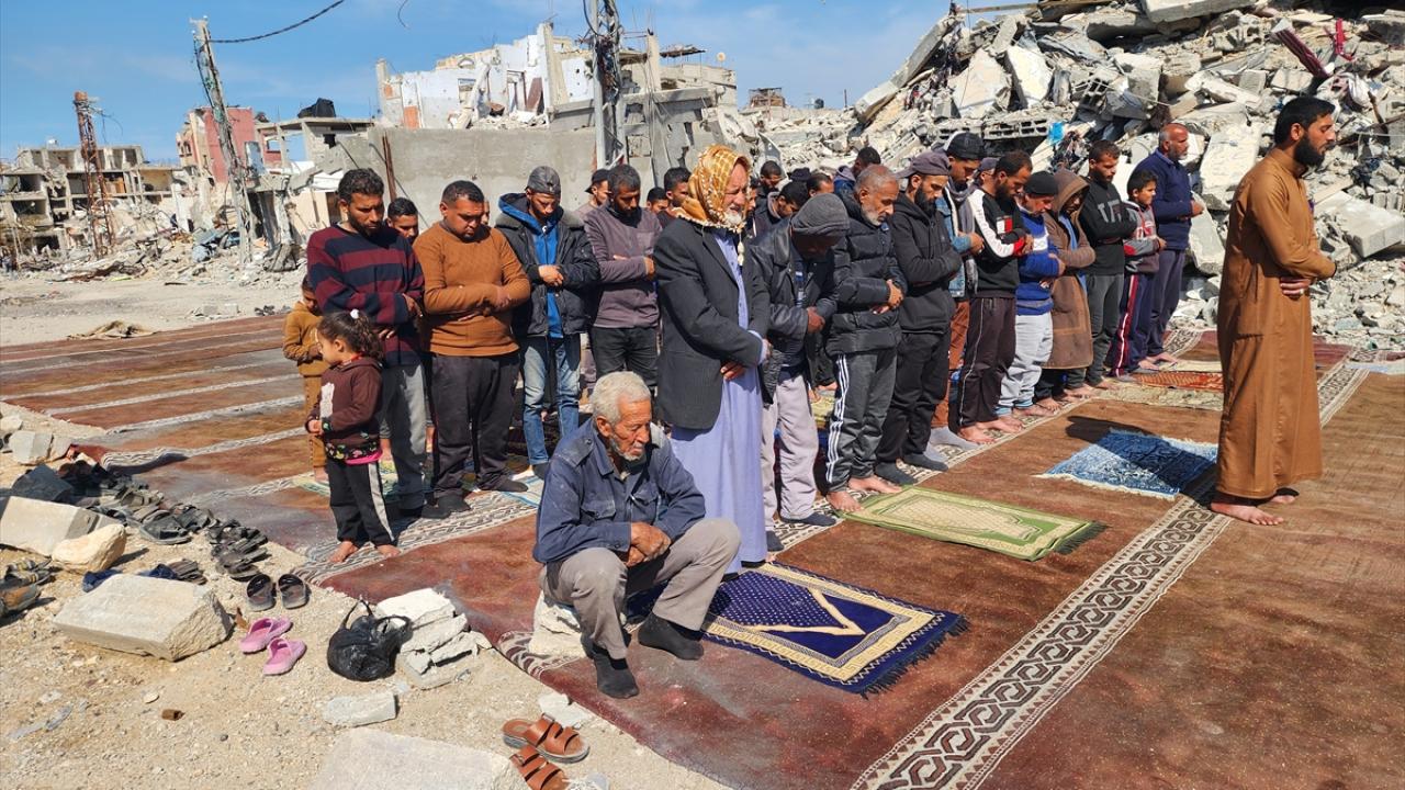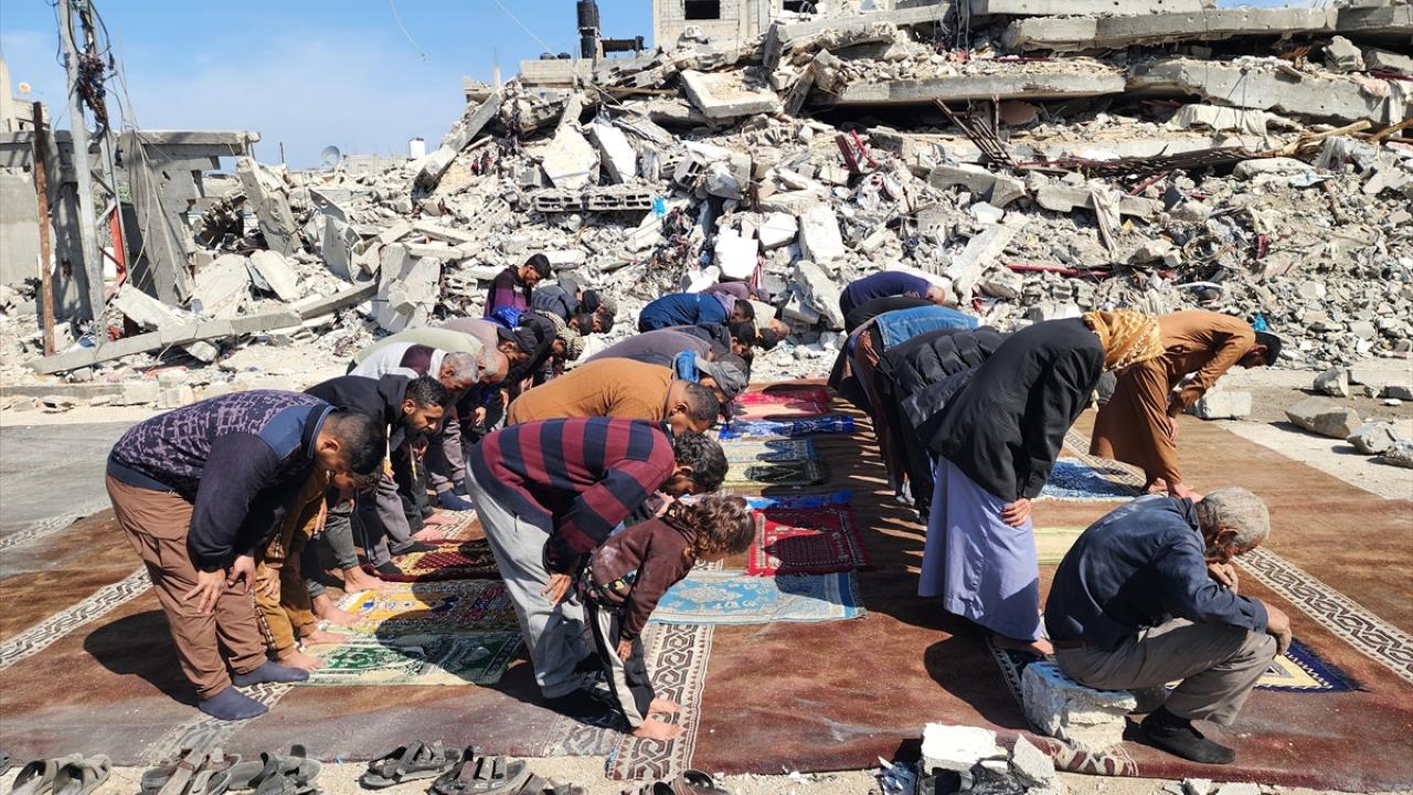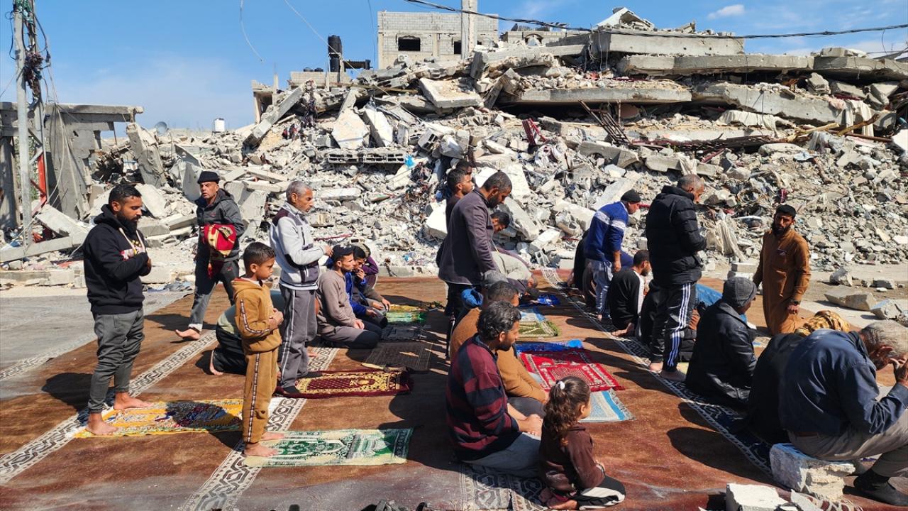 İsrail saldırıları sonucu ağır hasar alıp yerle bir olmasına rağmen Gazze'nin güneyindeki Refah kentinde bulunan el-Faruk Camisi'nin yanında toplanan Filistinliler, moloz ve yıkıntıların arasında cuma namazını kıldı.