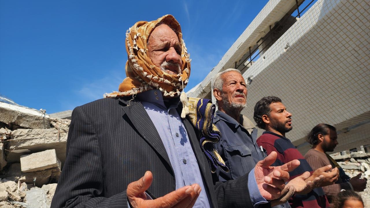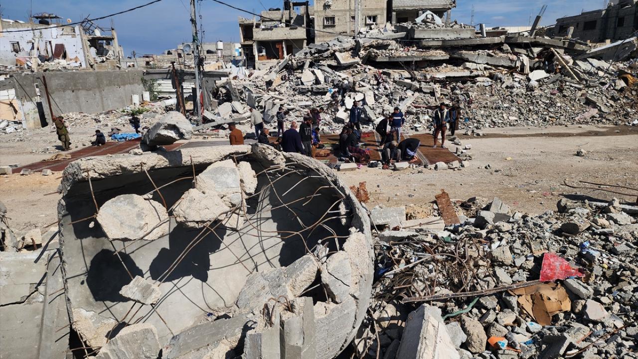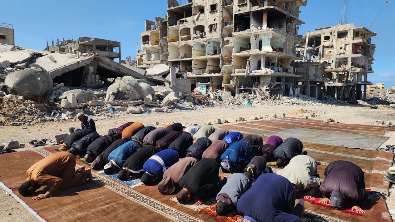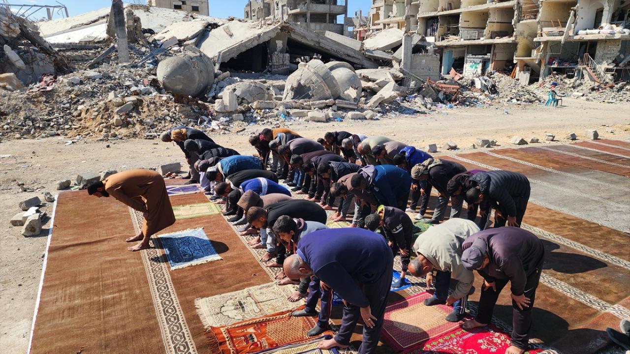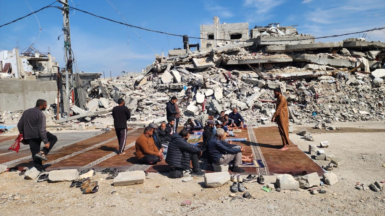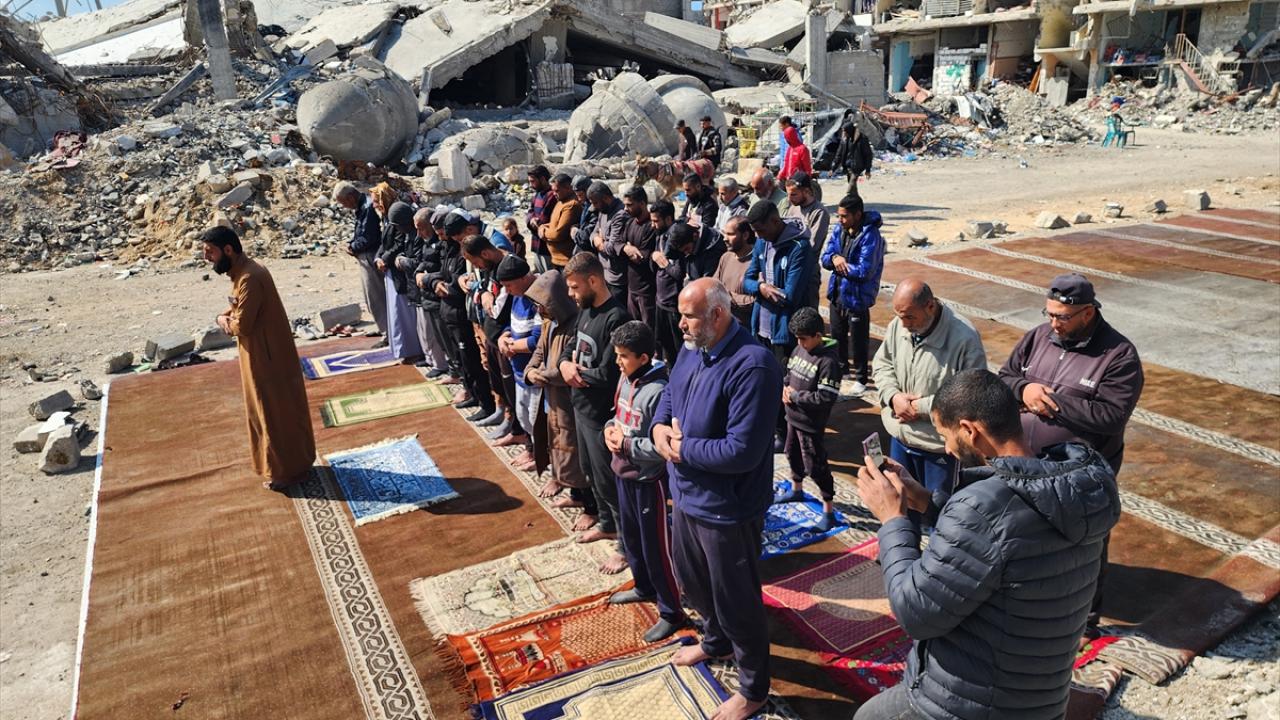 İsrail saldırıları sonucu ağır hasar alıp yerle bir olmasına rağmen Gazze'nin güneyindeki Refah kentinde bulunan el-Faruk Camisi'nin yanında toplanan Filistinliler, moloz ve yıkıntıların arasında cuma namazını kıldı.