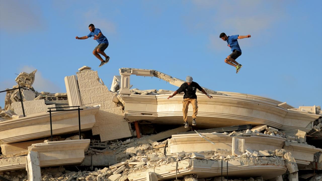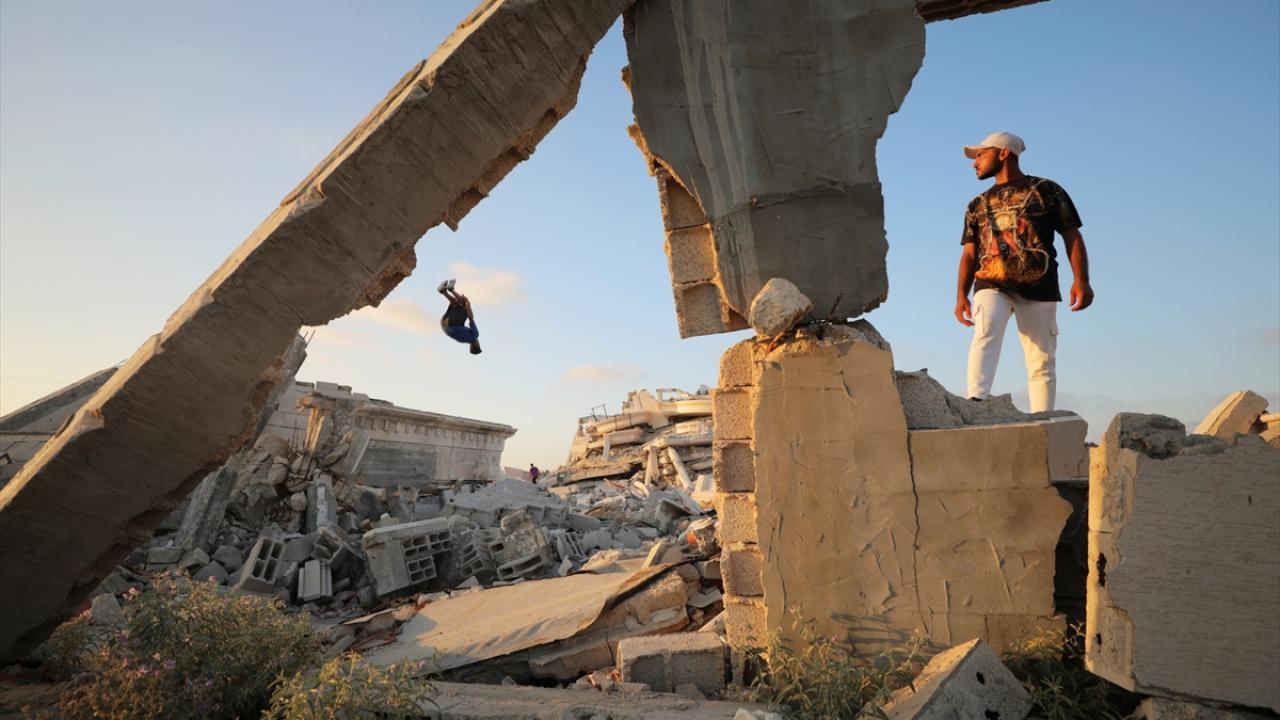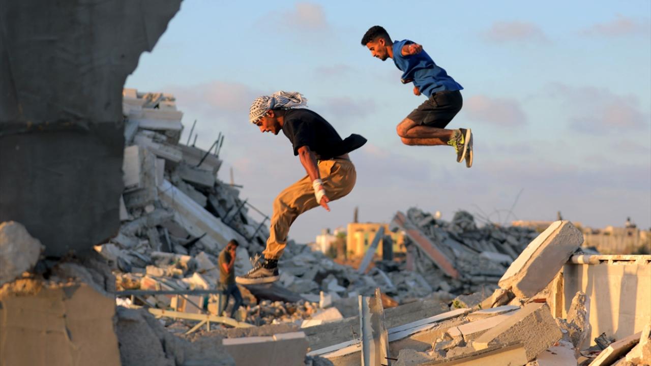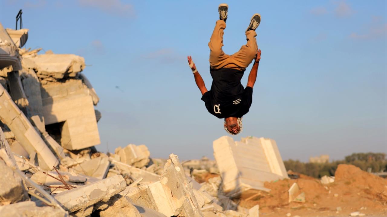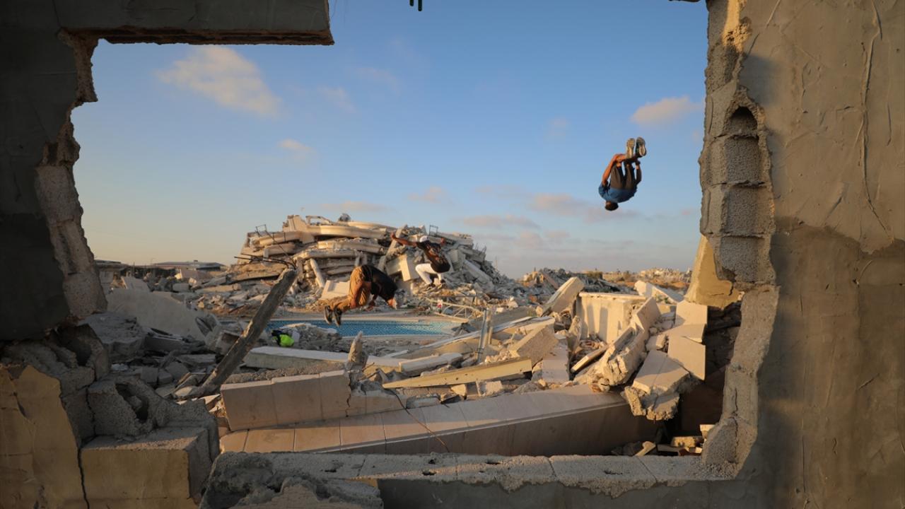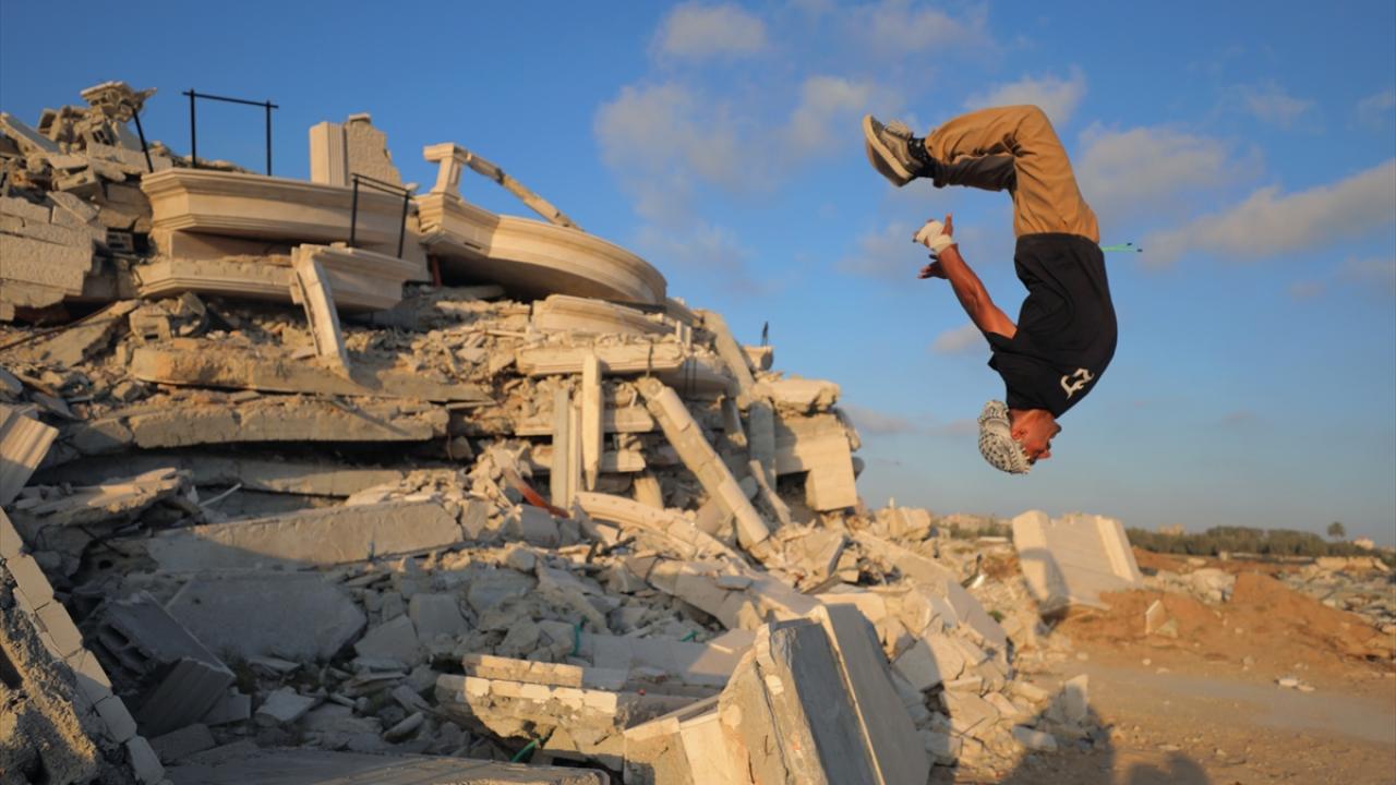 Gazze Şeridi'nin orta kesimindeki Bureyc Bölgesinde bir araya gelen Gazzeli parkur sporcuları, bölgedeki yıkıma dikkat çekmek için harabe halindeki binaların zorlu engellerine aldırmadan akrobatik atlayışlarla hünerlerini sergiledi.