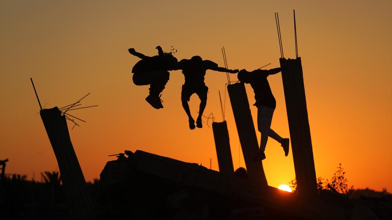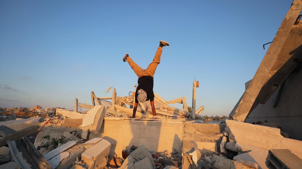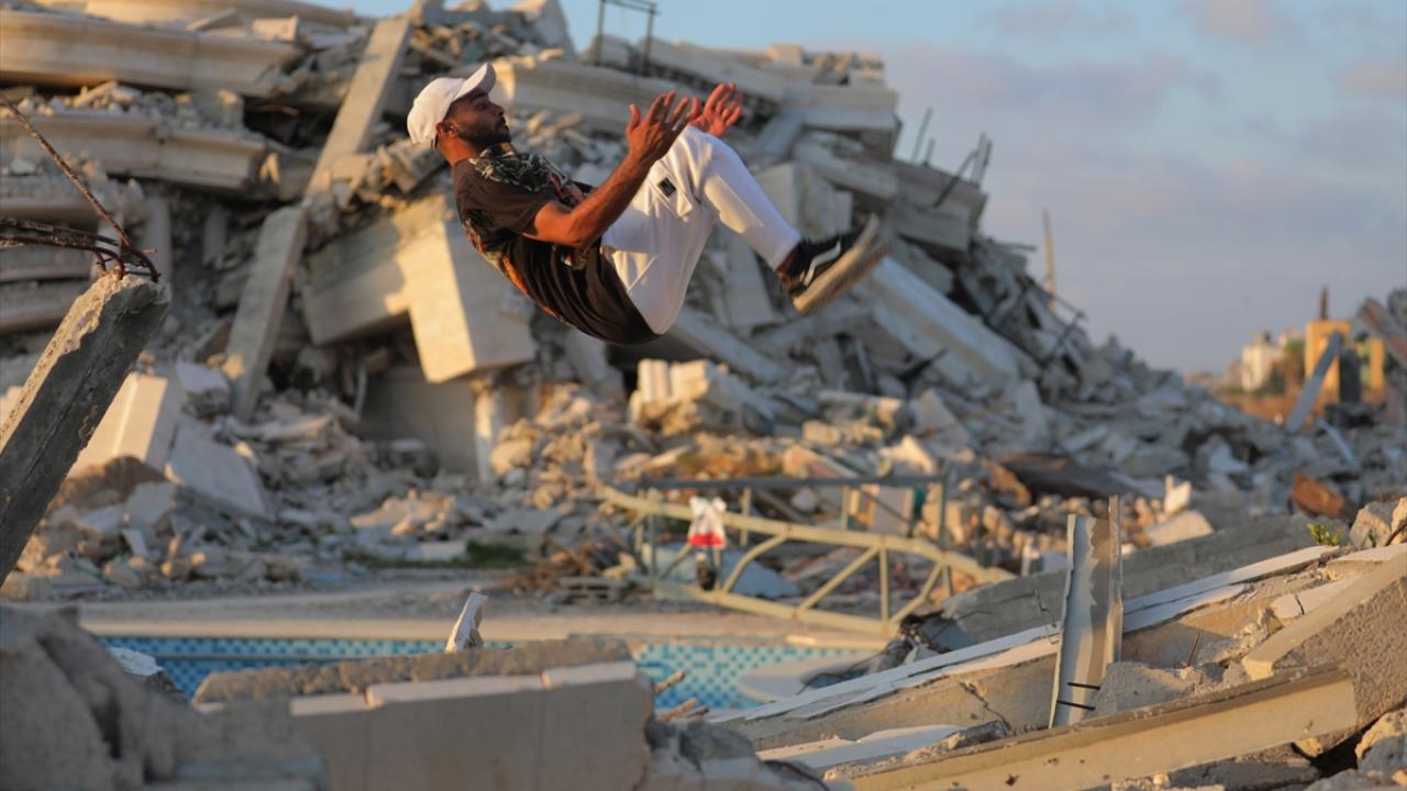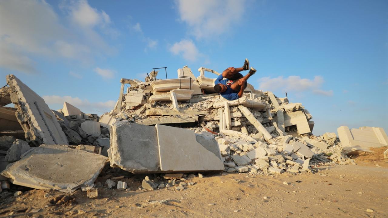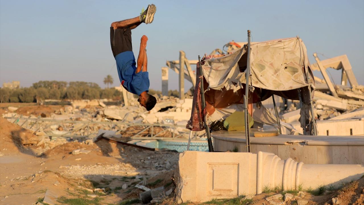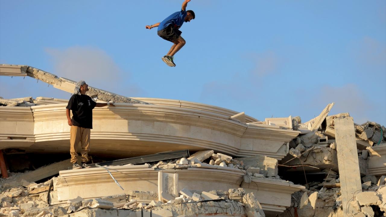 Gazze Şeridi'nin orta kesimindeki Bureyc Bölgesinde bir araya gelen Gazzeli parkur sporcuları, bölgedeki yıkıma dikkat çekmek için harabe halindeki binaların zorlu engellerine aldırmadan akrobatik atlayışlarla hünerlerini sergiledi.