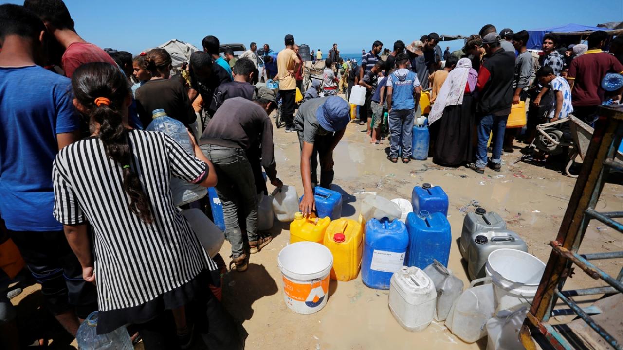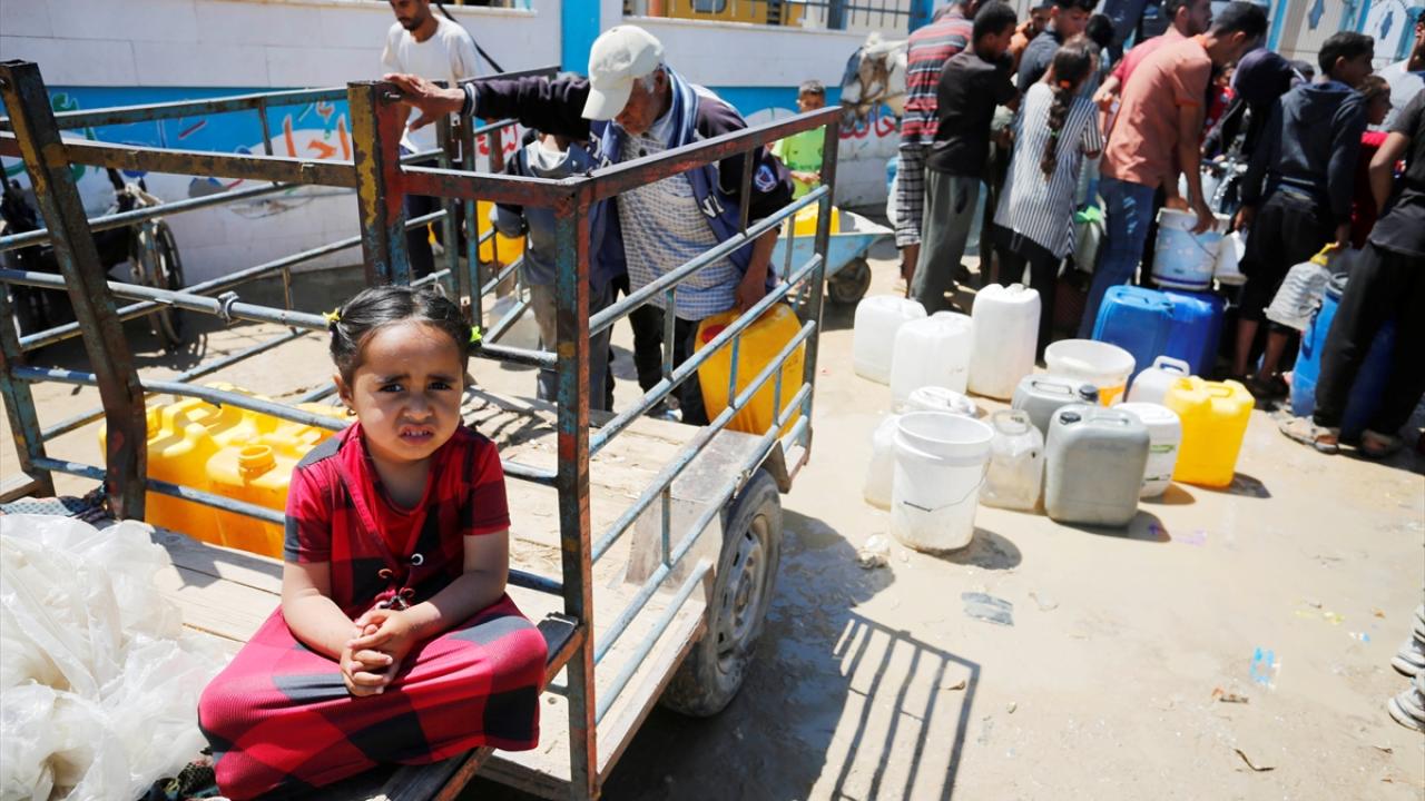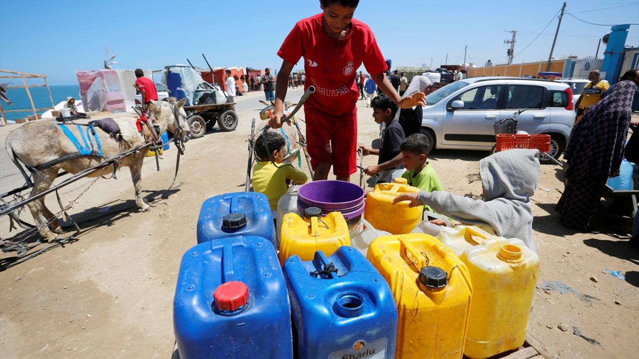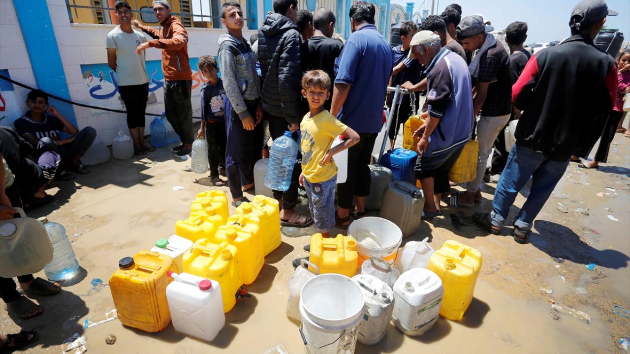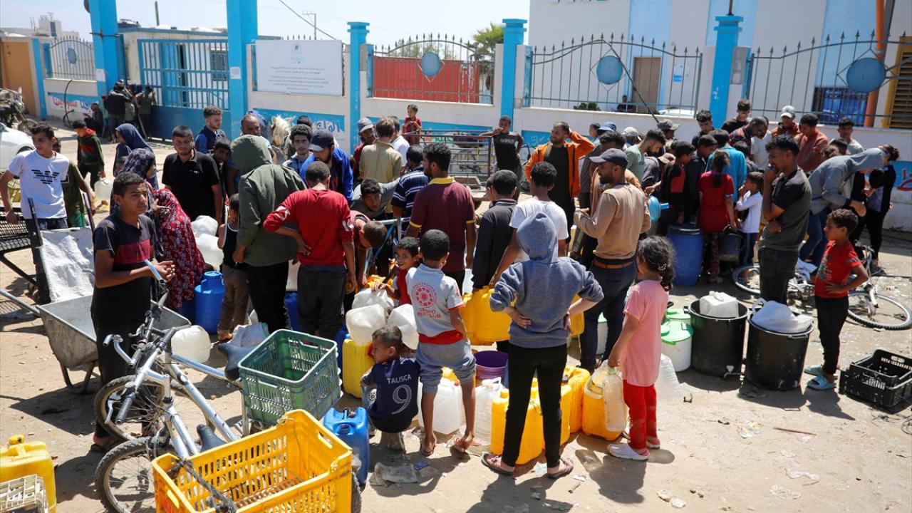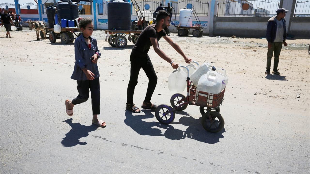 Refah`ın doğusundaki mahallelerinde göç ederek Deyr Balah kentine gelen Filistinliler, ailelerine su temin etmek için sıra bekledi.