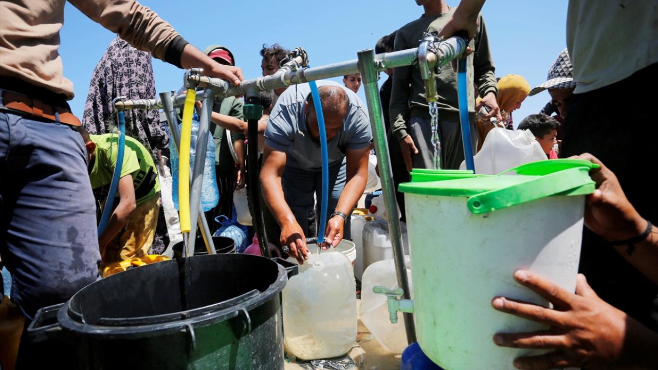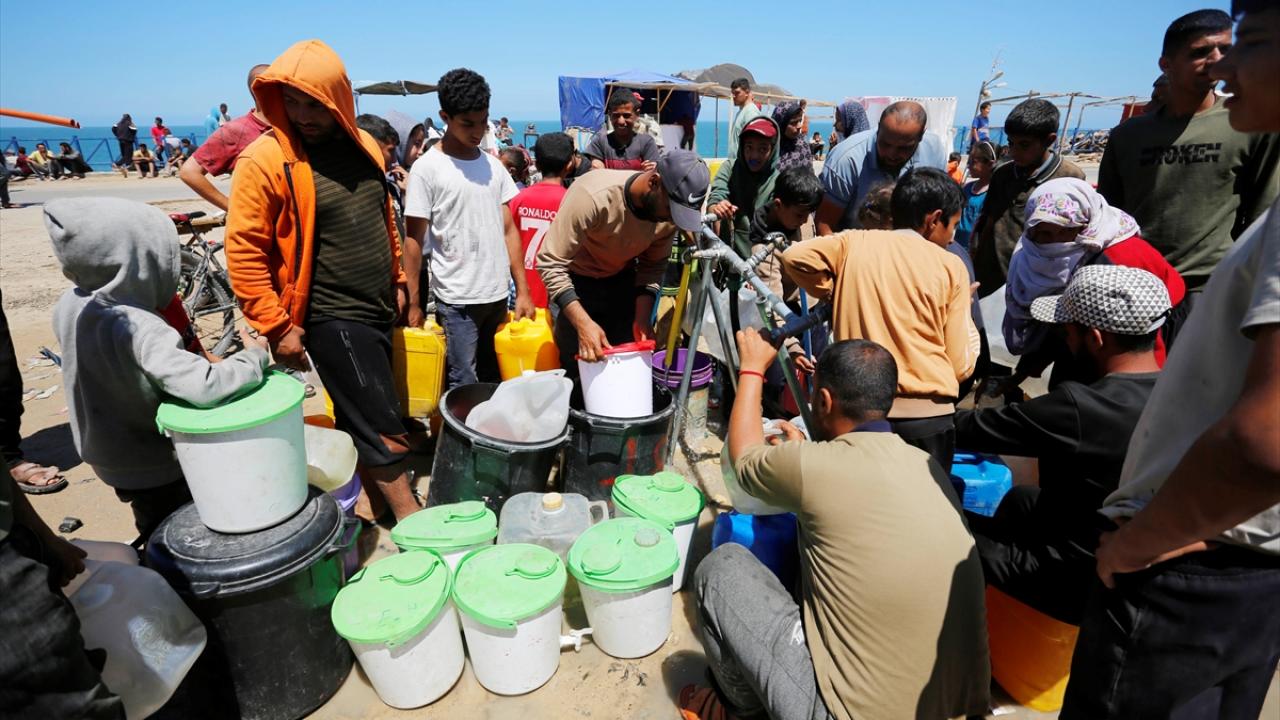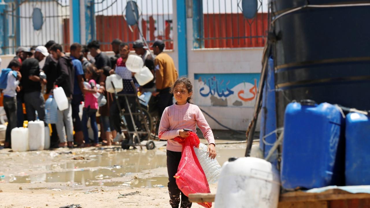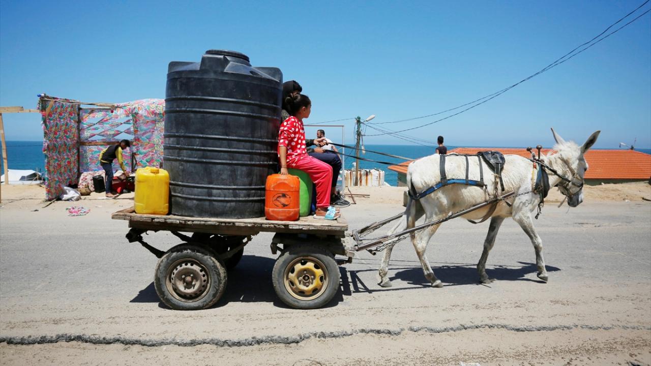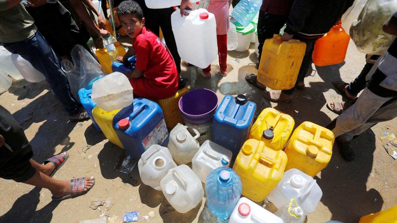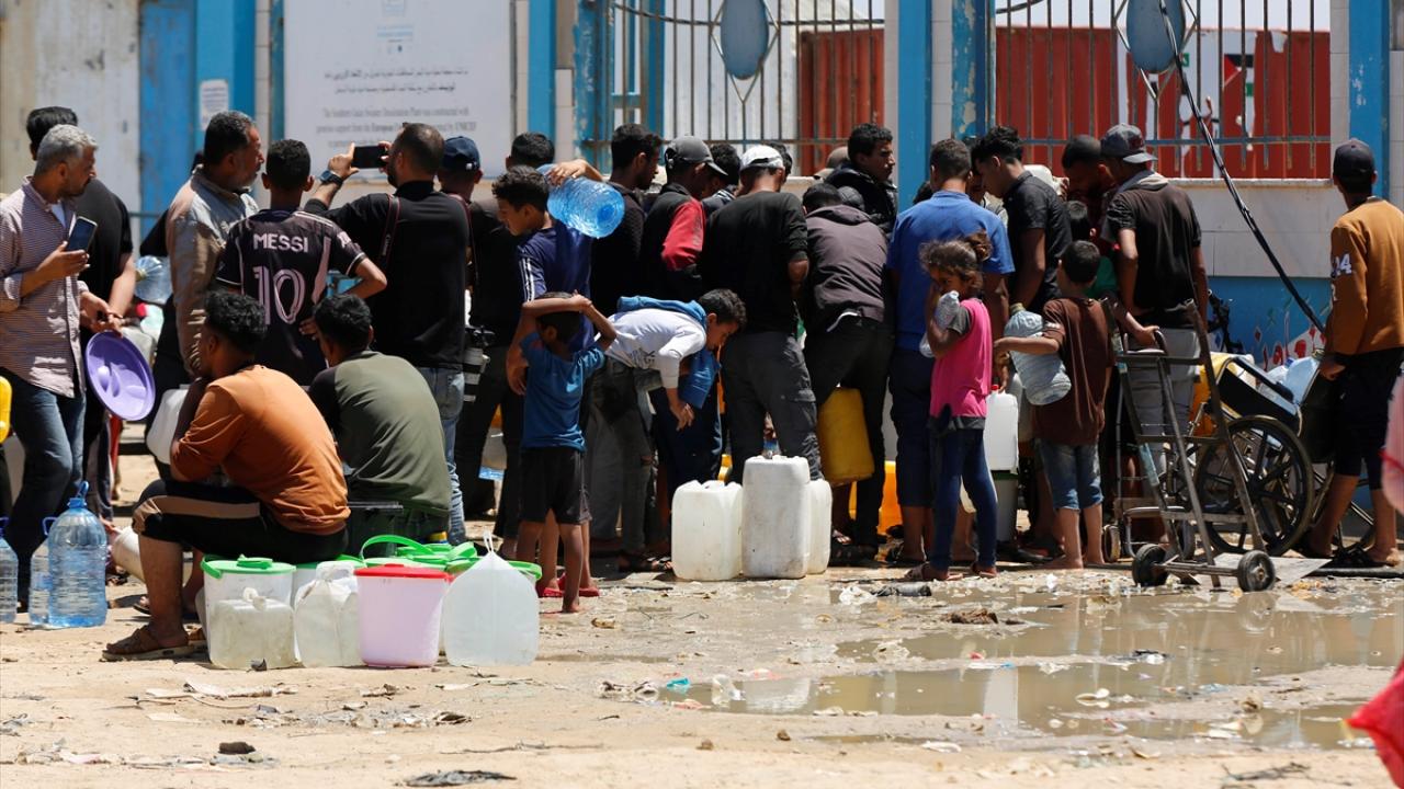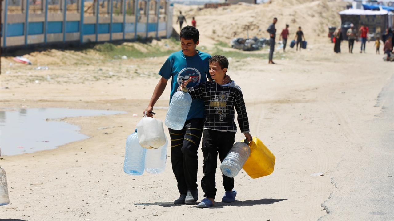 Refah`ın doğusundaki mahallelerinde göç ederek Deyr Balah kentine gelen Filistinliler, ailelerine su temin etmek için sıra bekledi.