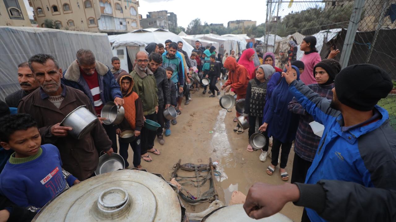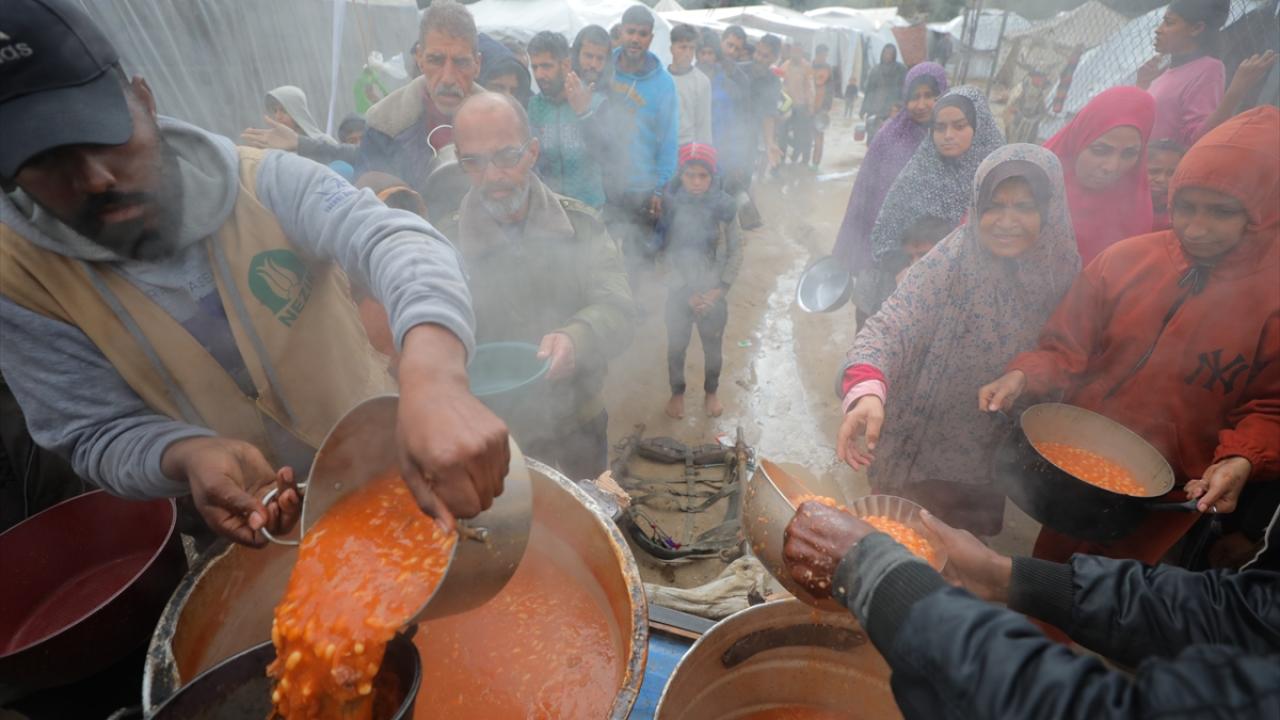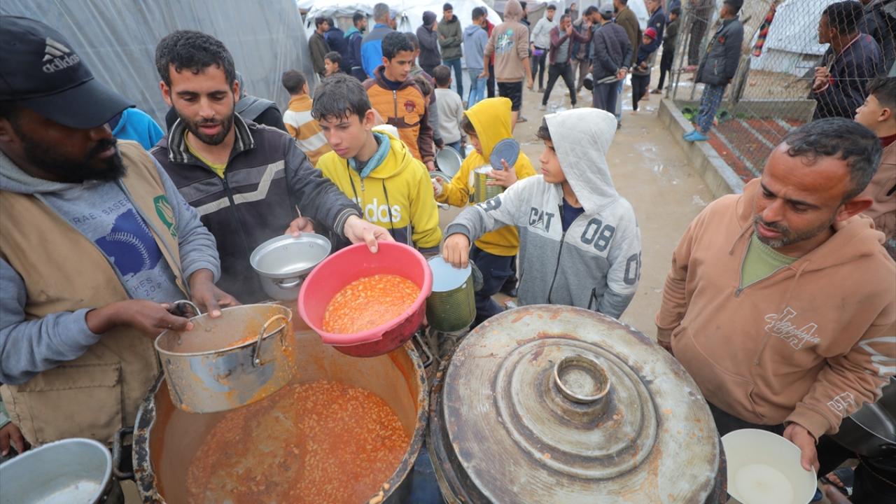 Hamas ve İsrail arasında mutabakata varılan Gazze'de ateşkesin yürürlüğe girmesinin ardından, Gazze Şeridi'nin orta kesiminde yer alan Nuseyrat Mülteci Kampı'ndaki Filistinlilere, hayır kurumları tarafından yemek dağıtımı yapıldı.