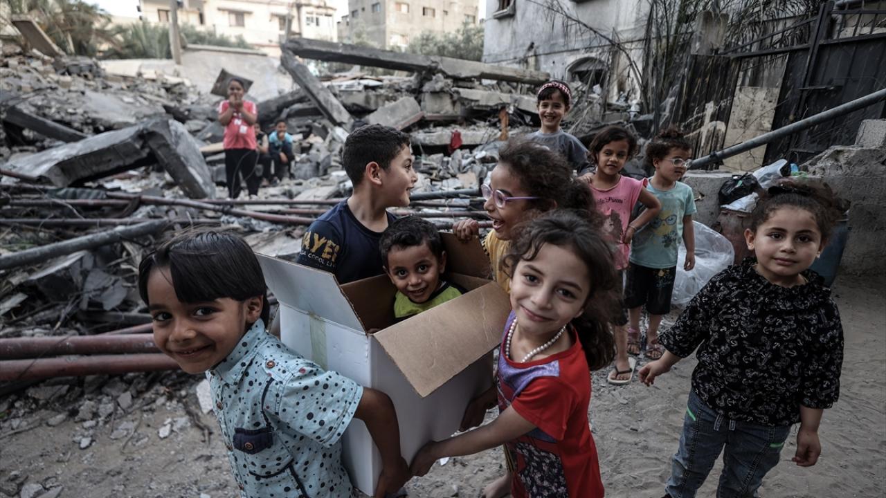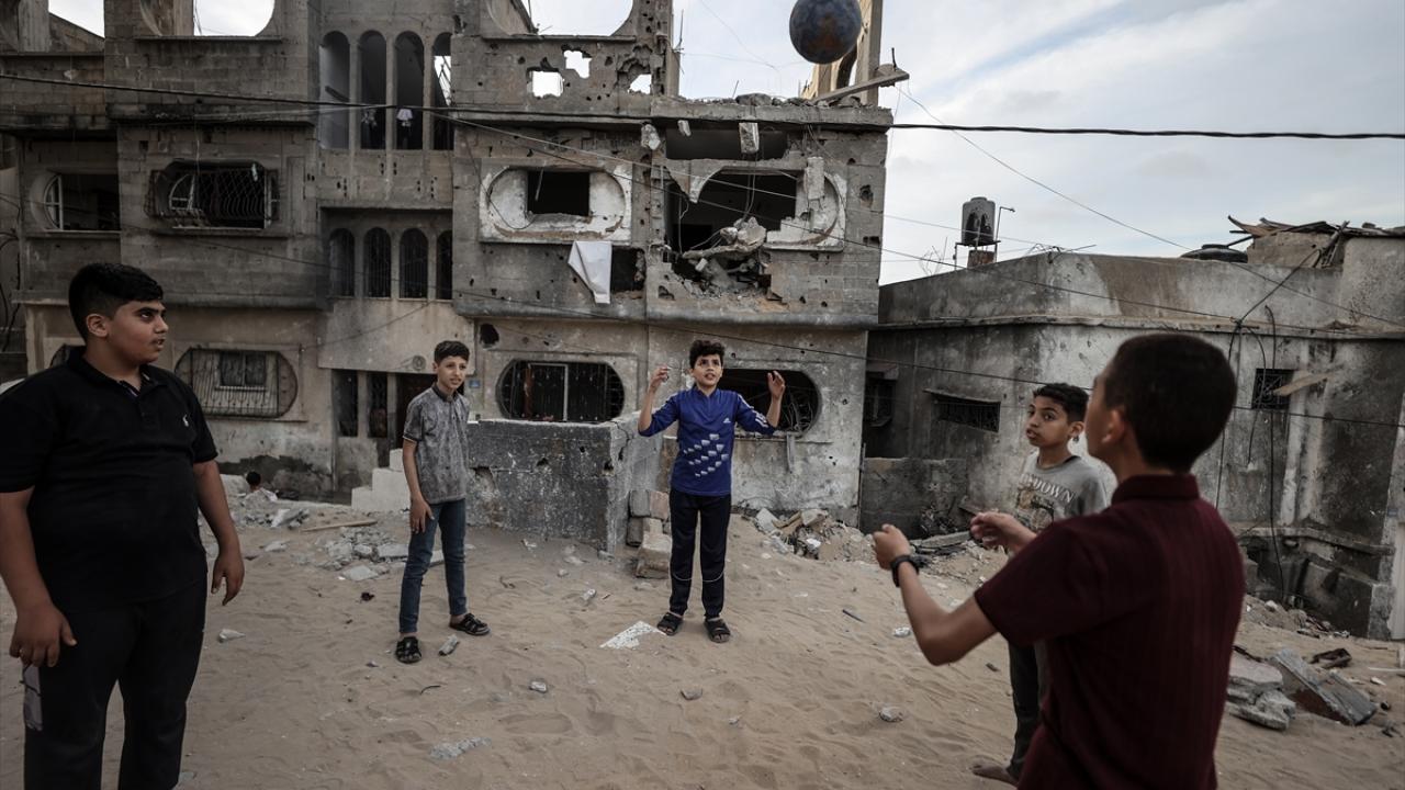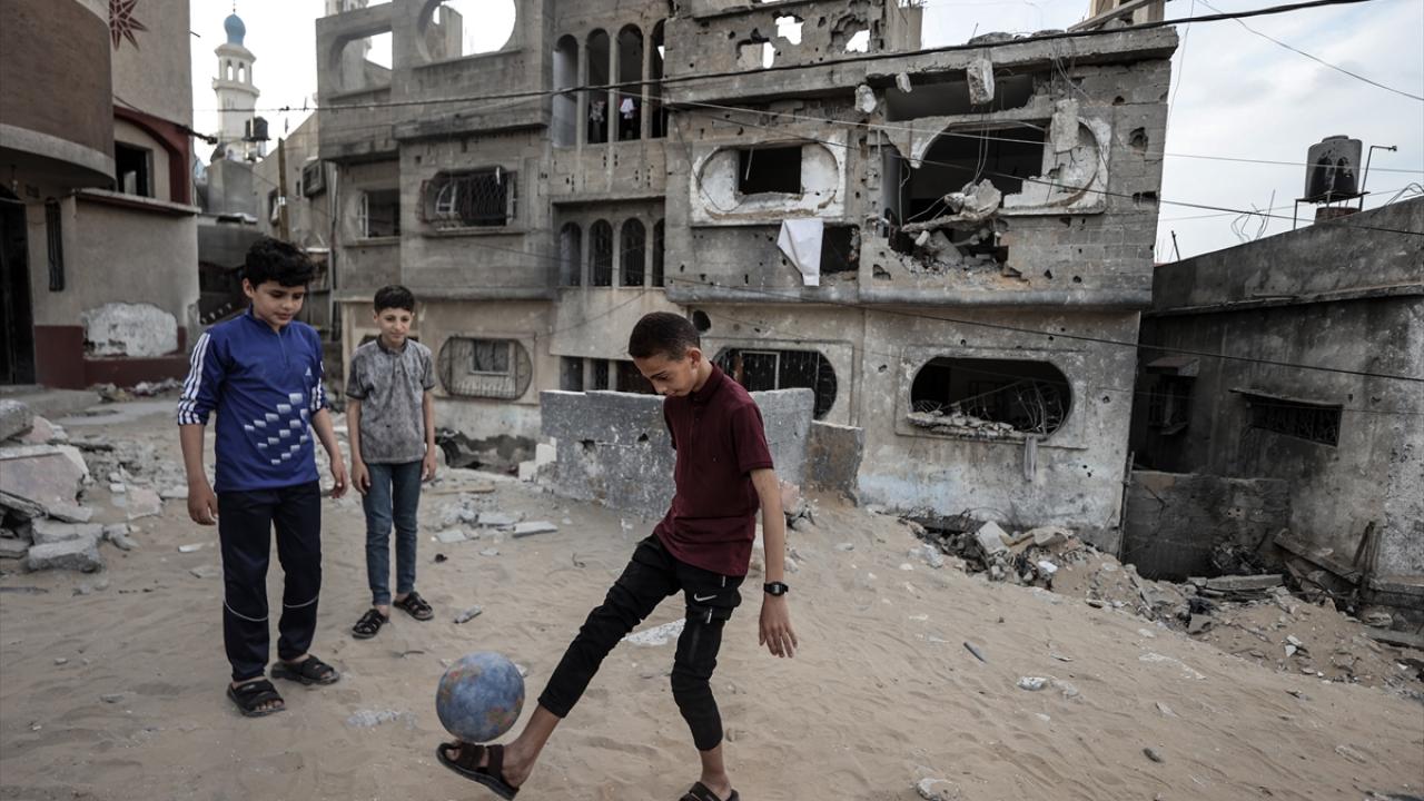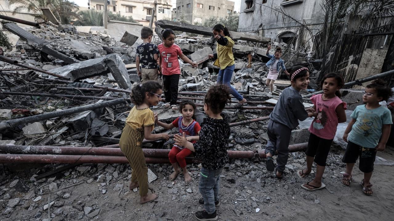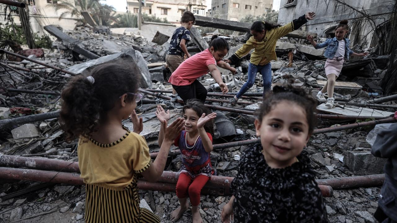 Savaş mağduru Gazzeli çocuklar, yıkılan evlerinin enkazı arasında oyun oynayarak eğlenmeye çalışıyor.