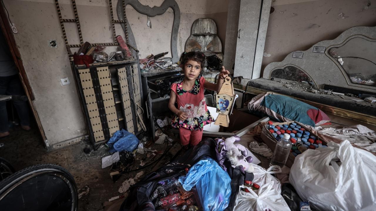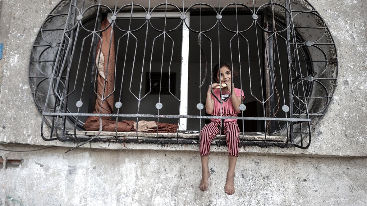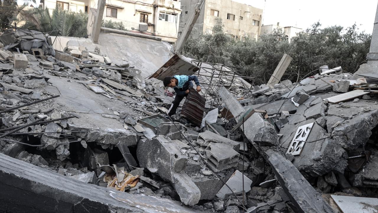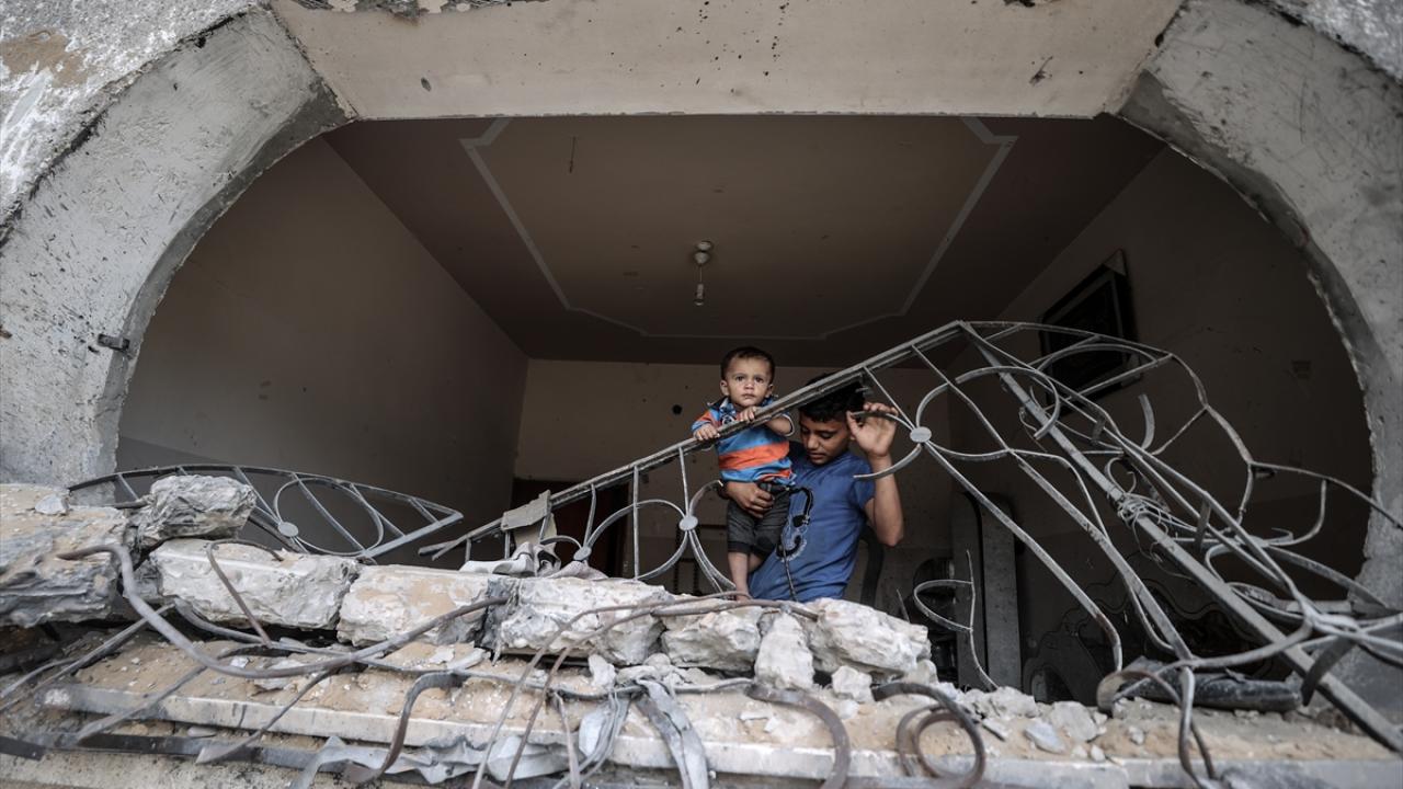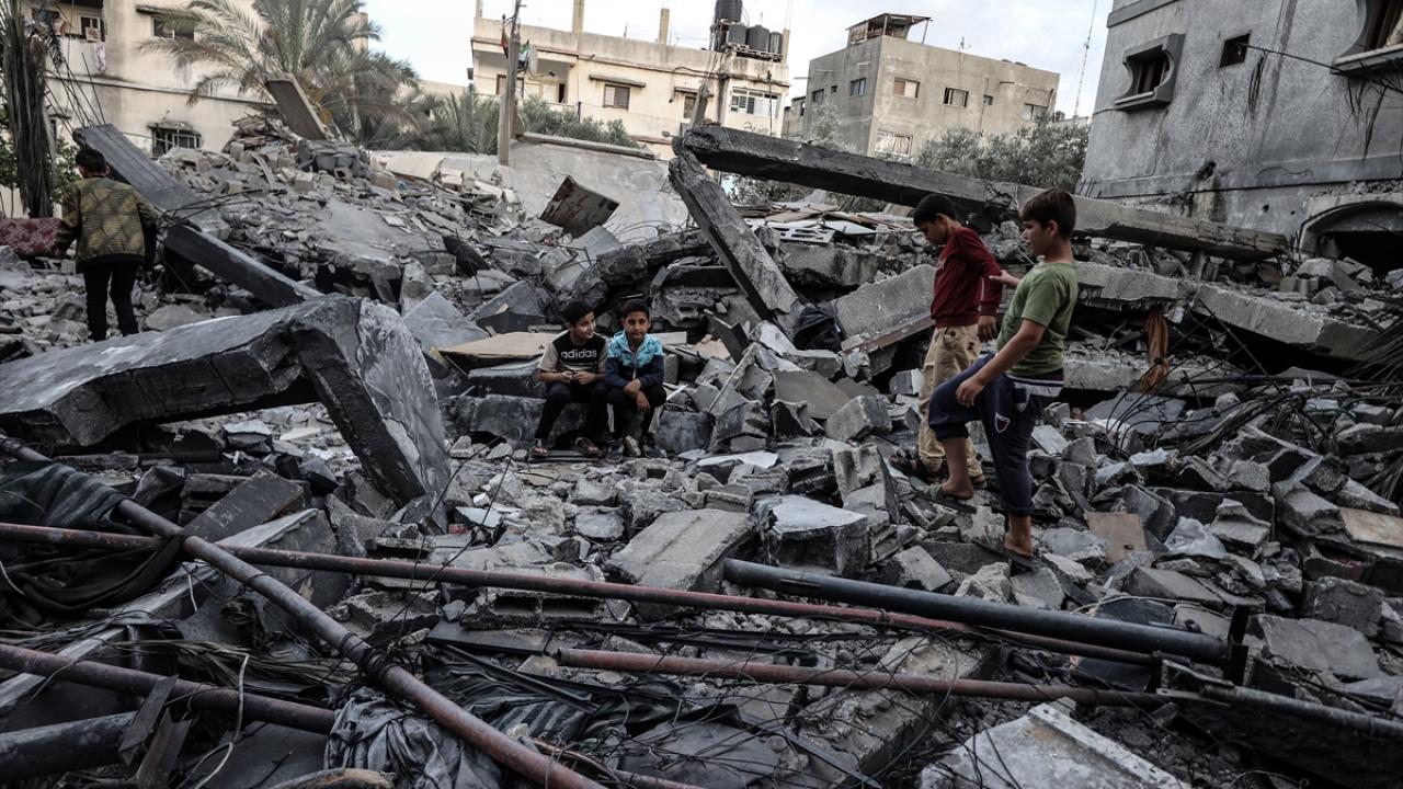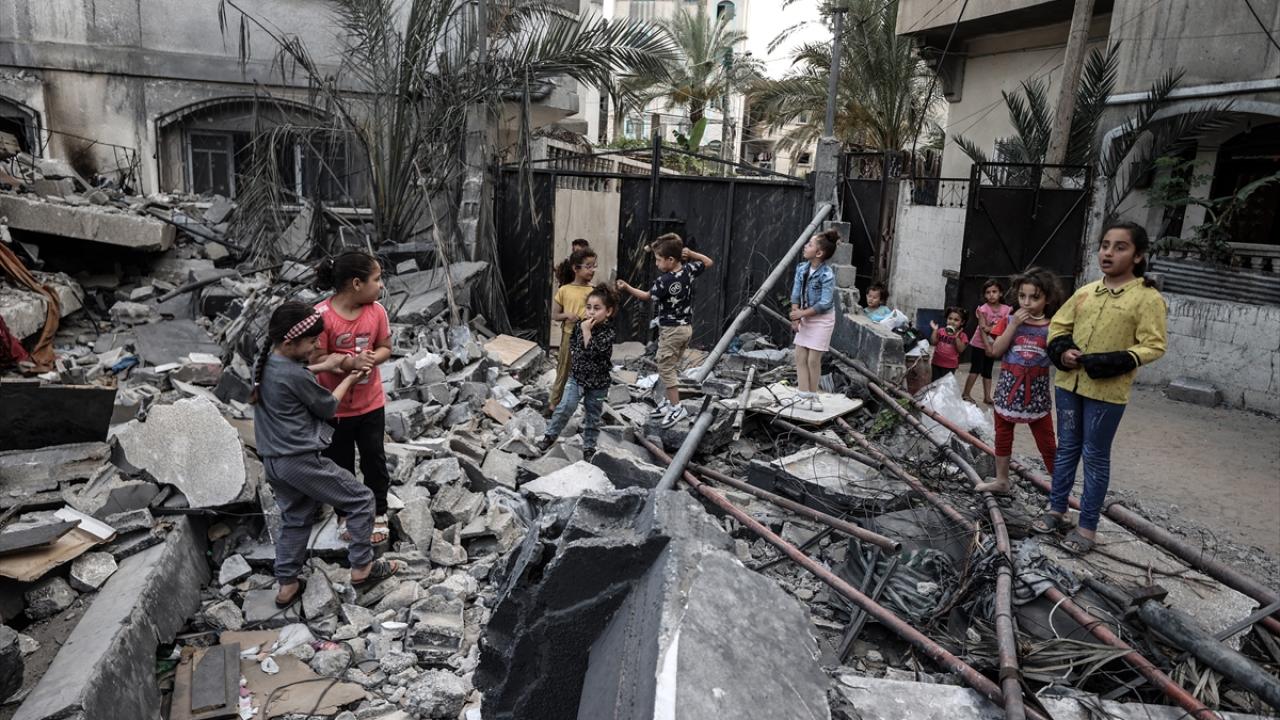 Savaş mağduru Gazzeli çocuklar, yıkılan evlerinin enkazı arasında oyun oynayarak eğlenmeye çalışıyor.