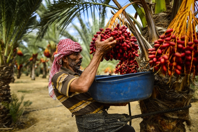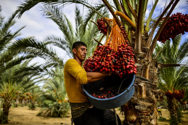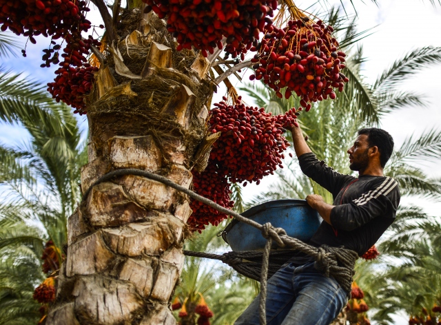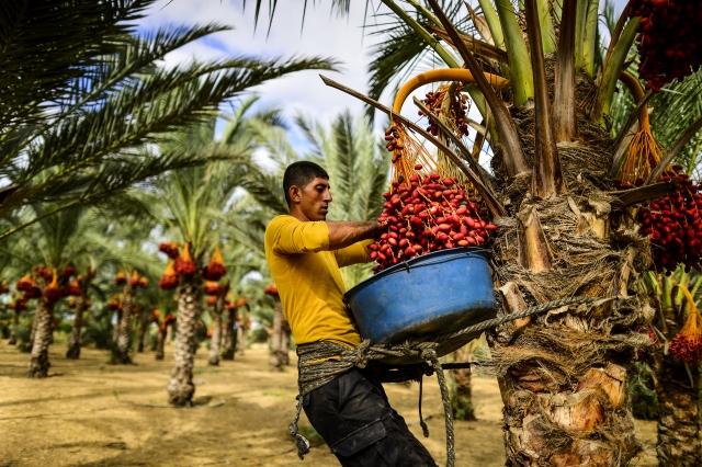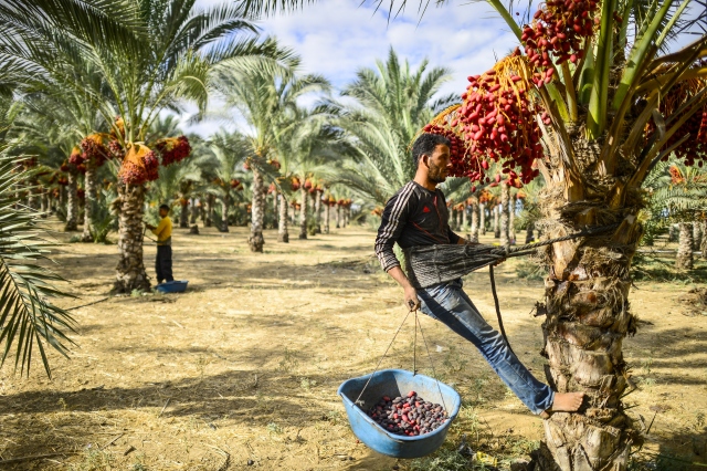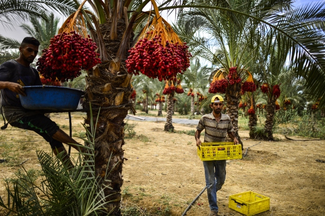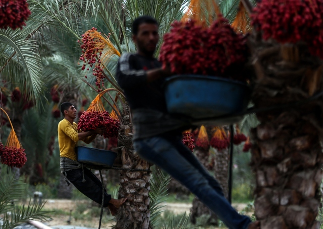 Gazze Şeridi'nin Deir el-Balah kentinde yaşayan Filistinli çiftçiler, hurma hasadına başladı. Dallarından toplanıp kovalara doldurulan hurmalar gerekli işlemlerin ardından kasa ve ambalajlara konularak pazarda satışa sunuluyor. Hurma toplayıcıları bellerine bağladıkları ip yardımıyla ağaç üstünde kalarak hurmaları topluyorlar.