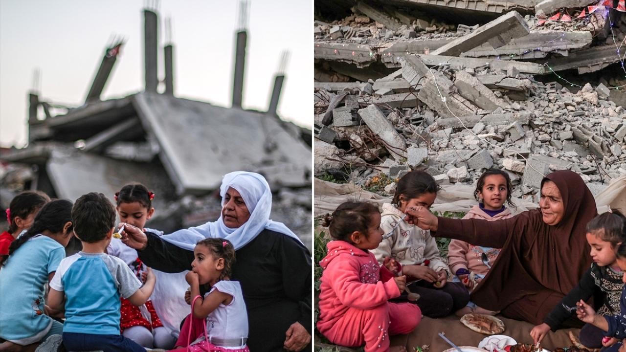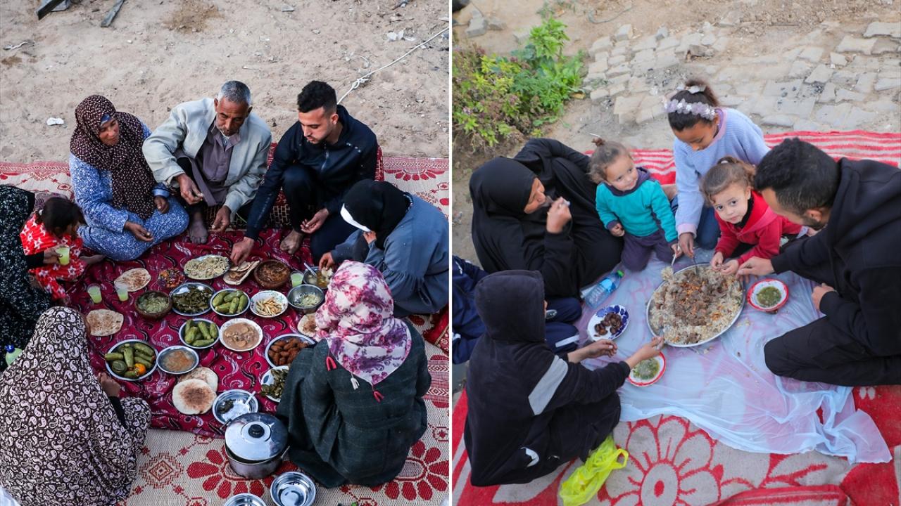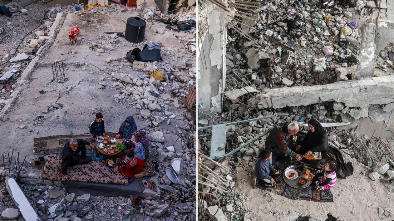 2024 yılında ramazanın ilk gününde Gazze`nin orta kesimindeki Deyr el-Belah`ta yaşayan Filistinli Halid el-Naci, ailesiyle beraber İsrail saldırılarında yıkılan evinin enkazında iftar yaparken; 2026`da Filistinli Nasır ailesi de Bureyc Mülteci Kampı`ndaki Ebu Hilve Okulu`nun yıkıntıları arasında iftar sofrası kuruyor.