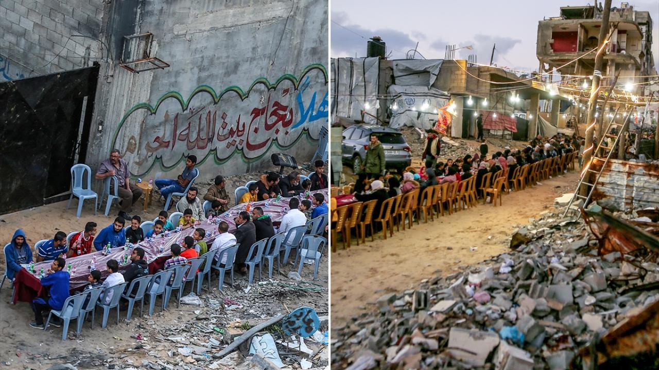 Filistinliler 2025 yılında ramazanın ilk gününde Gazze`nin güneyindeki Refah`ta enkazın ortasında oruçlarını açarken bu yıl da bölgenin kuzeyindeki Nafak bölgesinde yerinden edilenler için düzenlenen iftar programında bir araya geliyor.