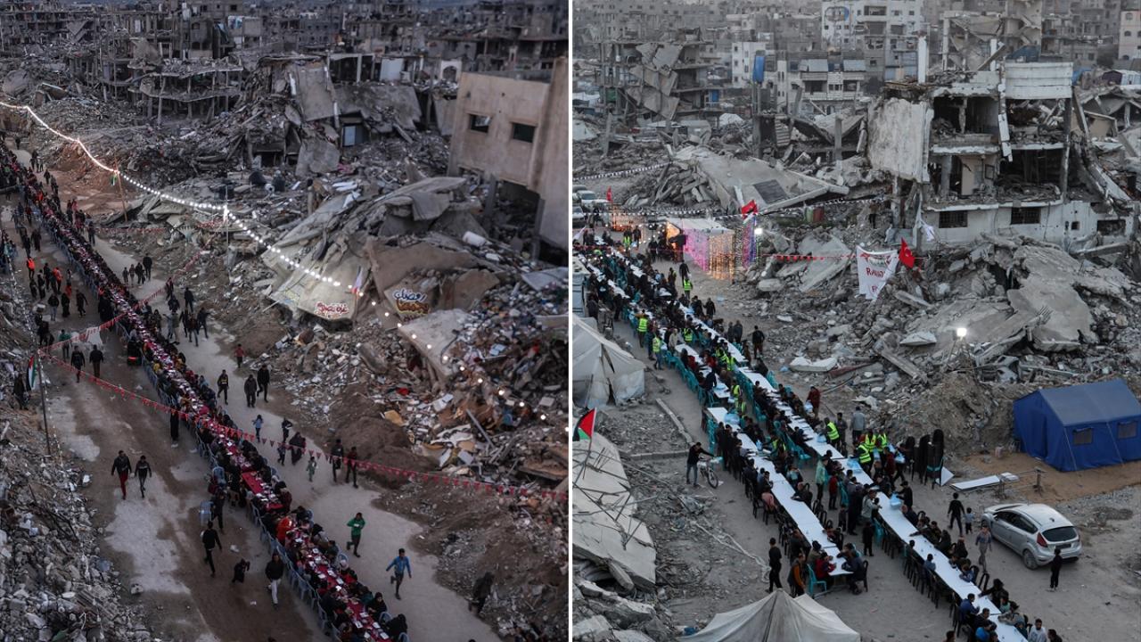 2019`da İsrail saldırılarında yıkılan evlerin molozları arasında verilen iftar yemeği ile yıllar sonra Gazze`nin kuzeyindeki Muhabarat bölgesinde yerinden edilmiş Filistinliler için kurulan iftar sofraları, benzer bir tabloyu yansıtıyor.