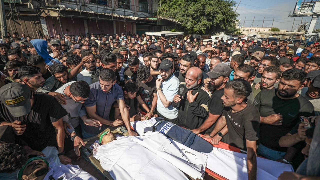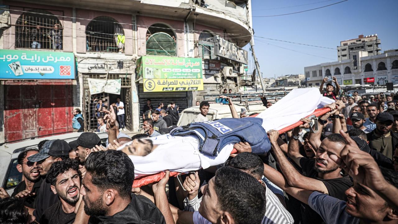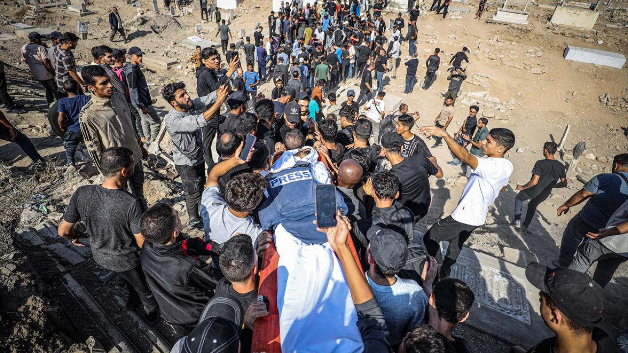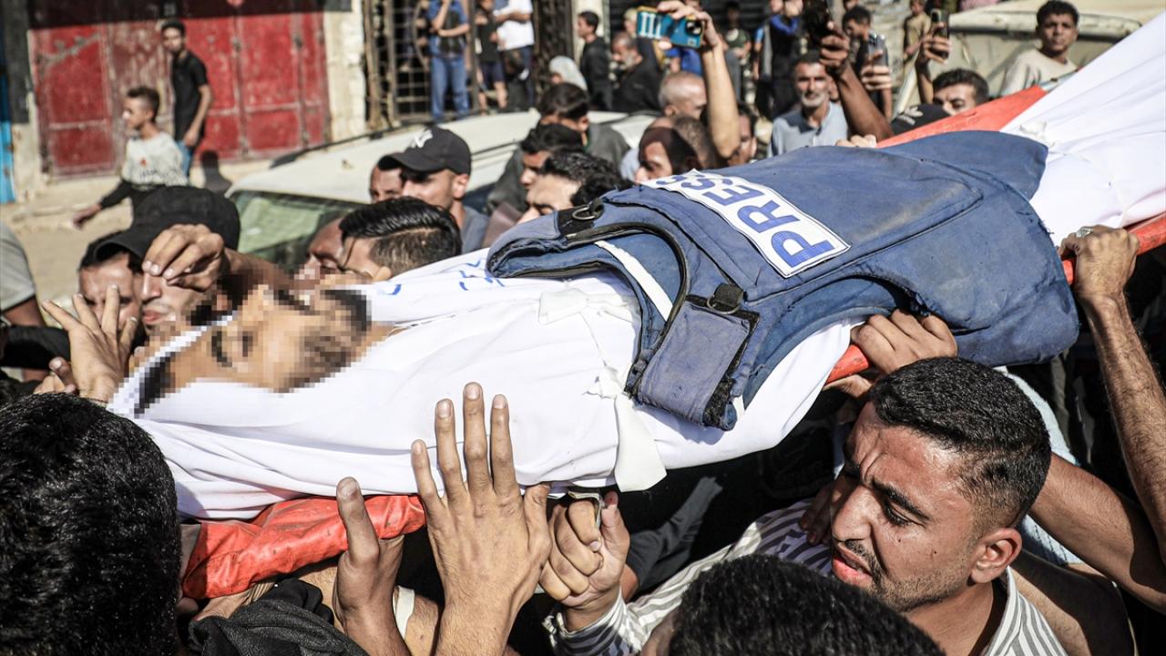 Filistinli gazeteci Caferavi`nin "basın" yazılı çelik yelek giyimli naaşının Gazze kentindeki El-Ehli Baptist Hastanesi`ne götürüldüğü görüntüler sosyal medyada paylaşıldı.